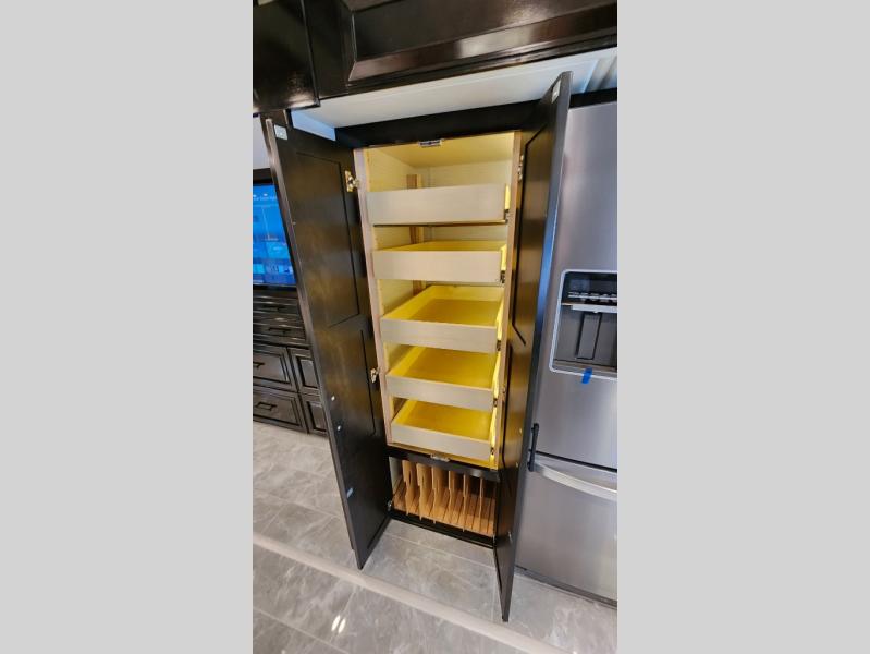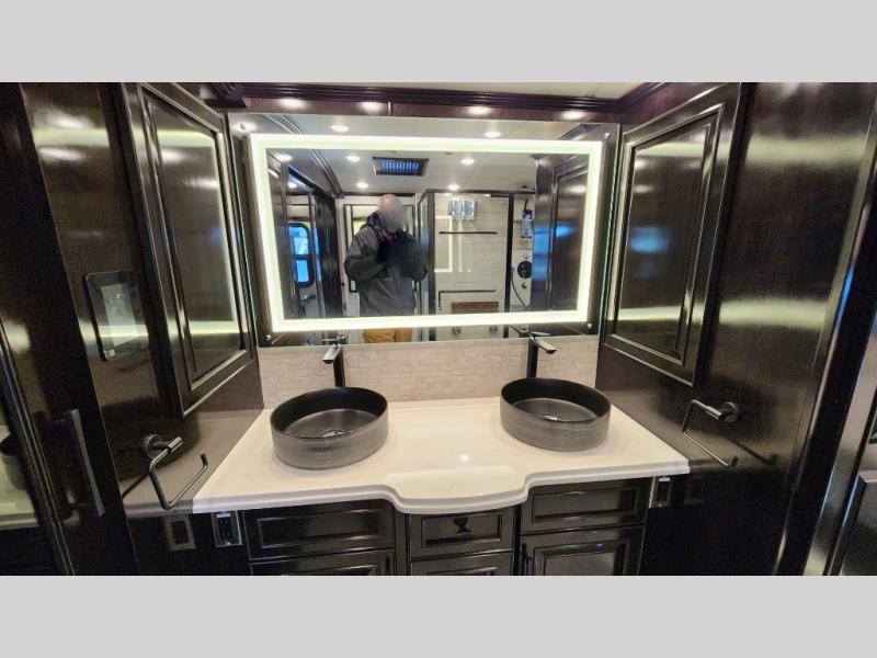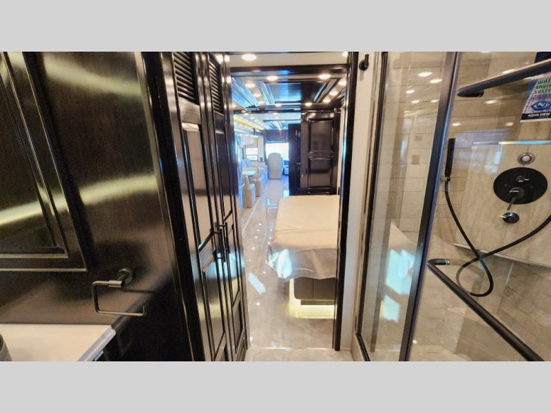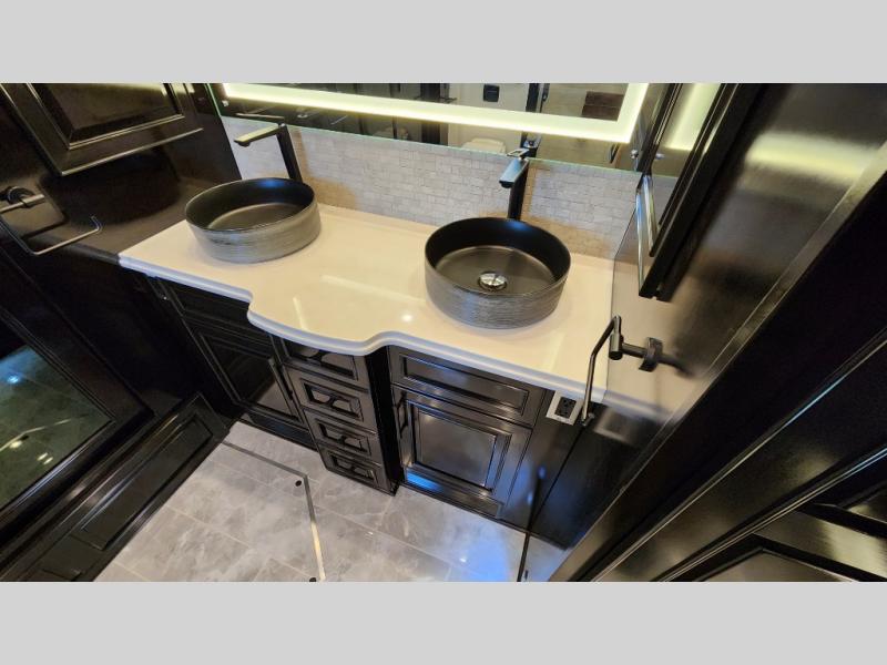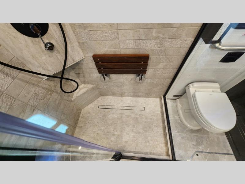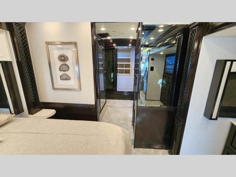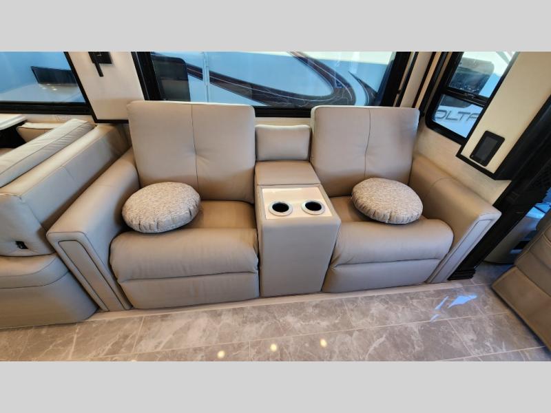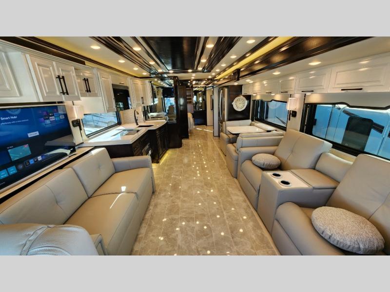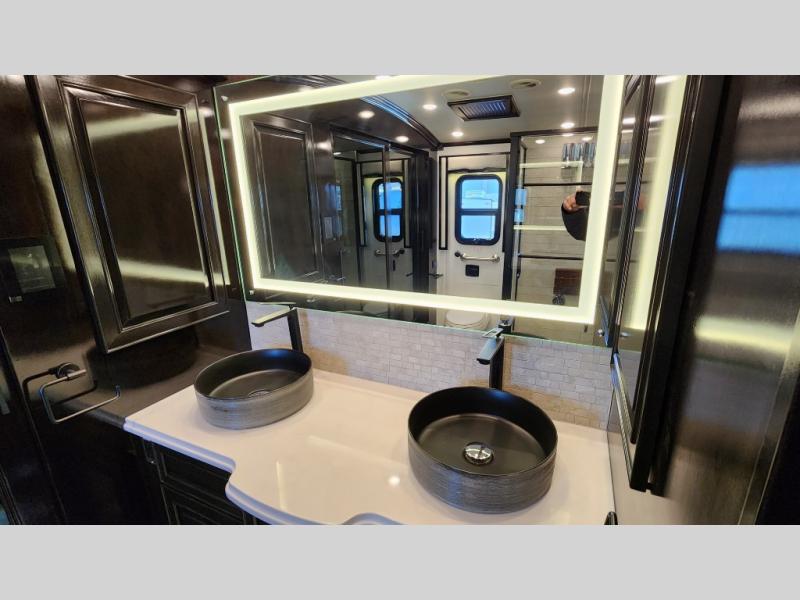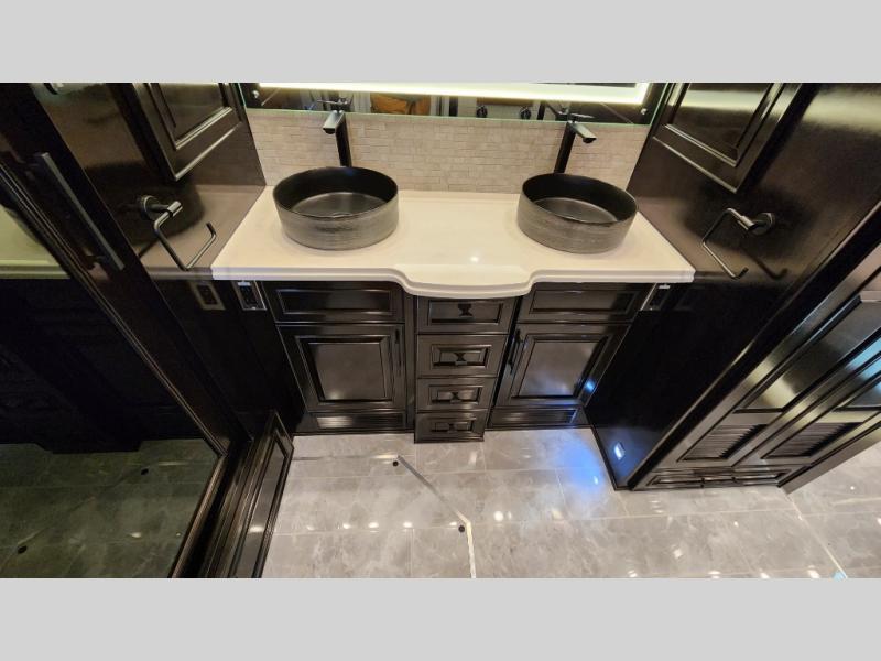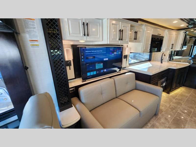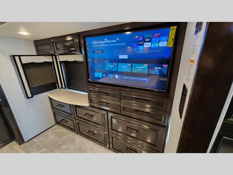 The London Aire Class A diesel motorhome by Newmar starts with a Freightliner chassis with a tag axle and 605 HP, tire pressure monitoring on the tag axle chassis, aluminum wheels, and an electronic chassis information center in dash. There is also 5/8" foam insulation laminated in sidewalls and ceiling to ensure years of use. You will stay comfortable with the three 15M Penguin heat pump central air conditioners with remote control thermostat that will keep you warm during those cooler months. Each model includes super polished solid surface countertops, hardwood cabinets with raised panel doors, and many more luxuries. Some of the conveniences you are sure to appreciate are the central vacuum with a tool kit, the Aqua Miser shower system, and the air leveling control system for hassle-free setup.