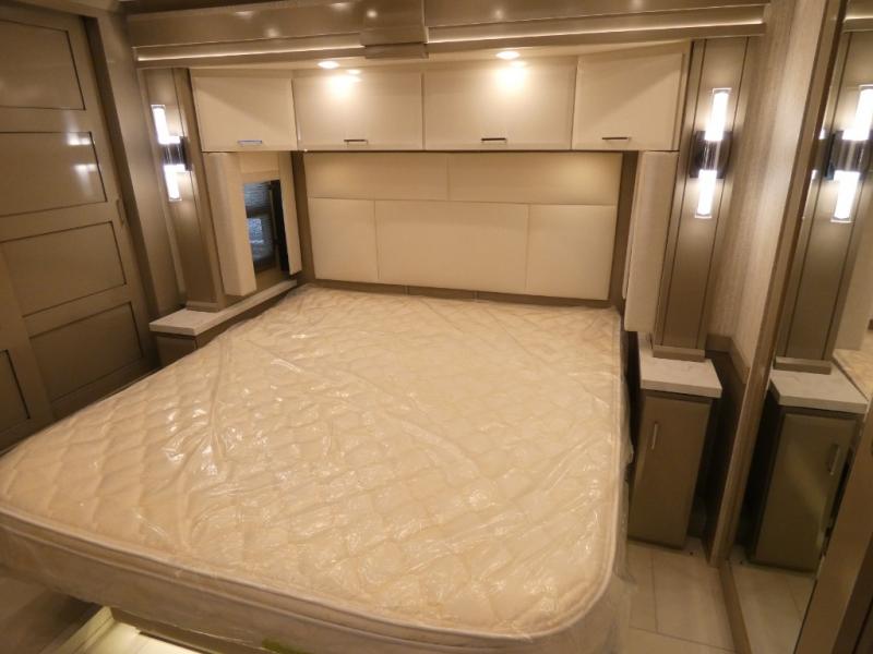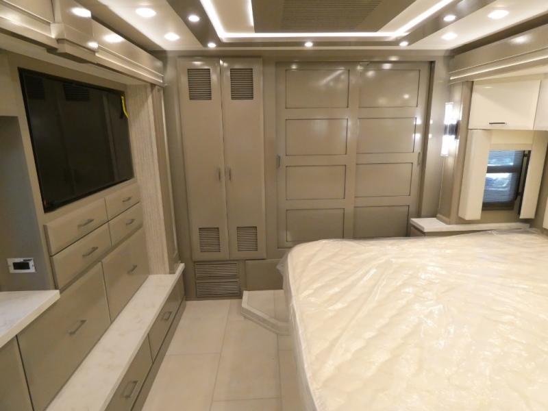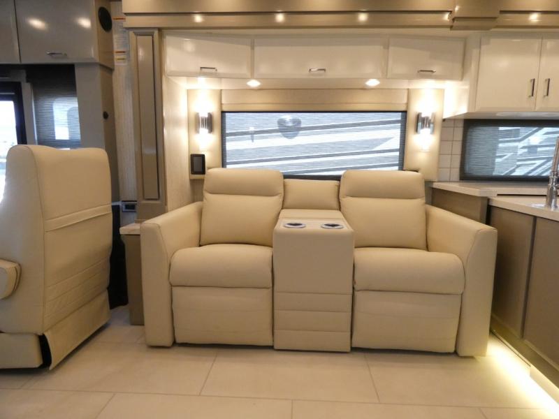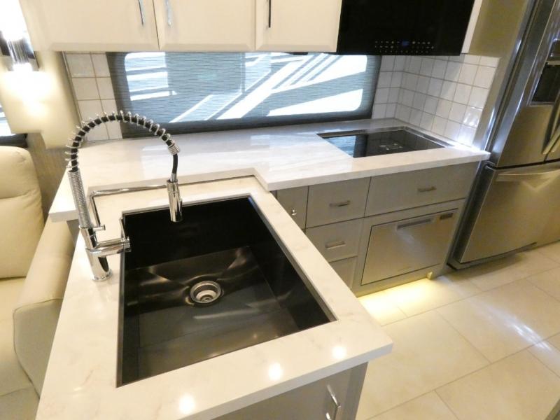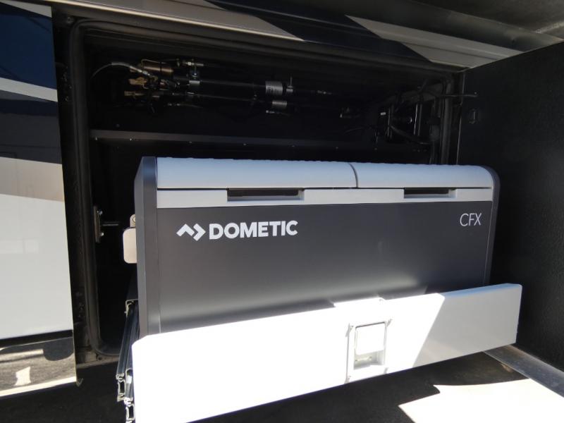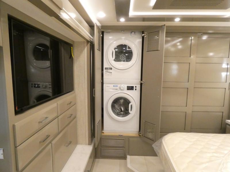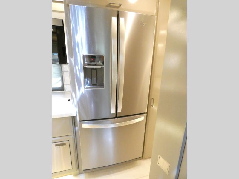 You will feel right at home in this motorhome! The rear private bedroom has a king bed slide for a good night's rest, a wardrobe with sliding doors, a Splendide washer and dryer for clean clothes throughout your entire trip, and even a bedroom safe behind the Samsung LED TV. Freshen up after a long day of traveling in the full bathroom with the 44" x 30" shower with a seat, plus there is an emergency exit door behind the toilet. The chef will have everything they need to prepare delicious home cooked meals including a stainless steel 30" convection microwave with air fryer feature and a Whirlpool 19.7 cu. ft. refrigerator to keep the perishables fresh.