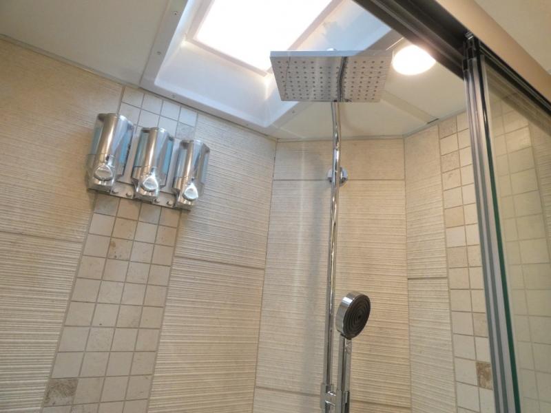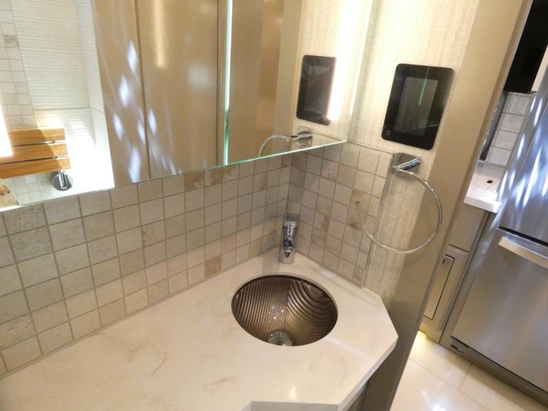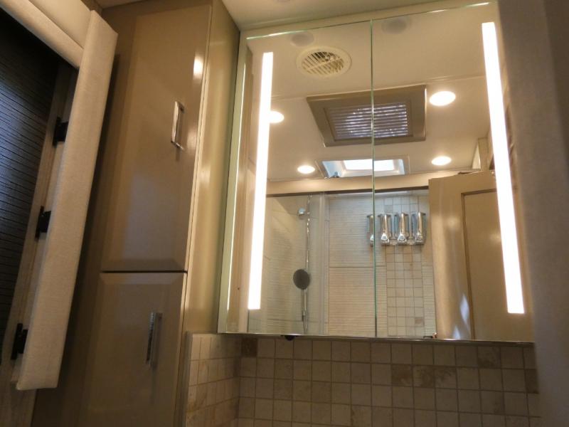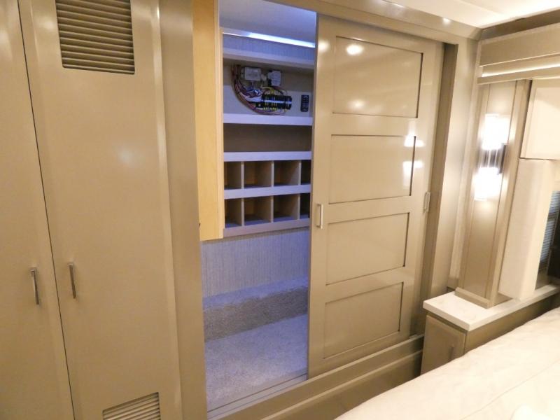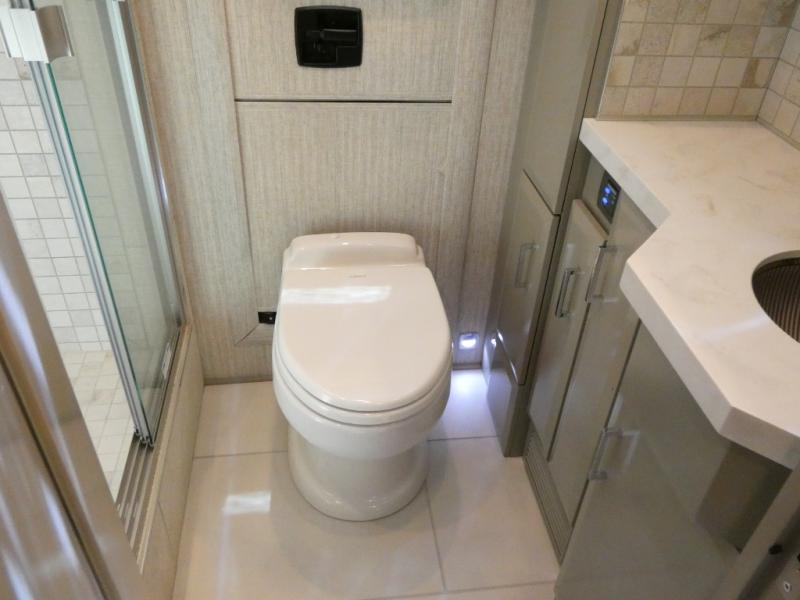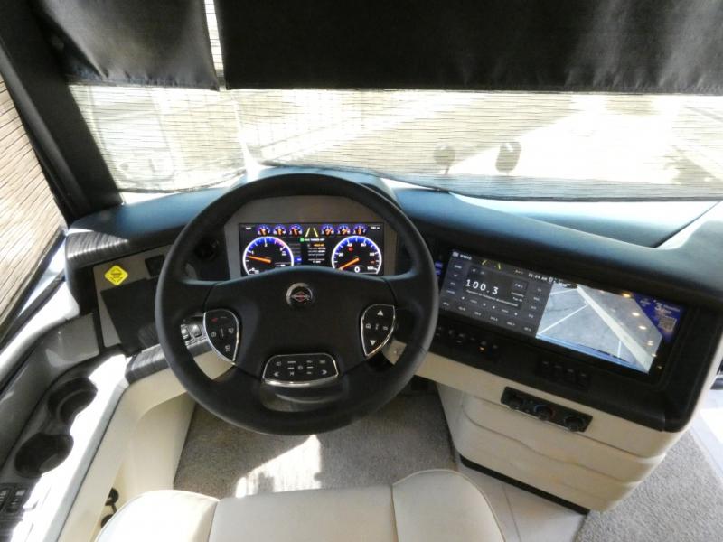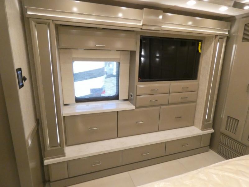 You will feel right at home in this motorhome! The rear private bedroom has a king bed slide for a good night's rest, a wardrobe with sliding doors, a Splendide washer and dryer for clean clothes throughout your entire trip, and even a bedroom safe behind the Samsung LED TV. Freshen up after a long day of traveling in the full bathroom with the 44" x 30" shower with a seat, plus there is an emergency exit door behind the toilet. The chef will have everything they need to prepare delicious home cooked meals including a stainless steel 30" convection microwave with air fryer feature and a Whirlpool 19.7 cu. ft. refrigerator to keep the perishables fresh.