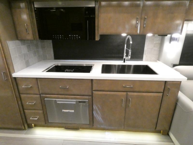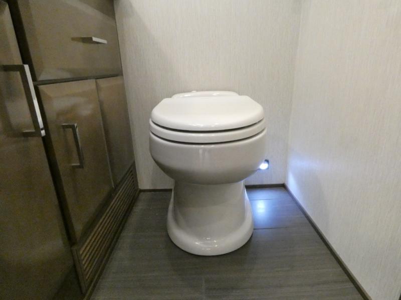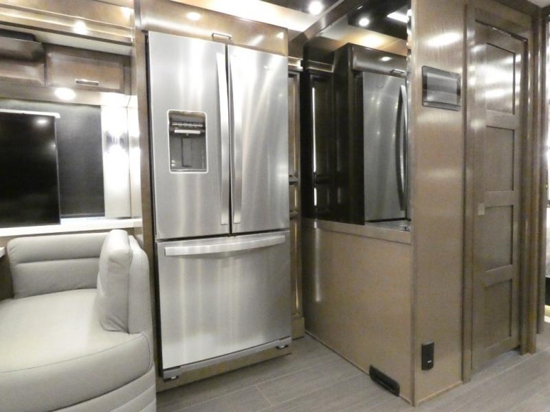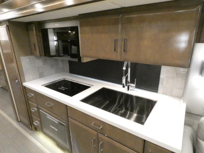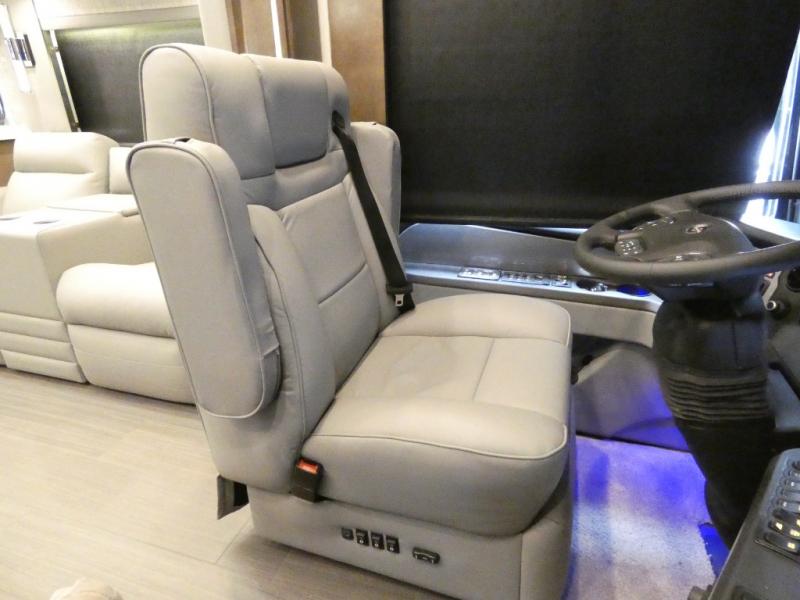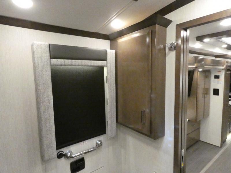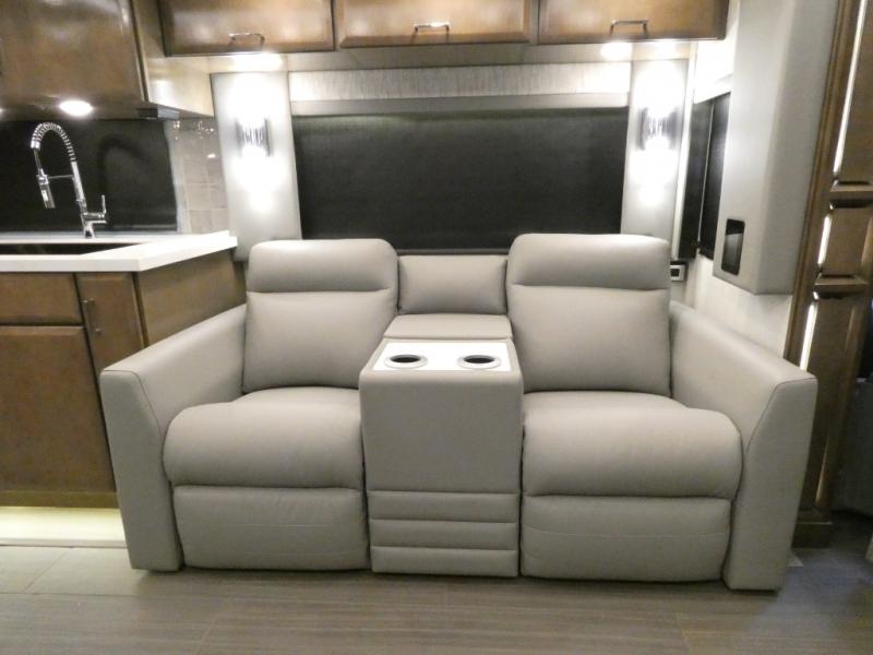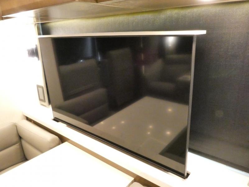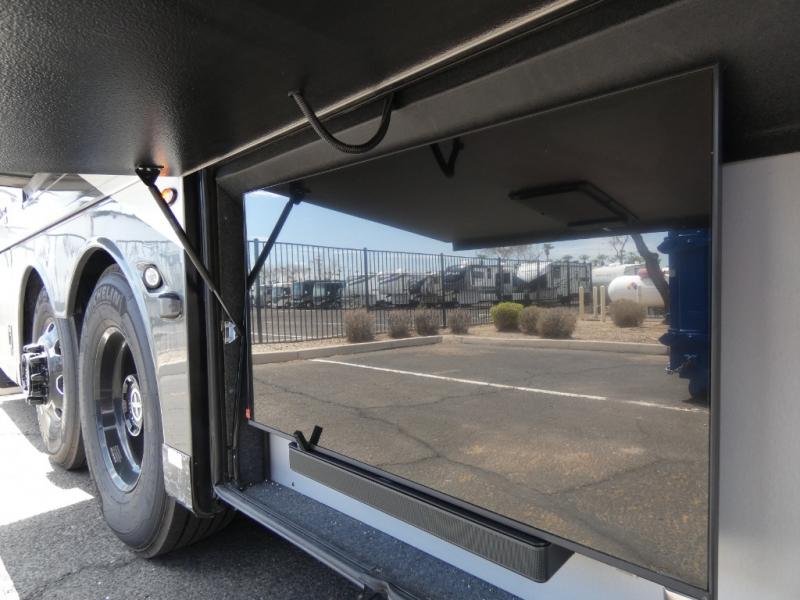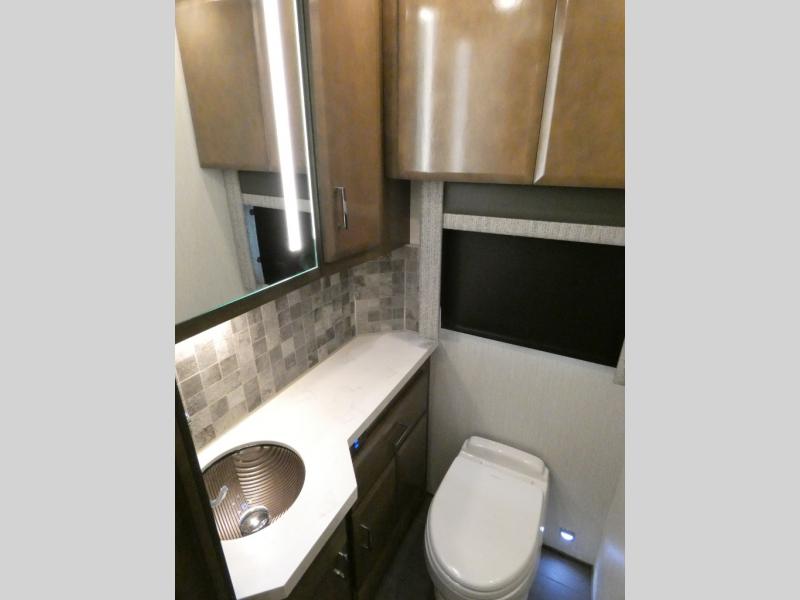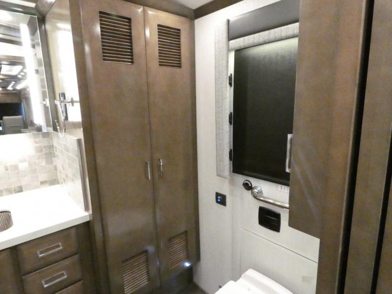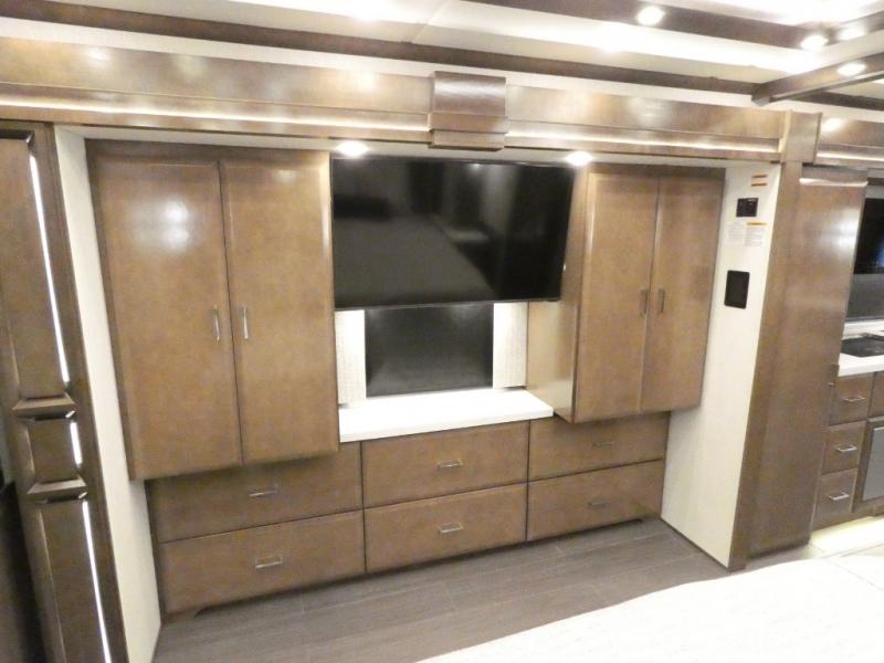 This motorhome has everything you need for a comfortable road trip! The master suite has a king bed slide for a good night's rest across from a dresser with a Samsung LED TV and shirt wardrobes on either side. Attached to the bedroom is your very own full rear bathroom which has a 42" x 35" angled shower next to a wardrobe with drawers and a Splendide washer and dryer next to the vanity sink. The chef will have everything they need to prepare delicious home cooked meals including a stainless steel 30" convection microwave with air fryer feature and a Whirlpool 19.7 cu. ft. refrigerator to keep the perishables fresh, plus the half bathroom is by the kitchen for quick bathroom breaks while cooking. Enjoy your meals at the Euro booth dinette (non-sleeper) and relax on the 74" hide-a-bed sofa while watching your favorite movies on the Samsung LED TV on power lift!