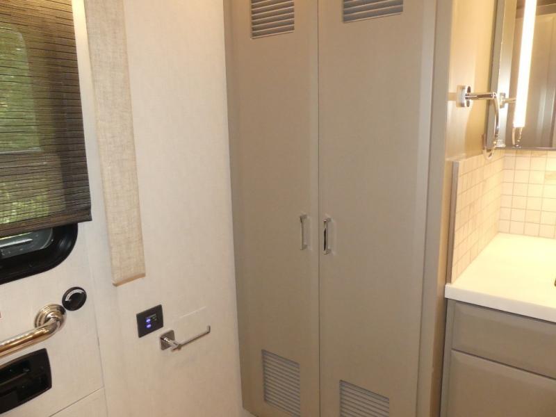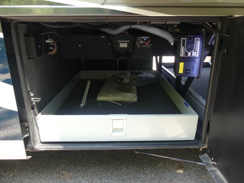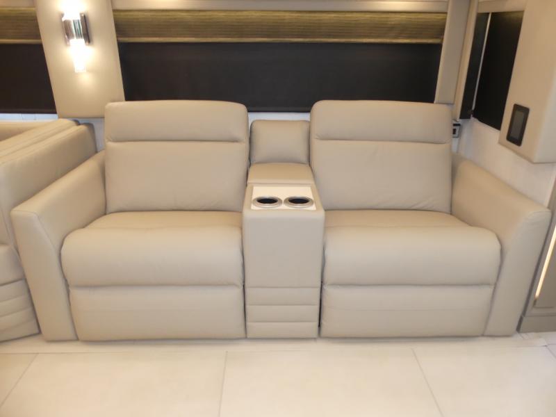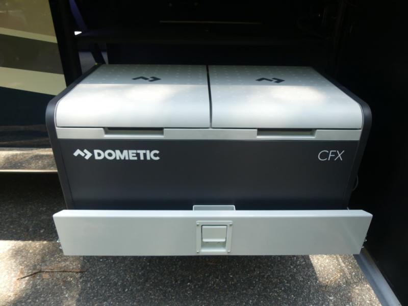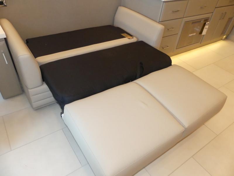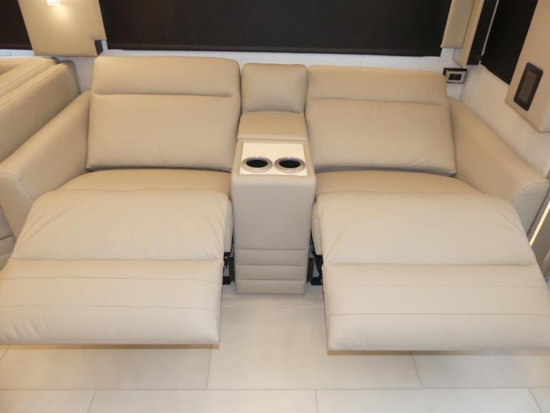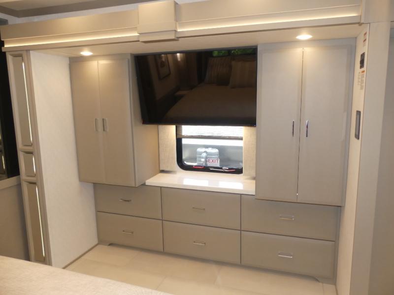 Don't pass up your opportunity to travel in pure luxury with this motorhome! The master suite has a king bed slide for a good night's rest across from a dresser with a Samsung LED TV and shirt wardrobes on either side. Attached to the bedroom is your very own full rear bathroom which has a 40" x 32" shower with a seat next to a linen closet and wardrobe, as well as a Splendide two-piece washer and dryer next to the vanity sink. The chef will have everything they need to prepare delicious home cooked meals including a cabinet pull-out, a stainless steel 30" convection microwave with air fryer feature and a Whirlpool 19.7 cu. ft. refrigerator to keep the perishables fresh, plus the half bathroom is by the kitchen for quick bathroom breaks while cooking. Enjoy your meals at the dinette and relax on either the theater seats or the 62" jackknife sofa while watching your favorite movies on the Samsung LED TV on power lift!