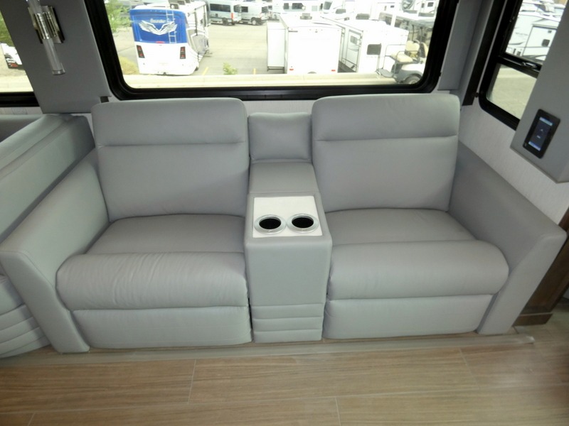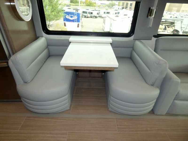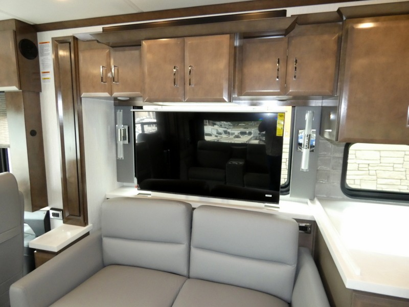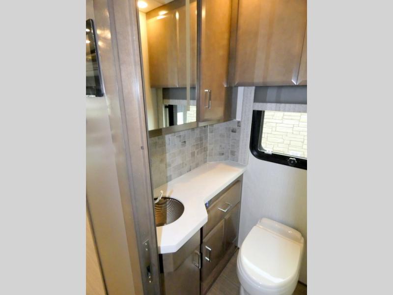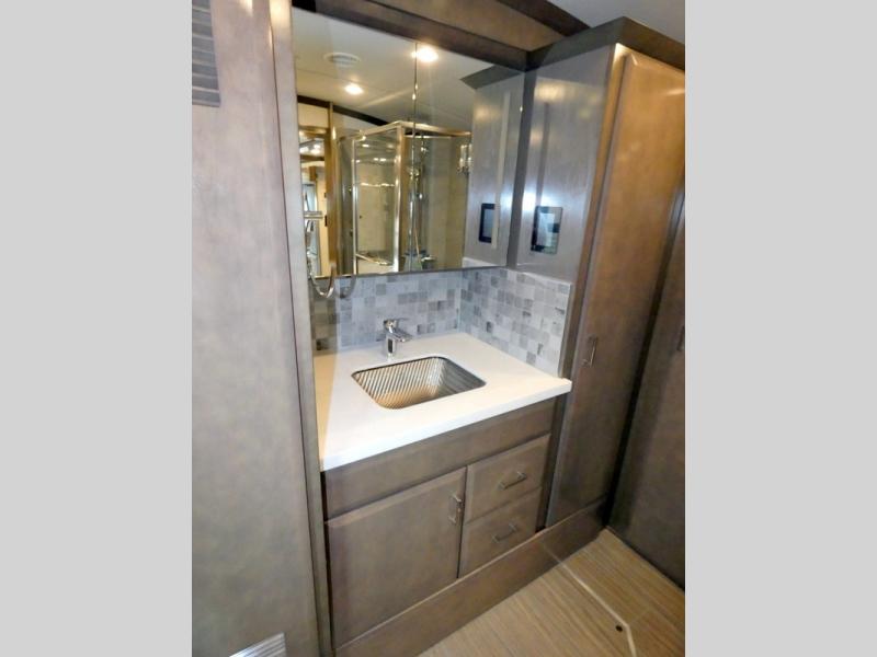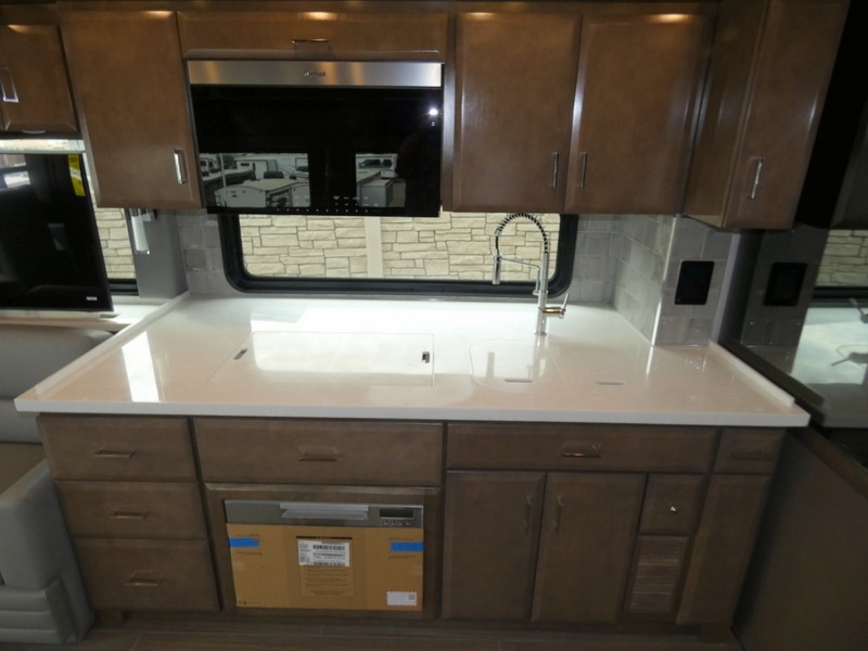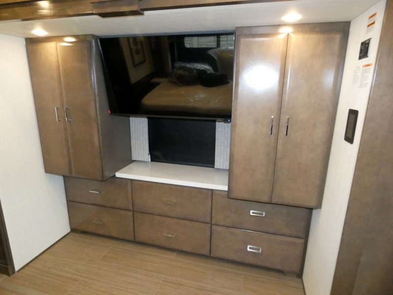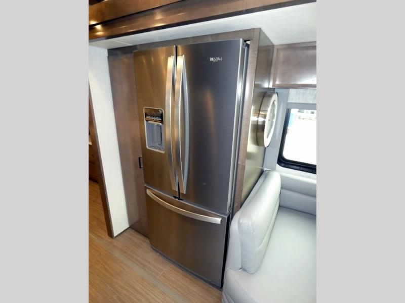 Don't pass up your opportunity to travel in pure luxury with this motorhome! The master suite has a king bed slide for a good night's rest across from a dresser with a Samsung LED TV and shirt wardrobes on either side. Attached to the bedroom is your very own full rear bathroom which has a 40" x 32" shower with a seat next to a linen closet and wardrobe, as well as a Splendide two-piece washer and dryer next to the vanity sink. The chef will have everything they need to prepare delicious home cooked meals including a cabinet pull-out, a stainless steel 30" convection microwave with air fryer feature and a Whirlpool 19.7 cu. ft. refrigerator to keep the perishables fresh, plus the half bathroom is by the kitchen for quick bathroom breaks while cooking. Enjoy your meals at the hide-a-leaf dinette and relax on either the 84" hide-a-bed sofa or the 62" jackknife sofa while watching your favorite movies on the Samsung LED TV on power lift!