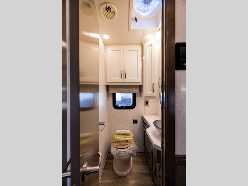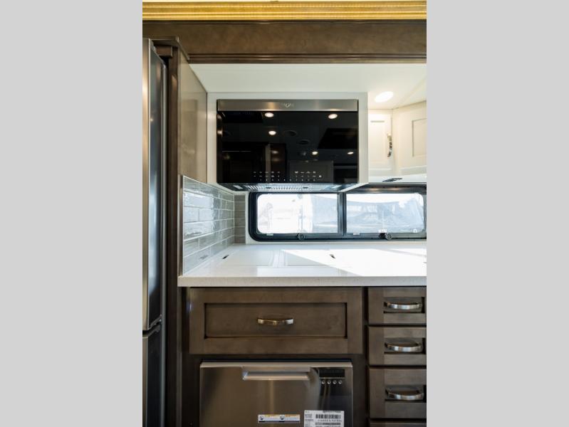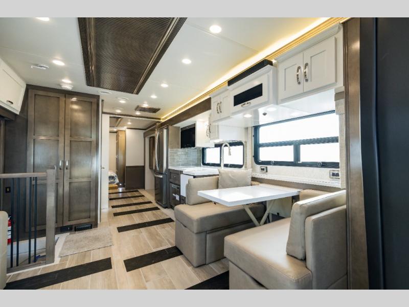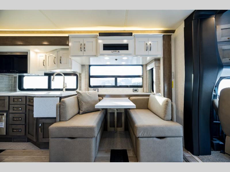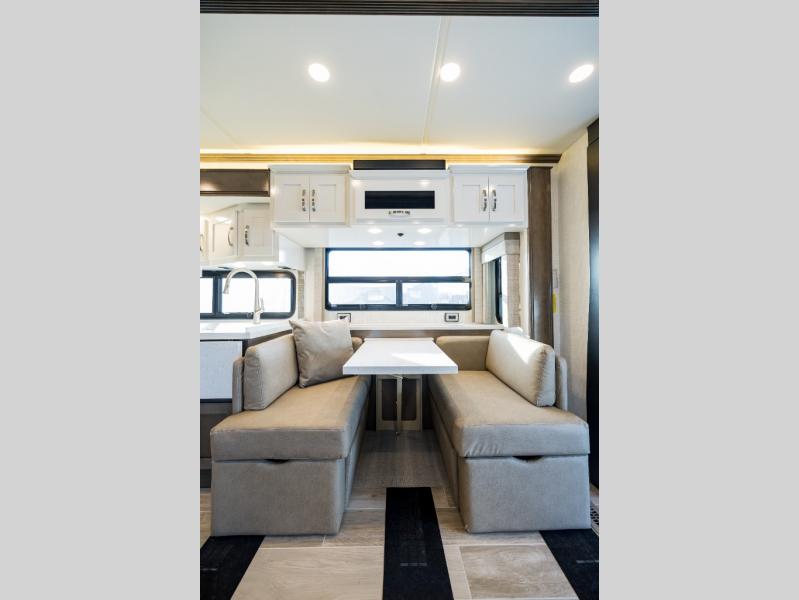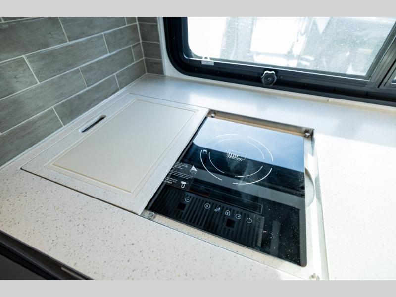 Traveling with friends and family is easier than ever in this coach with a bath and a half plus sleeping space for five to six! There is a hide-a-bed sofa across from a TV on power lift to make movie nights fun and a booth dinette to dine at or sleep an extra guest or two. The chef of your crew will love the spacious kitchen with an all-electric flush mount induction cooktop and a countertop extension for more prep space. There is also a pantry and a 19.7 cu. ft. refrigerator that provides tons of food storage space. The mid-ship half bath is centrally located for easy use, and the full rear bath includes a wardrobe with washer and dryer prep if you want the option to make wash day easier. When you're ready for some shut-eye, the queen bed slide out in the master bedroom is sure to bring a great night's rest!