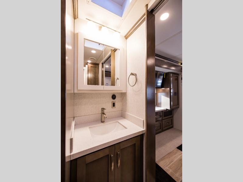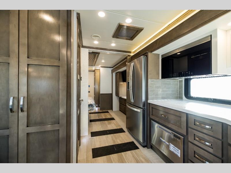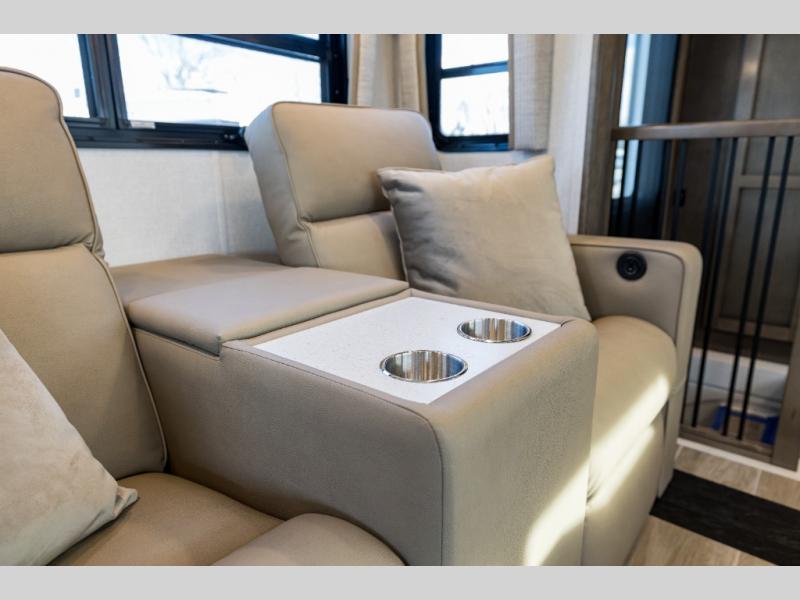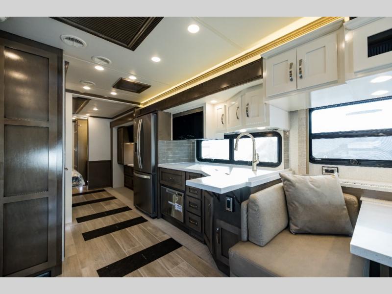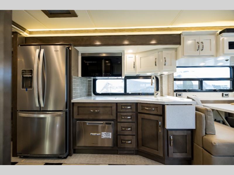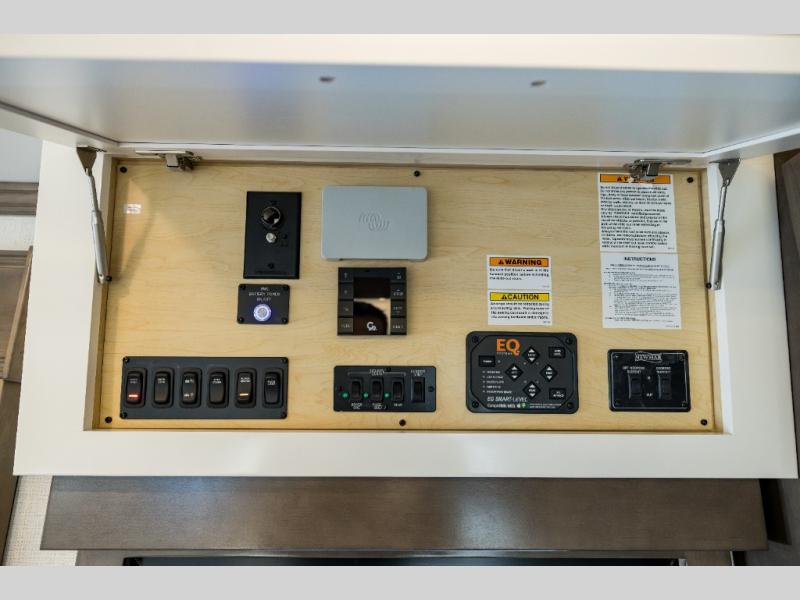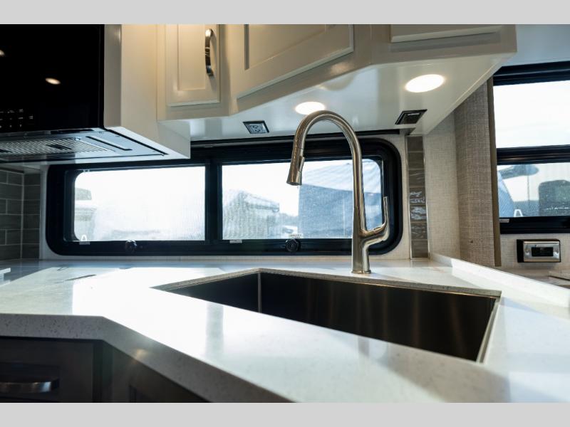 Traveling with friends and family is easier than ever in this coach with a bath and a half plus sleeping space for five to six! There is a hide-a-bed sofa across from a TV on power lift to make movie nights fun and a booth dinette to dine at or sleep an extra guest or two. The chef of your crew will love the spacious kitchen with an all-electric flush mount induction cooktop and a countertop extension for more prep space. There is also a pantry and a 19.7 cu. ft. refrigerator that provides tons of food storage space. The mid-ship half bath is centrally located for easy use, and the full rear bath includes a wardrobe with washer and dryer prep if you want the option to make wash day easier. When you're ready for some shut-eye, the queen bed slide out in the master bedroom is sure to bring a great night's rest!