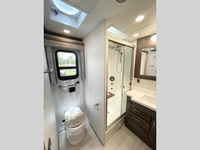 The Newmar Super Star Super C diesel motorhome is quite astonishing! It comes with hydraulic leveling jacks, a sky window with power shade in the cockpit for more natural light, wall-mounted sensors for heating and air conditioning, an 8.0kW Onan Diesel Quiet Series generator, and a multiplex lighting control system. You'll enjoy great comfort each night as you lie down on the plush pillowtop mattress, and the Villa Comfort Fit furniture will also be comfortable for relaxing or socializing. You will appreciate having a continuous water heater and a central vacuum with a tool kit, plus each model includes two 15k BTU heat pump A/C's and a 50k BTU furnace to keep you comfortable all year long!