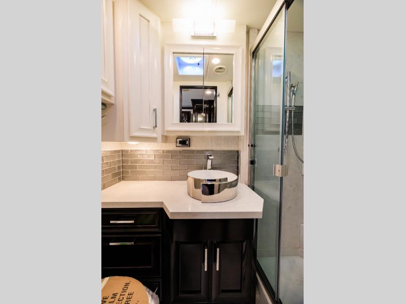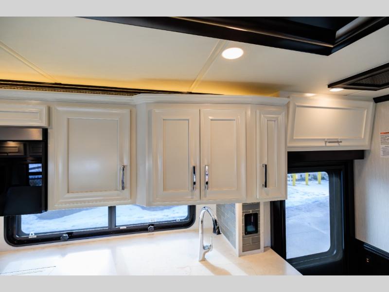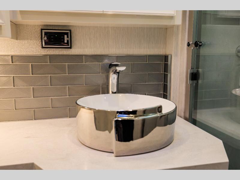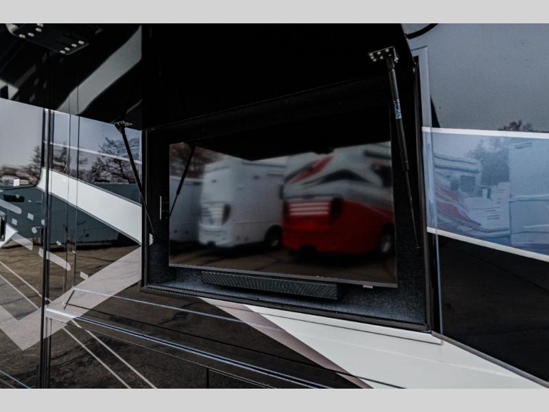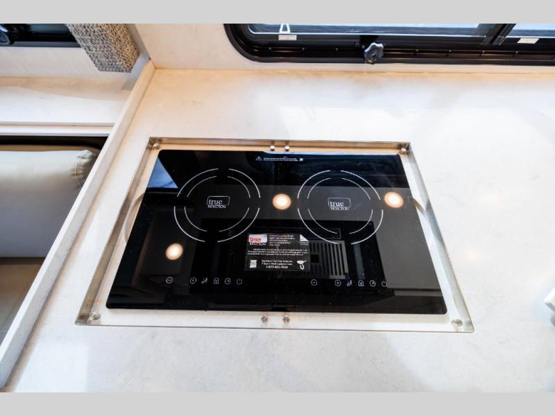 You will feel right at home in this motorhome! The full rear bathroom has a 40" x 32" shower with a seat to freshen up in each morning, a wardrobe and a safe, and a Splendide two-piece stacked washer and dryer. Inside the master suite is a king bed slide for more interior space, a dresser with shirt wardrobes on either side, and a Samsung LED TV. The half bathroom is conveniently next to the kitchen so you can get back to preparing dinner on the all electric flush mount induction cooktop. The hide-a-leaf dinette is a comfortable place to enjoy meals and play card games.