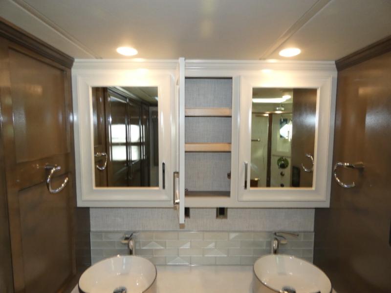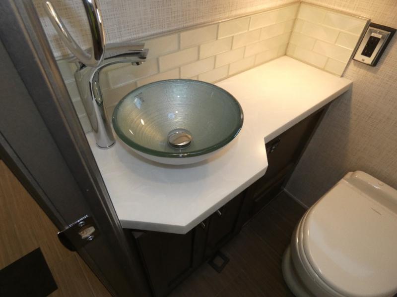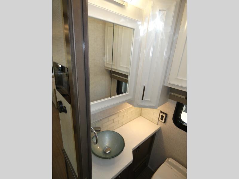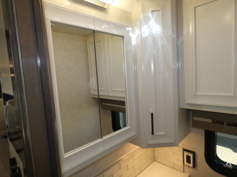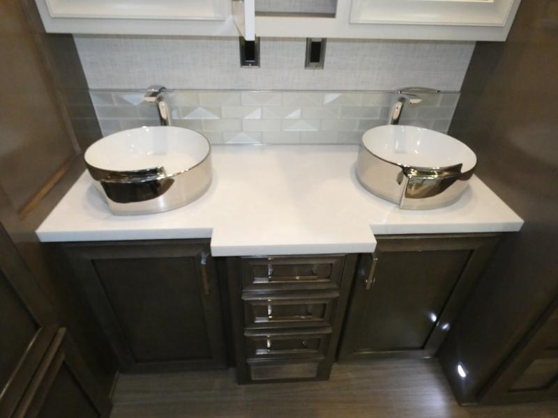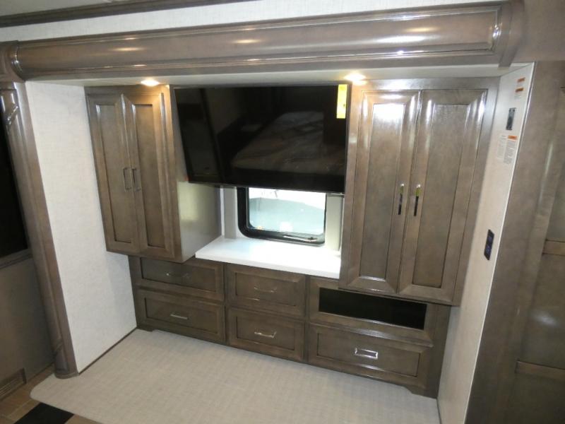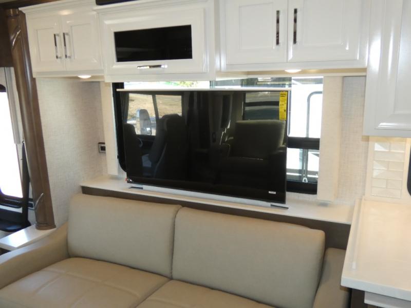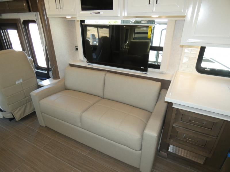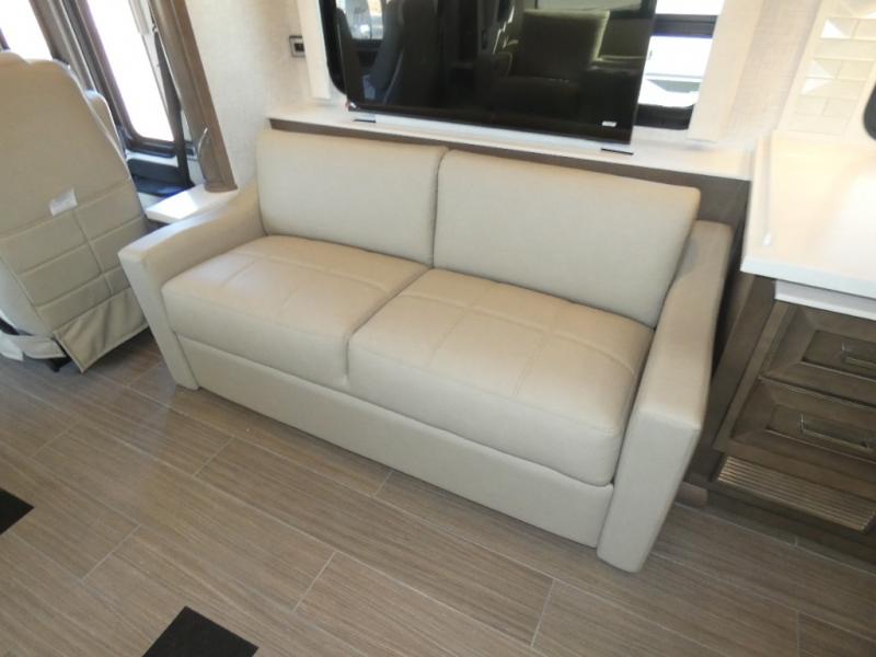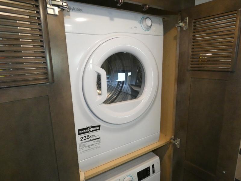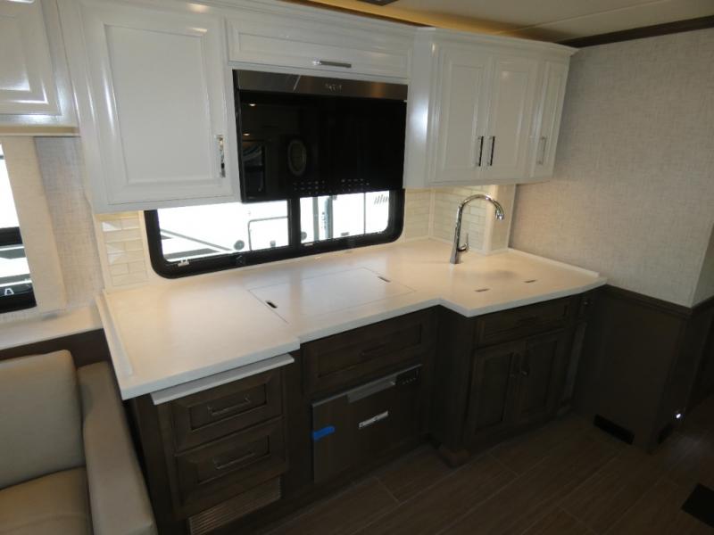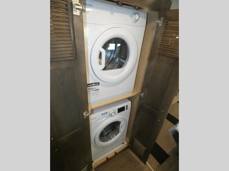 Experience a home away from home with this motorhome! Two can get ready at once in the full rear bathroom with the dual sink vanity, plus it has a 50" x 34" shower with a seat, a linen closet, a wardrobe with doors, adjustable shelves, and even washer and dryer prep. The master suite has access to the bathroom, a king bed slide, and a dresser with wardrobes on either side and a Samsung LED 4K TV. You can prepare your best meals with the all electric induction cooktop, pull-out cabinet, and large pantry then enjoy them at the free-standing dinette with chairs. Now that your belly is full, head to either the 87" hide-a-bed sofa or the 74" jackknife sofa while a movie plays on the 50" Samsung LED 4K TV on a power lift!