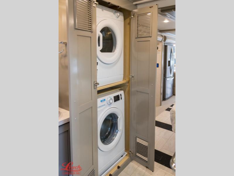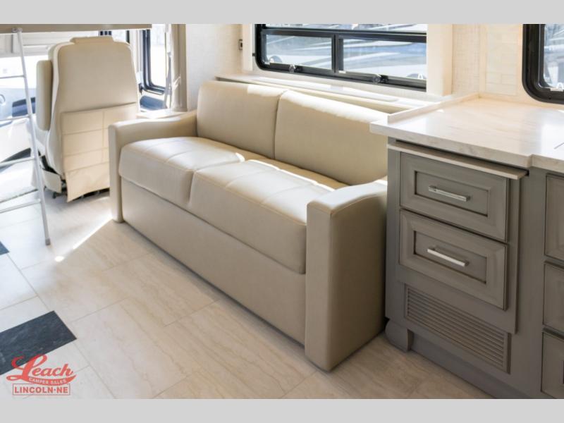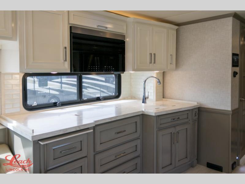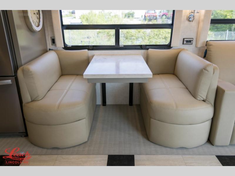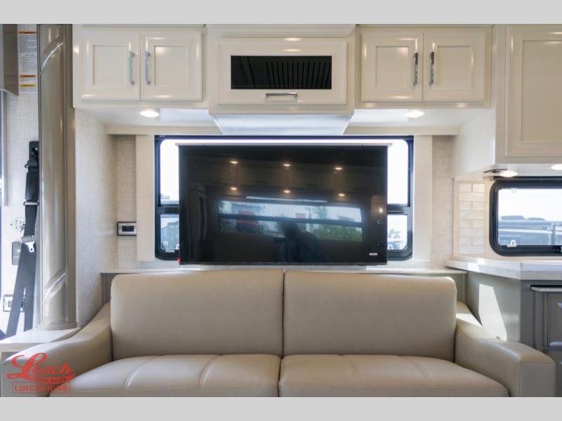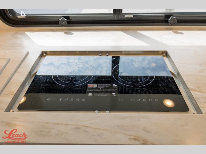 Experience a home away from home with this motorhome! Two can get ready at once in the full rear bathroom with the dual sink vanity, plus it has a 50" x 34" shower with a seat, a linen closet, a wardrobe with doors, adjustable shelves, and even washer and dryer prep. The master suite has access to the bathroom, a king bed slide, and a dresser with wardrobes on either side and a Samsung LED 4K TV. You can prepare your best meals with the all electric induction cooktop, pull-out cabinet, and large pantry then enjoy them at the free-standing dinette with chairs. Now that your belly is full, head to either the 87" hide-a-bed sofa or the 74" jackknife sofa while a movie plays on the 50" Samsung LED 4K TV on a power lift!