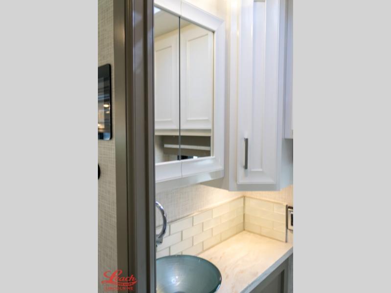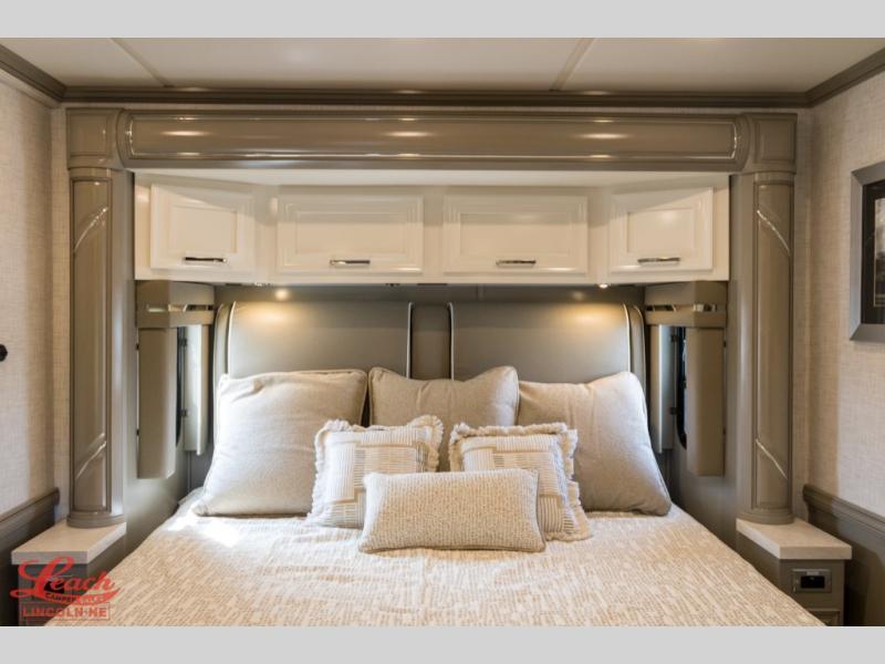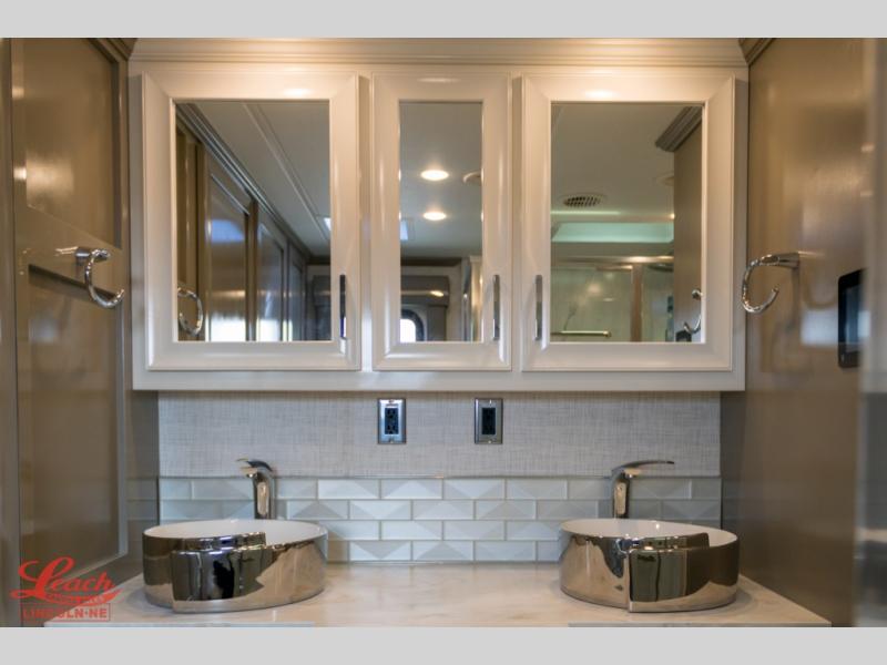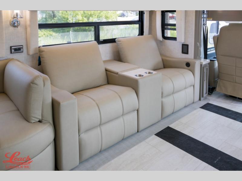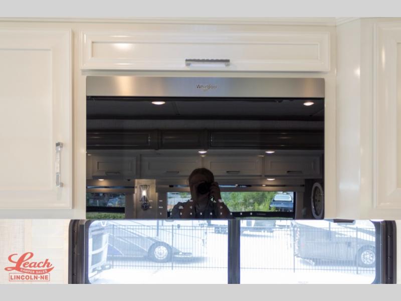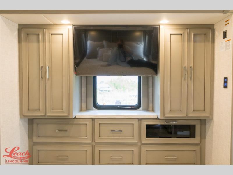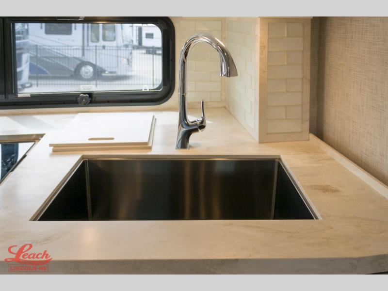 Experience a home away from home with this motorhome! Two can get ready at once in the full rear bathroom with the dual sink vanity, plus it has a 50" x 34" shower with a seat, a linen closet, a wardrobe with doors, adjustable shelves, and even washer and dryer prep. The master suite has access to the bathroom, a king bed slide, and a dresser with wardrobes on either side and a Samsung LED 4K TV. You can prepare your best meals with the all electric induction cooktop, pull-out cabinet, and large pantry then enjoy them at the free-standing dinette with chairs. Now that your belly is full, head to either the 87" hide-a-bed sofa or the 74" jackknife sofa while a movie plays on the 50" Samsung LED 4K TV on a power lift!