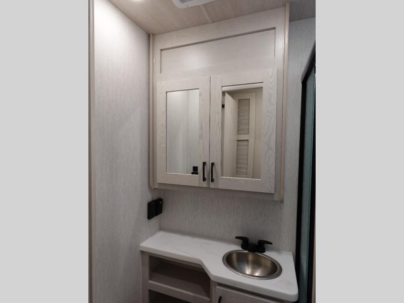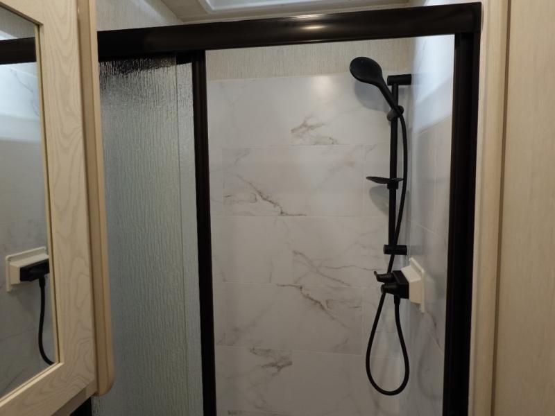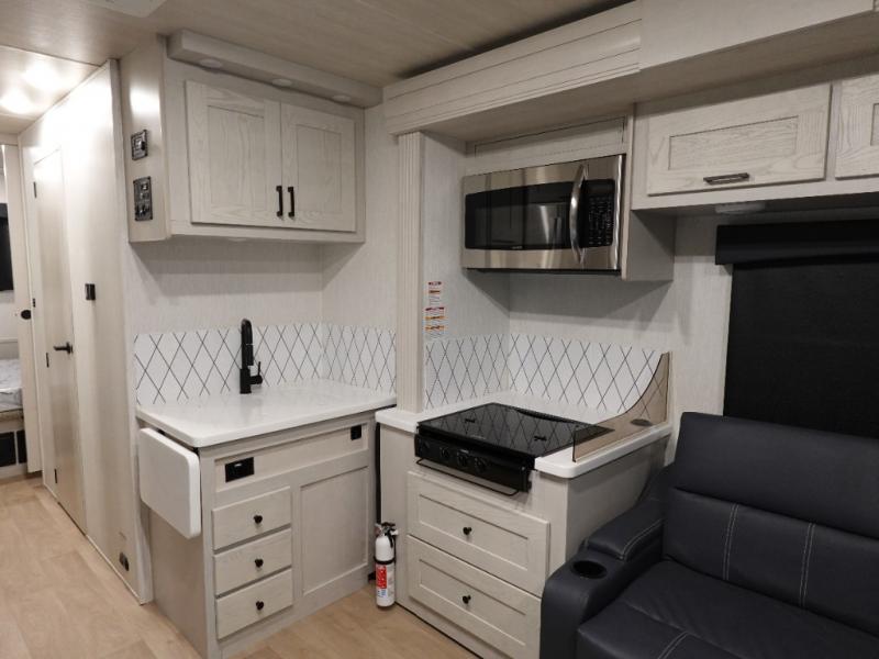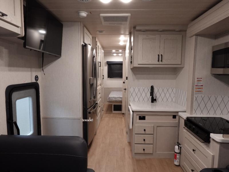 Traveling with your spouse or family is made easy in this coach from the spacious interior with two slide outs to the full bathroom allowing you to skip the public facilities! The cook will love the kitchen amenities including the 20.7 cu. ft. residential refrigerator, the stainless steel appliances, and the solid surface countertops. The kids or grandkids will love the cab over bunk and you will enjoy the RV queen bed in the rear bedroom. You will find storage throughout the inside and the outside, plus many more features you are sure to love!
