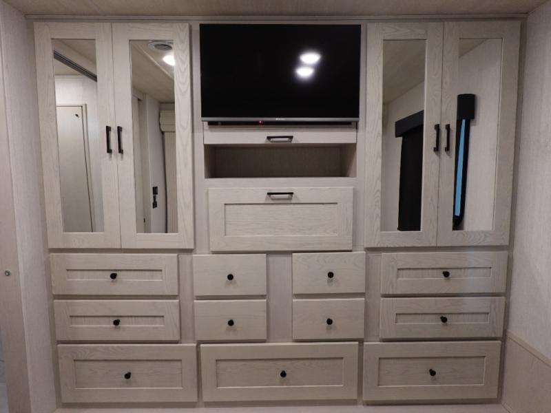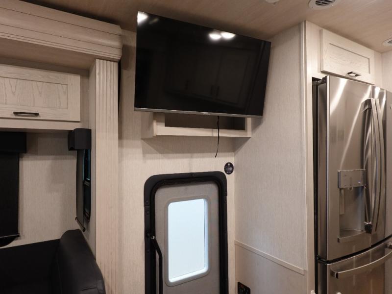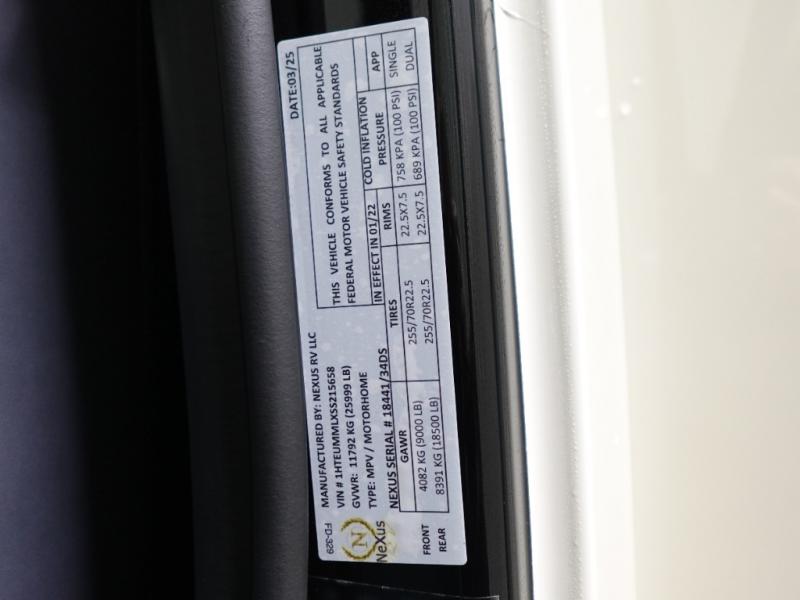 With any NeXus Ghost Super C diesel motorhome you will experience your dream with peace of mind thanks to the construction. From the composite substrate which is impervious to water, the protective diamond shield, and the seamless wraparound fiberglass roof, you can travel whenever you like with confidence. The interior raises the standard with luxury appointments with day/night roller shades, solid surface countertops throughout, stainless steel appliances, and many more luxuries. You will appreciate having an on-demand hot water heater onboard, along with two A/C units, a 30K BTU furnace, and an 8.0 diesel generator for all your power needs. Backup and side view cameras will also come in handy when driving, as well as a 10" touch screen with phone mirroring, and a Mobileye collision warning system for added safety.