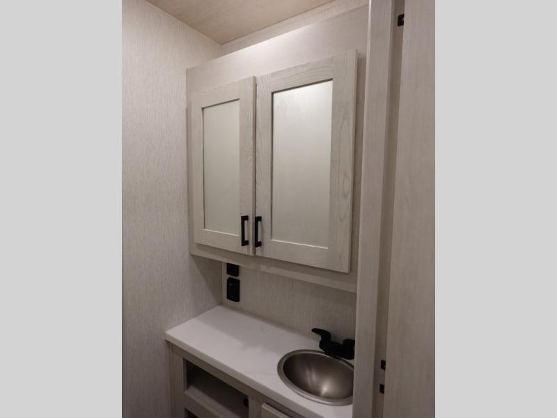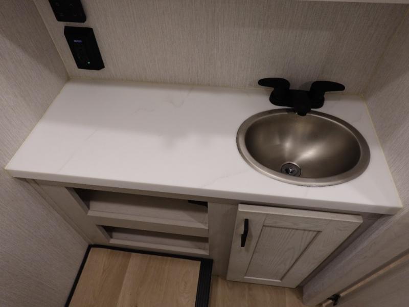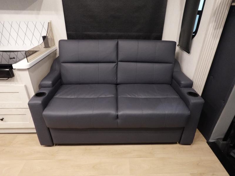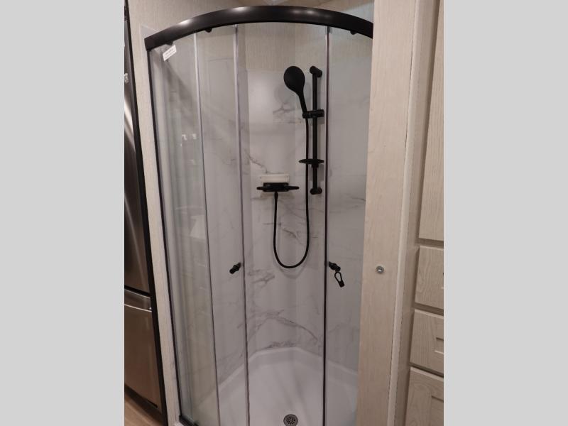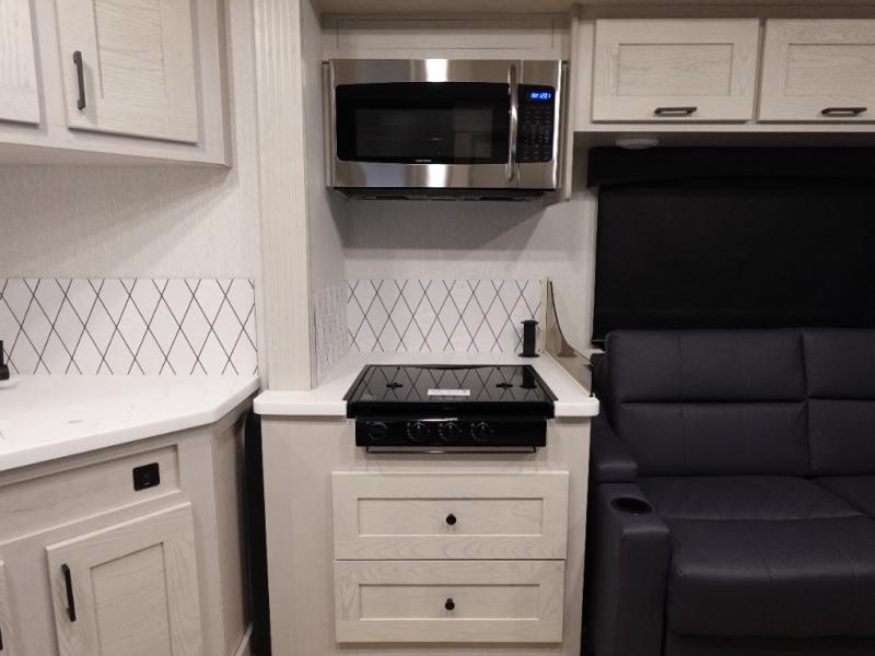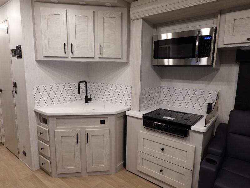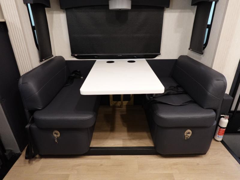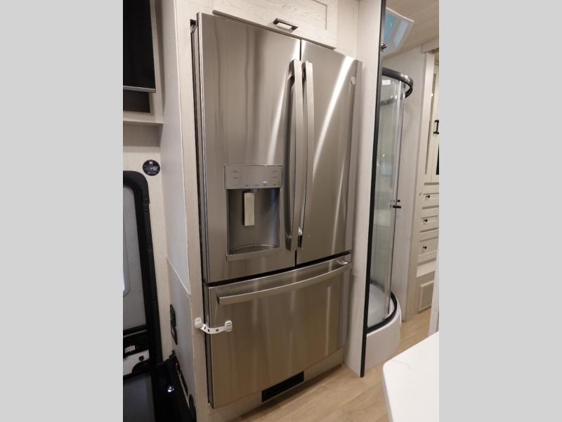 Load up your family and head out for a fun vacation or month-long trek to see new places and experience new activities. You can keep everyone fed along the way with home cooked meals using the stainless steel appliances including a convection microwave and 20.7 cu. ft. residential refrigerator. The split-style bath offers privacy with a sink and toilet across the hall from the radius shower. The rear bedroom also provides a king bed and an LED TV. You can relax inside on the furniture that also provides sleeping space and watch the LED TV, or relax under the electric patio awning with LED lighting.