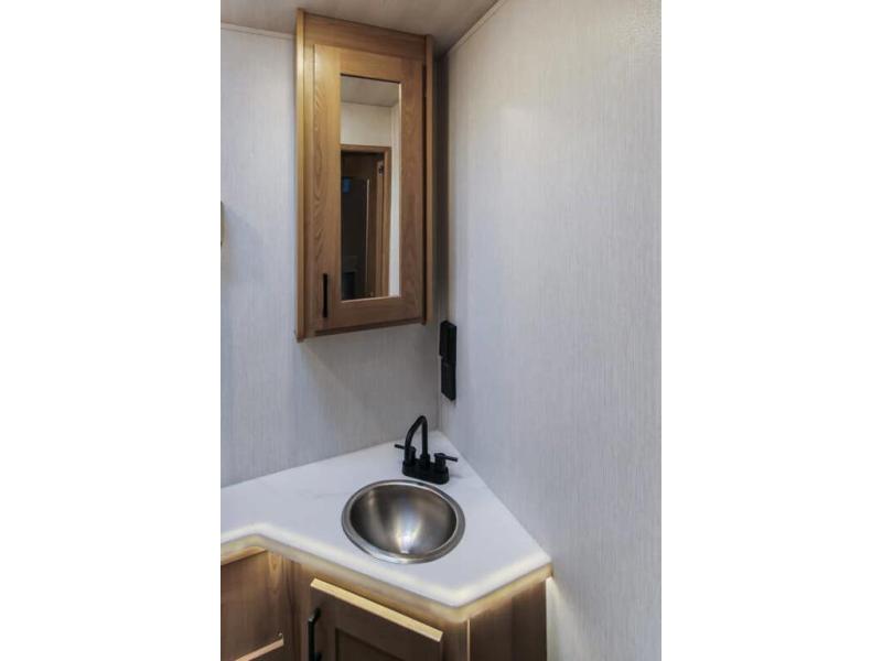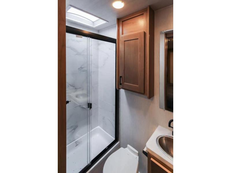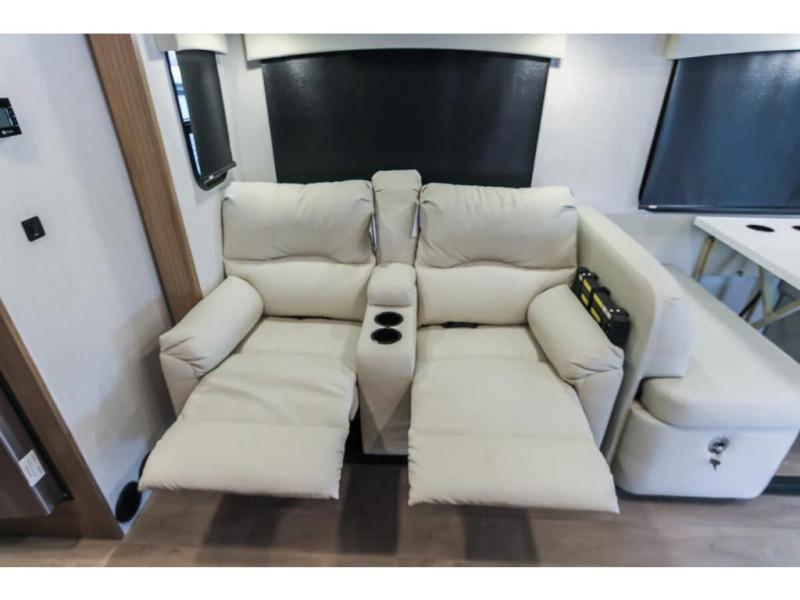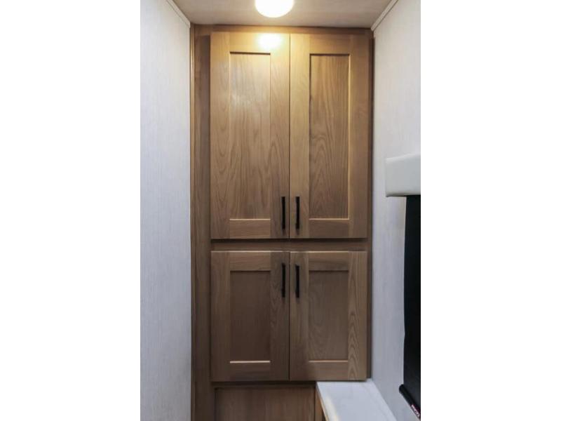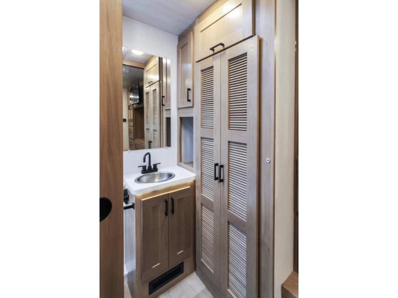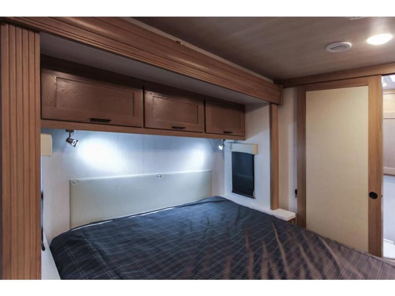 You and your spouse can travel in comfort in this spacious coach with two slide outs, one slide is located in the private bedroom and the other slide is in the main living area and kitchen giving the cook more space to prepare meals. The cook will enjoy the residential refrigerator and pantry storage, as well as the convection microwave and stainless steel appliances. The deluxe booth dinette and the deluxe tri-fold sofa offer seating along with the captain's chairs. You can sleep like a royalty in the bedroom, and your guests will have the choice of sleeping on the cab over bunk or the furniture. The half bath is mid-coach and the full bathroom with wardrobe and linen storage is connected to the bedroom for convenience especially at night.