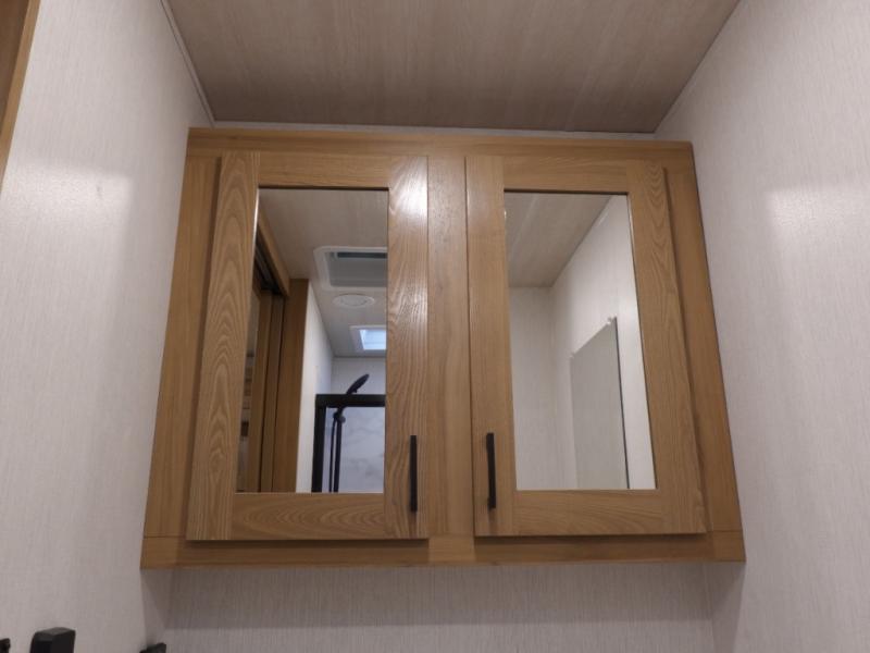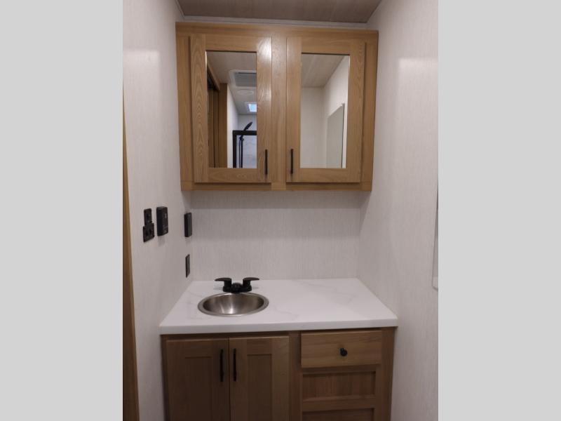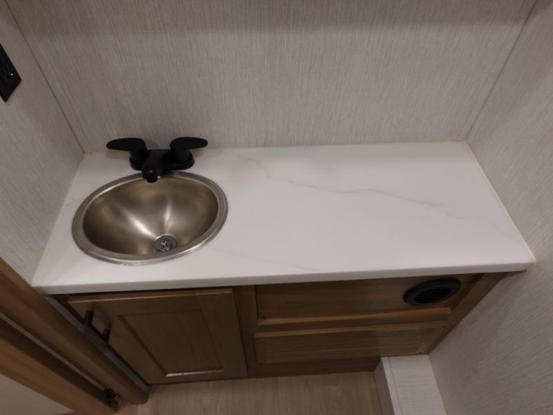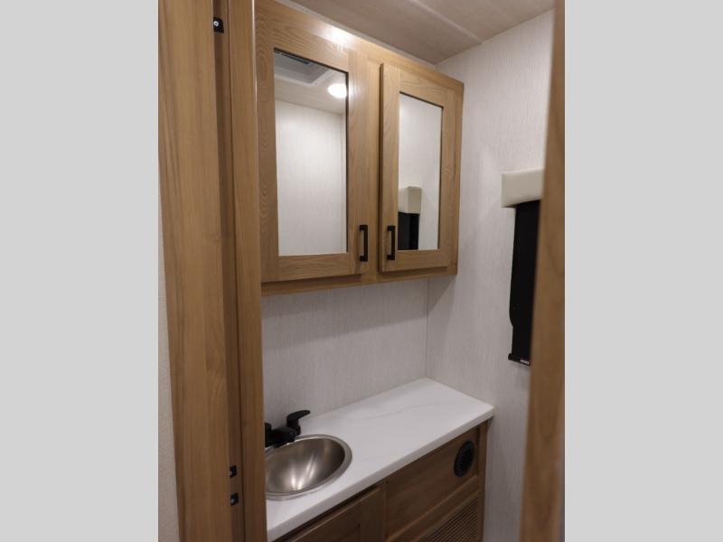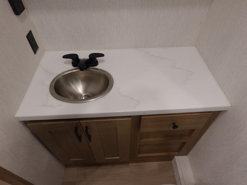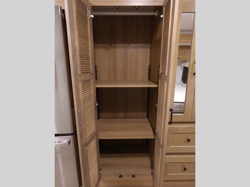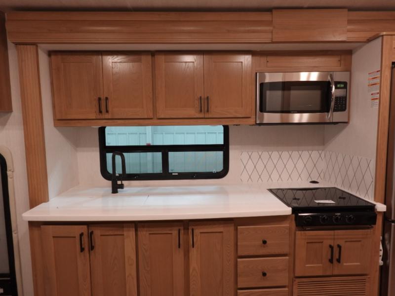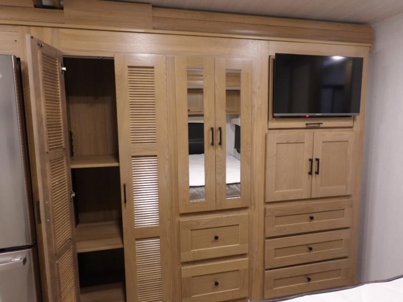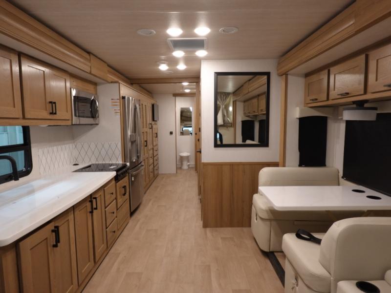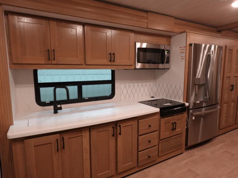 You and your spouse can travel in comfort in this spacious coach with triple slides, one of which is a full-wall slide for maximum space. The cook will enjoy the residential refrigerator and pantry storage, as well as the convection microwave and stainless steel appliances. The deluxe booth dinette and the deluxe tri-fold sofa offer seating along with the captain's chairs. You can sleep like a royalty in the bedroom, and your guests will have the choice of sleeping on the cab over bunk or the furniture. The half bath is mid-coach and the full rear bath is connected to the bedroom for even more comfort.