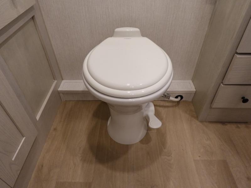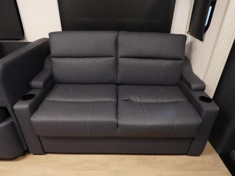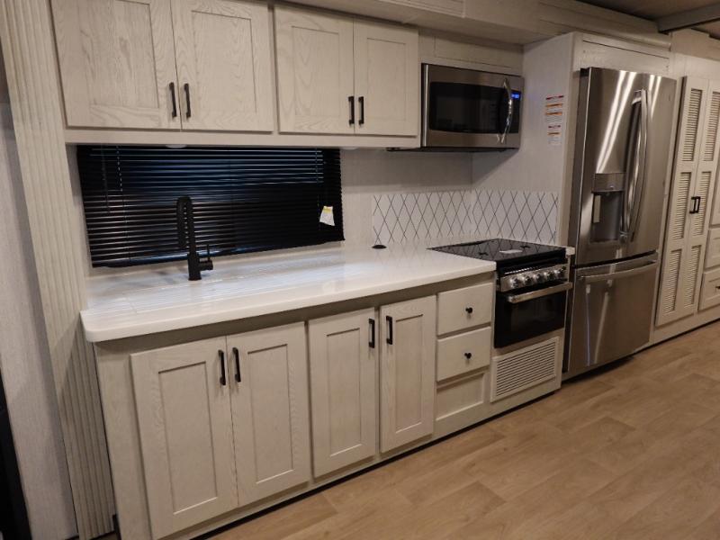 You and your spouse can travel in comfort in this spacious coach with triple slides, one of which is a full-wall slide for maximum space. The cook will enjoy the residential refrigerator and pantry storage, as well as the convection microwave and stainless steel appliances. The deluxe booth dinette and the deluxe tri-fold sofa offer seating along with the captain's chairs. You can sleep like a royalty in the bedroom, and your guests will have the choice of sleeping on the cab over bunk or the furniture. The half bath is mid-coach and the full rear bath is connected to the bedroom for even more comfort.
