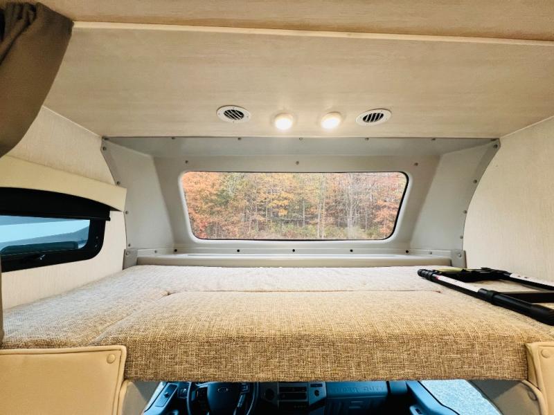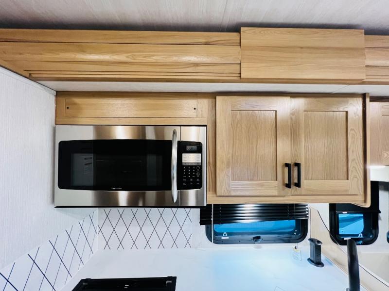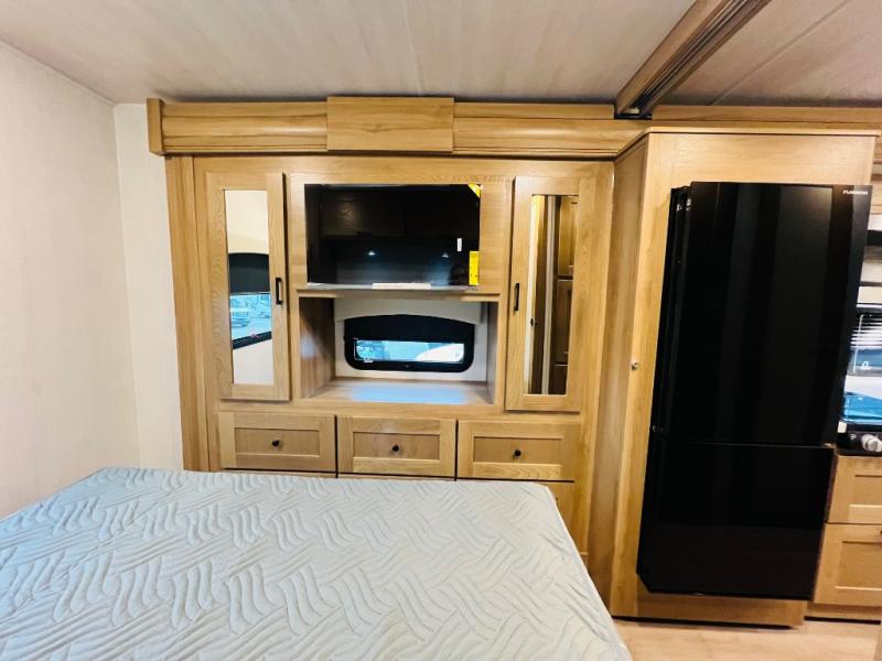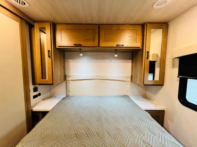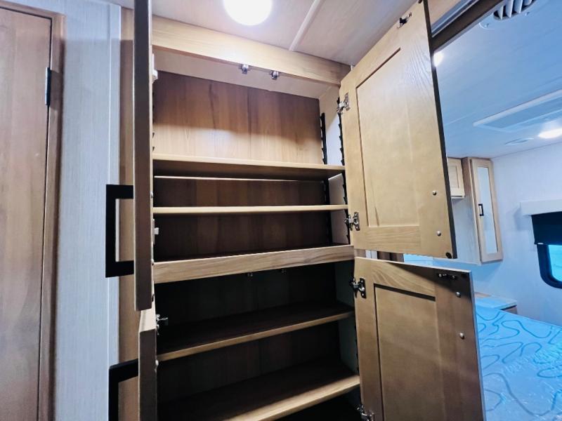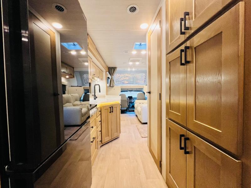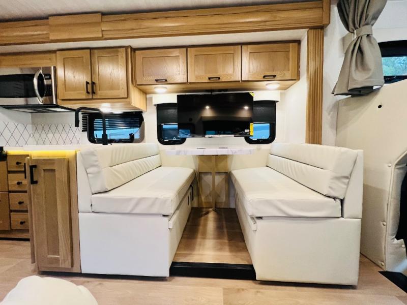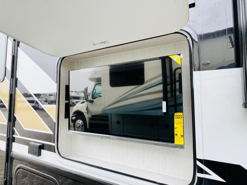 At the front of the32MX motorhome, you’ll find the cab-over bunk, providing extra sleeping space for guests when needed. The living area features a comfortable jackknife sofa, perfect for relaxing after a day of travel, while across the way, the booth dinette offers a cozy spot to enjoy meals or can easily convert into an additional sleeping area. Moving to the center, the kitchen comes fully equipped with a 10-cu. ft. refrigerator, 3-burner stove top, and residential convection microwave, giving you everything you need to prepare meals on the go. Ample overhead cabinetry throughout ensures there’s plenty of storage for kitchenware and essentials. Across from the kitchen, the full bathroom includes a porcelain toilet, shower skylight for added headroom, and a large medicine cabinet to keep toiletries organized, offering the convenience of home without relying on campground facilities. At the rear, the inviting bedroom features a deluxe innerspring queen bed for a restful night’s sleep, along with a wardrobe for clothing storage and a smart TV, perfect for unwinding in comfort while watching your favorite shows.
