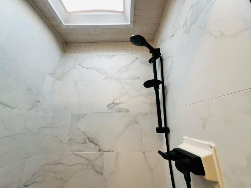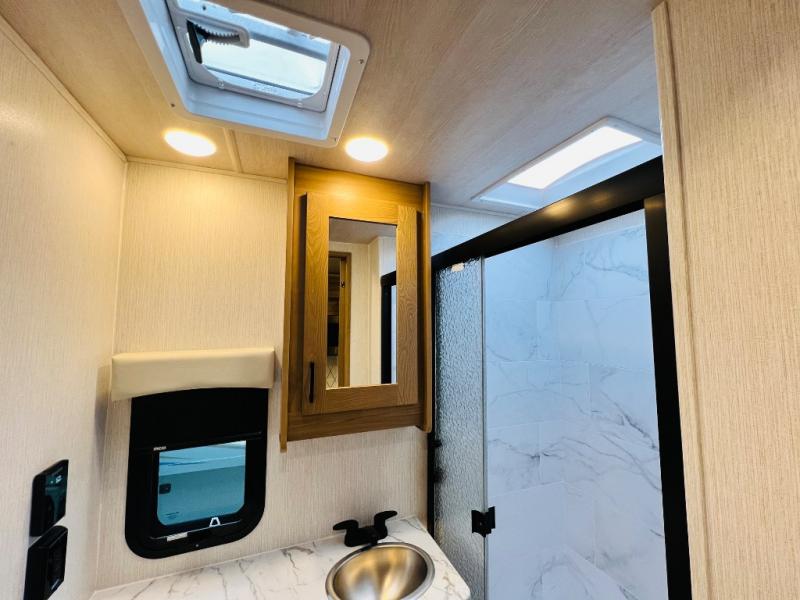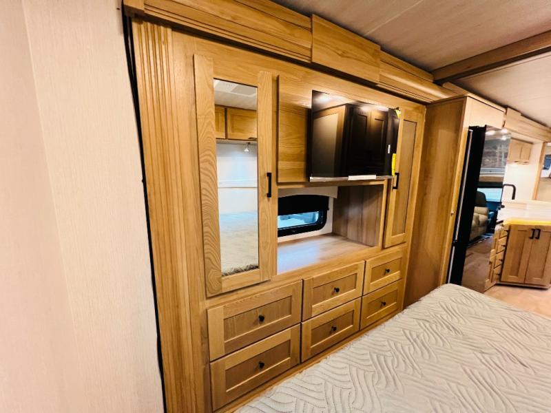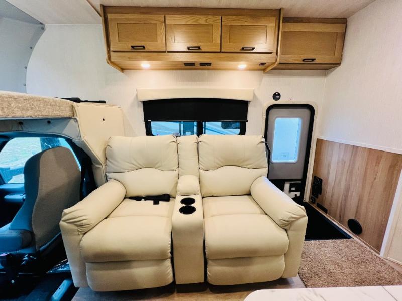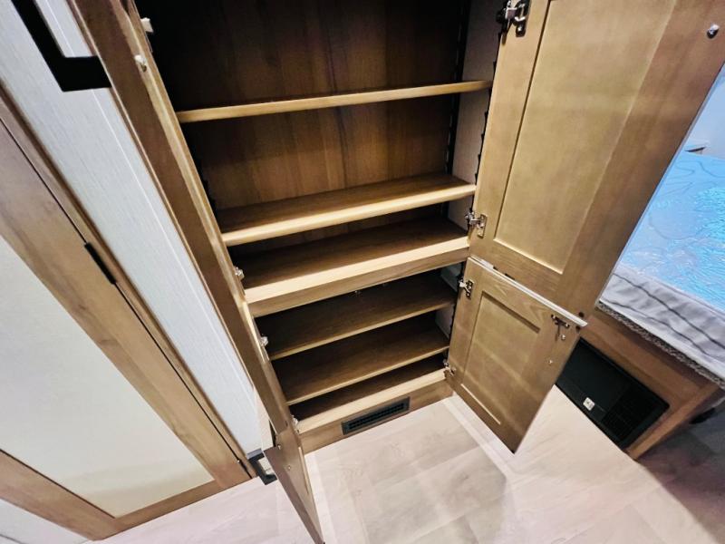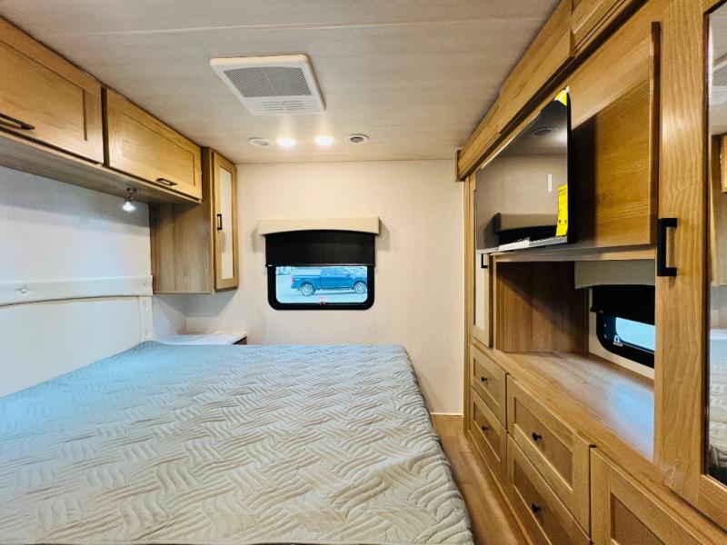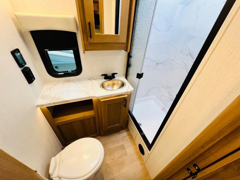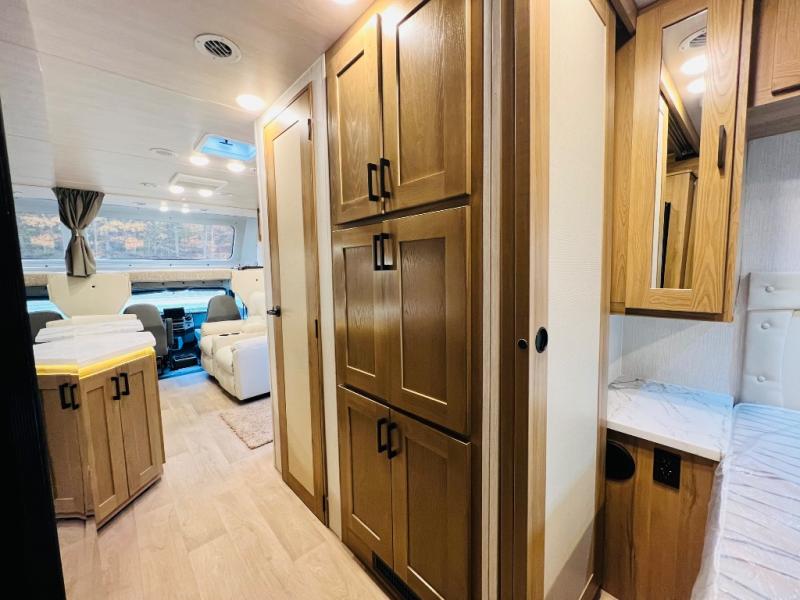 At the front of the32MX motorhome, you’ll find the cab-over bunk, providing extra sleeping space for guests when needed. The living area features a comfortable jackknife sofa, perfect for relaxing after a day of travel, while across the way, the booth dinette offers a cozy spot to enjoy meals or can easily convert into an additional sleeping area. Moving to the center, the kitchen comes fully equipped with a 10-cu. ft. refrigerator, 3-burner stove top, and residential convection microwave, giving you everything you need to prepare meals on the go. Ample overhead cabinetry throughout ensures there’s plenty of storage for kitchenware and essentials. Across from the kitchen, the full bathroom includes a porcelain toilet, shower skylight for added headroom, and a large medicine cabinet to keep toiletries organized, offering the convenience of home without relying on campground facilities. At the rear, the inviting bedroom features a deluxe innerspring queen bed for a restful night’s sleep, along with a wardrobe for clothing storage and a smart TV, perfect for unwinding in comfort while watching your favorite shows.
