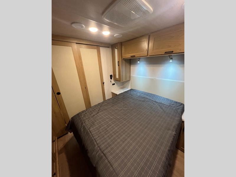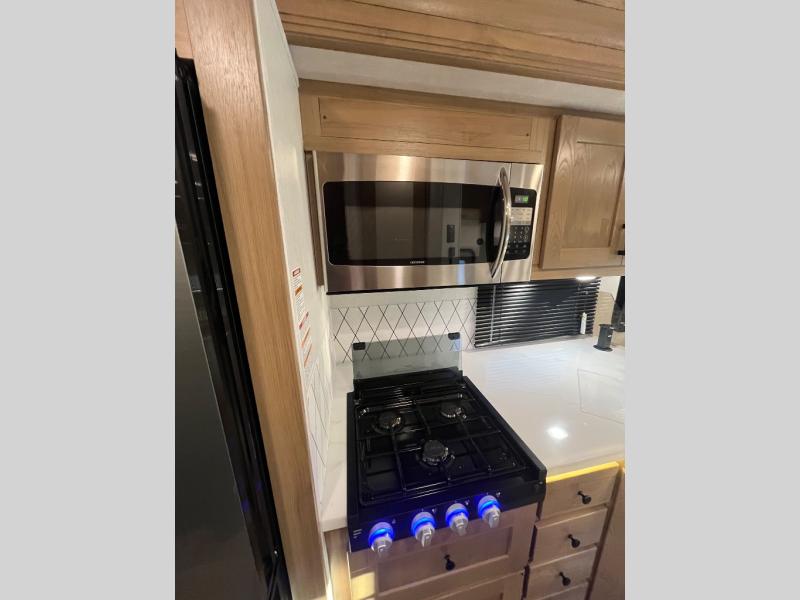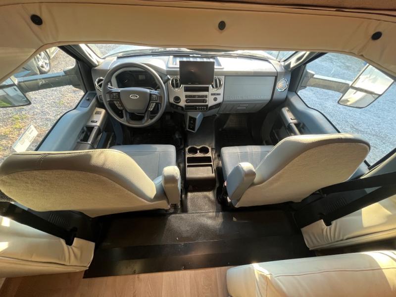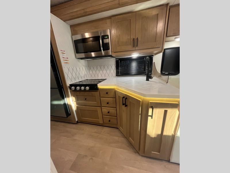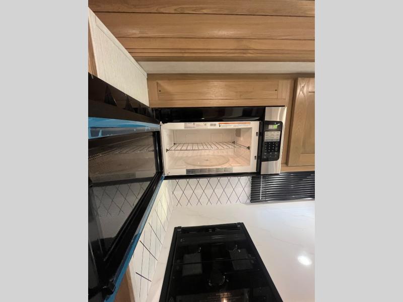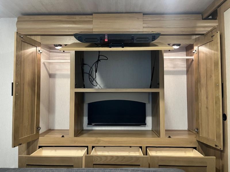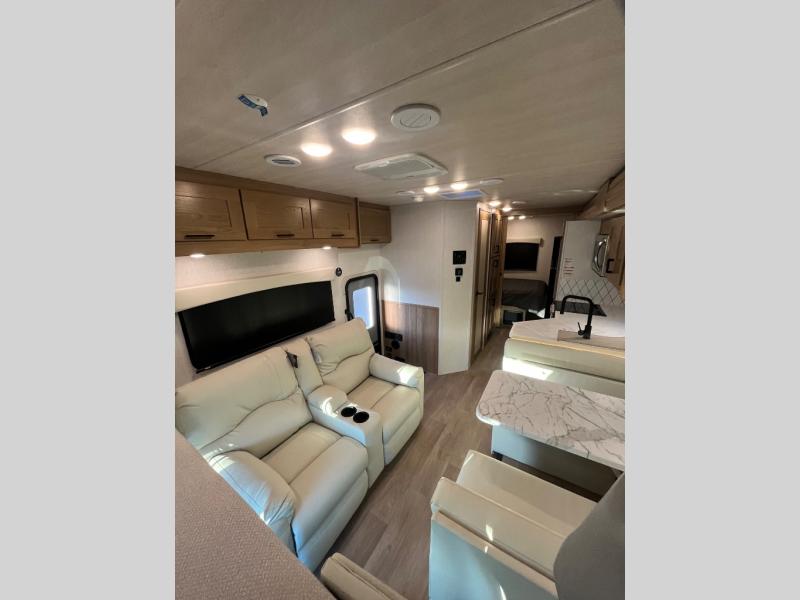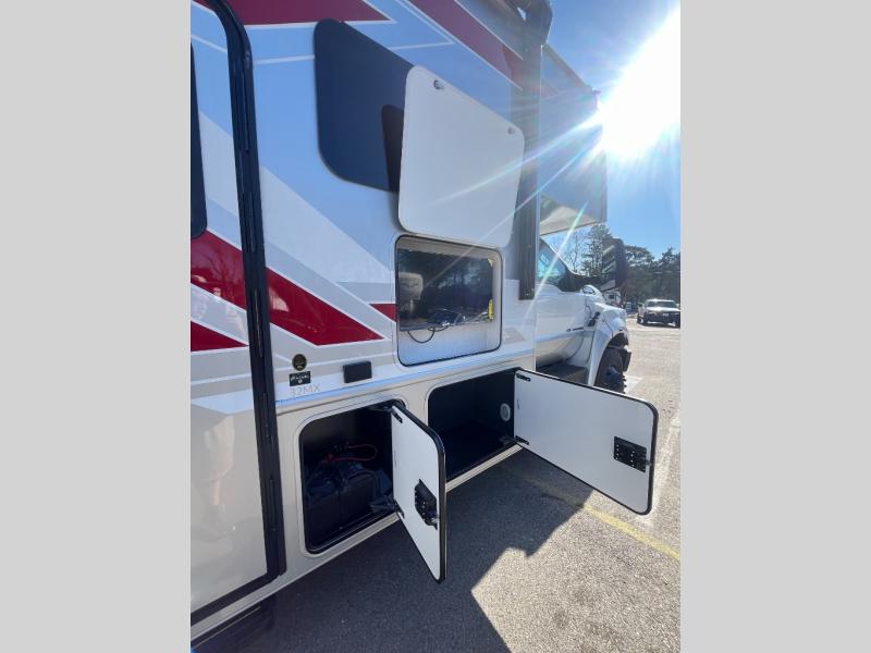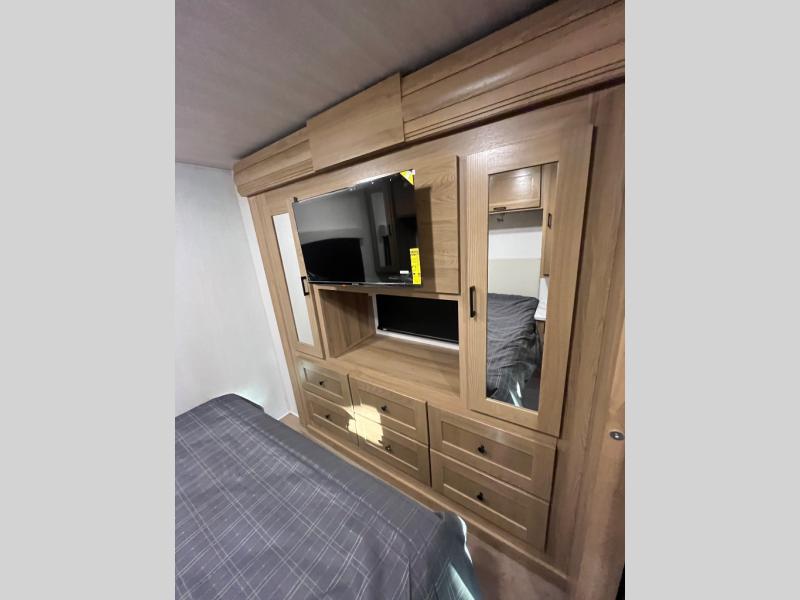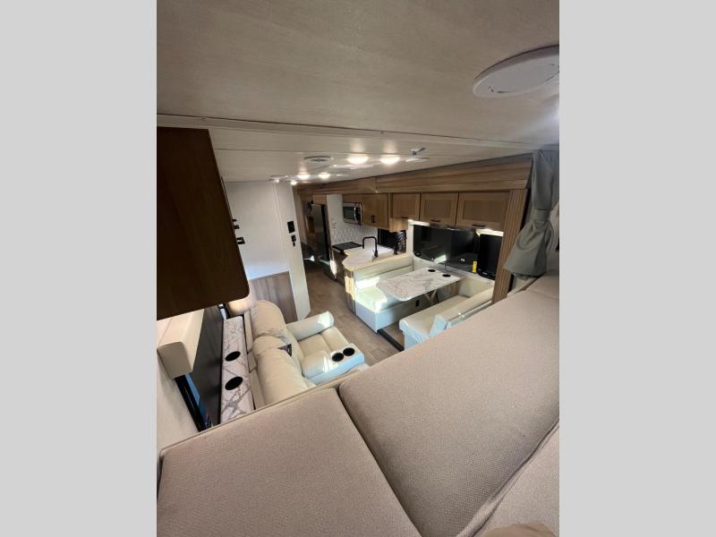 At the front of the32MX motorhome, you’ll find the cab-over bunk, providing extra sleeping space for guests when needed. The living area features a comfortable jackknife sofa, perfect for relaxing after a day of travel, while across the way, the booth dinette offers a cozy spot to enjoy meals or can easily convert into an additional sleeping area. Moving to the center, the kitchen comes fully equipped with a 10-cu. ft. refrigerator, 3-burner stove top, and residential convection microwave, giving you everything you need to prepare meals on the go. Ample overhead cabinetry throughout ensures there’s plenty of storage for kitchenware and essentials. Across from the kitchen, the full bathroom includes a porcelain toilet, shower skylight for added headroom, and a large medicine cabinet to keep toiletries organized, offering the convenience of home without relying on campground facilities. At the rear, the inviting bedroom features a deluxe innerspring queen bed for a restful night’s sleep, along with a wardrobe for clothing storage and a smart TV, perfect for unwinding in comfort while watching your favorite shows.