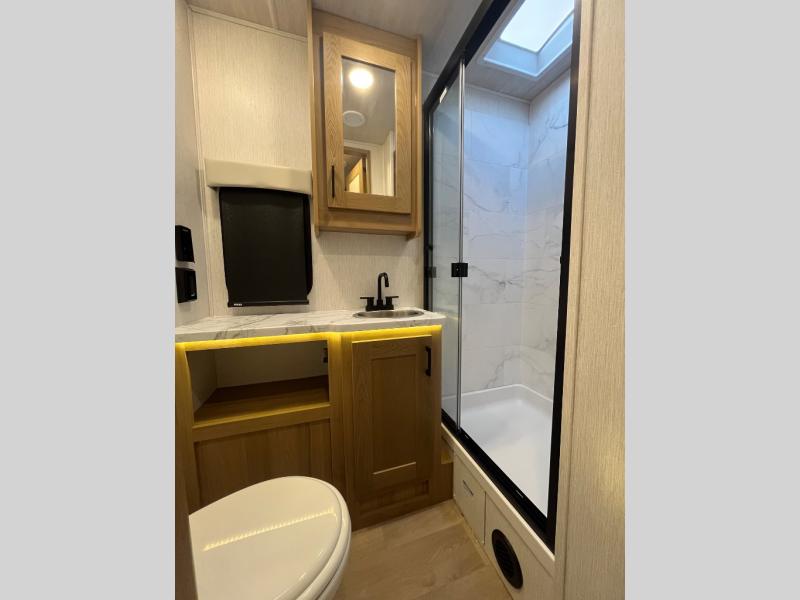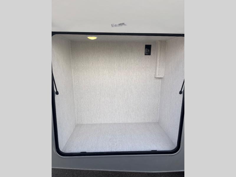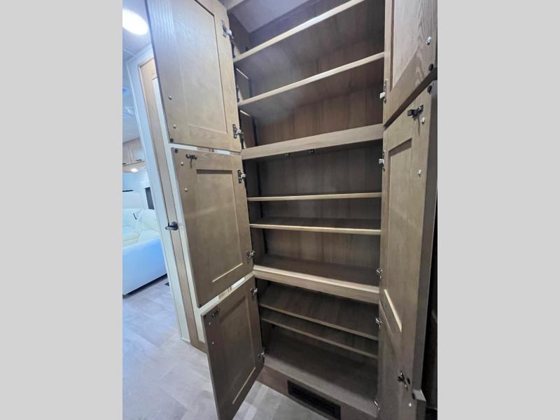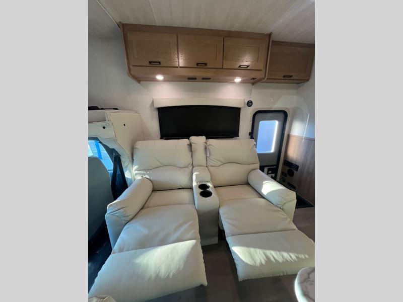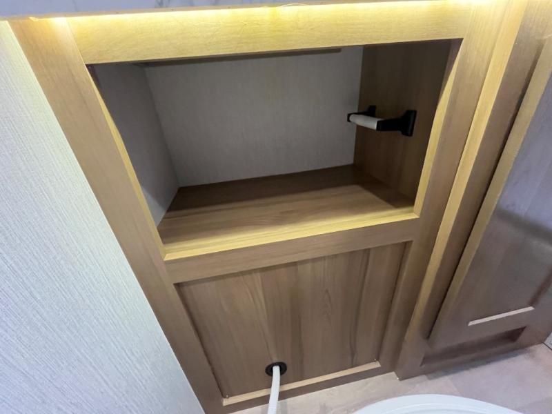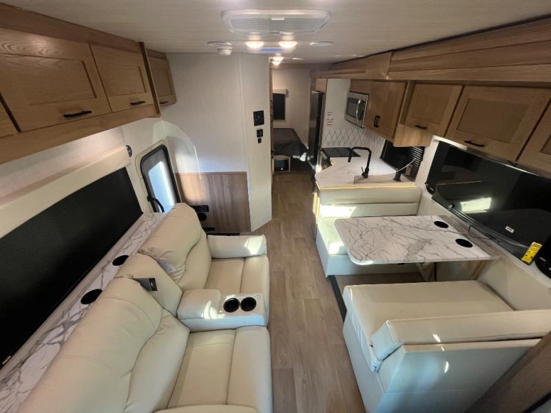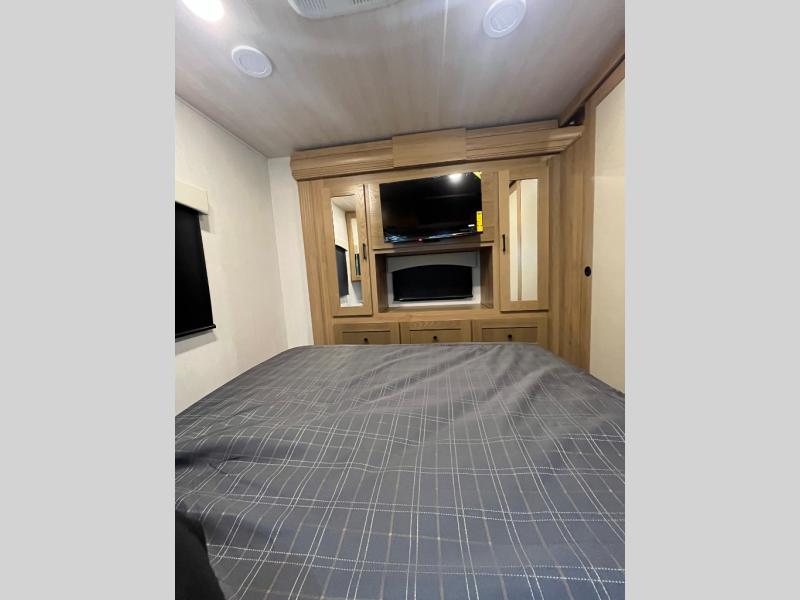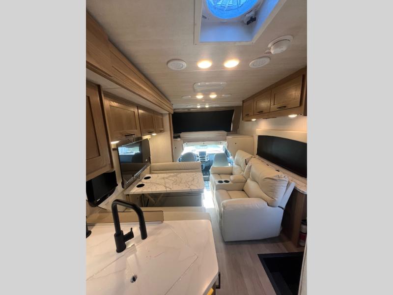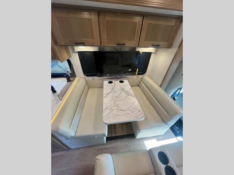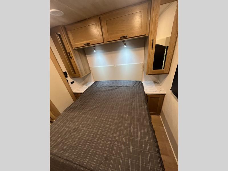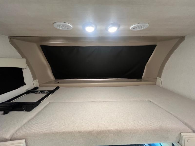 At the front of the32MX motorhome, you’ll find the cab-over bunk, providing extra sleeping space for guests when needed. The living area features a comfortable jackknife sofa, perfect for relaxing after a day of travel, while across the way, the booth dinette offers a cozy spot to enjoy meals or can easily convert into an additional sleeping area. Moving to the center, the kitchen comes fully equipped with a 10-cu. ft. refrigerator, 3-burner stove top, and residential convection microwave, giving you everything you need to prepare meals on the go. Ample overhead cabinetry throughout ensures there’s plenty of storage for kitchenware and essentials. Across from the kitchen, the full bathroom includes a porcelain toilet, shower skylight for added headroom, and a large medicine cabinet to keep toiletries organized, offering the convenience of home without relying on campground facilities. At the rear, the inviting bedroom features a deluxe innerspring queen bed for a restful night’s sleep, along with a wardrobe for clothing storage and a smart TV, perfect for unwinding in comfort while watching your favorite shows.