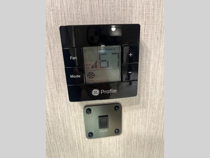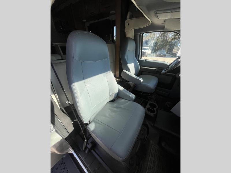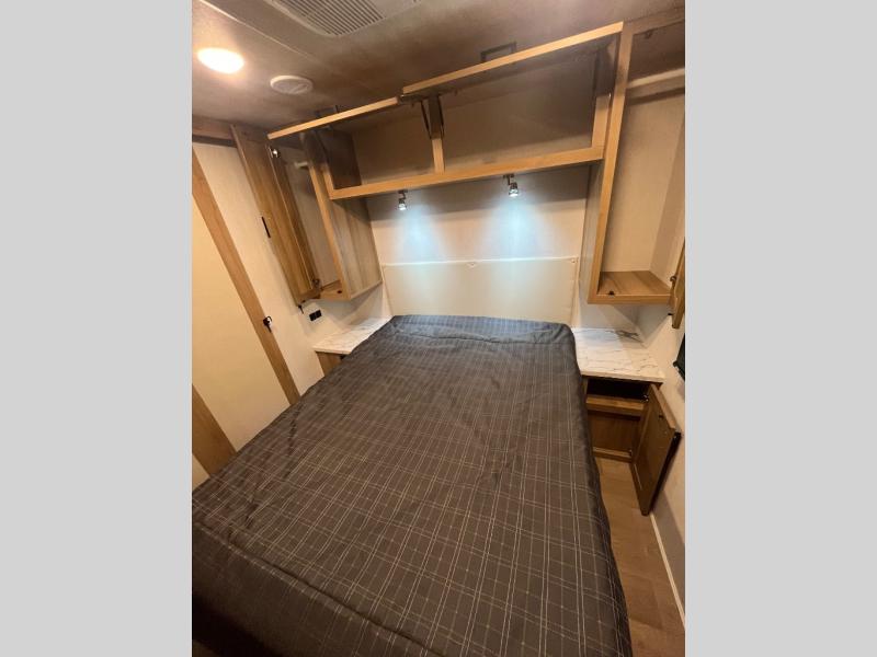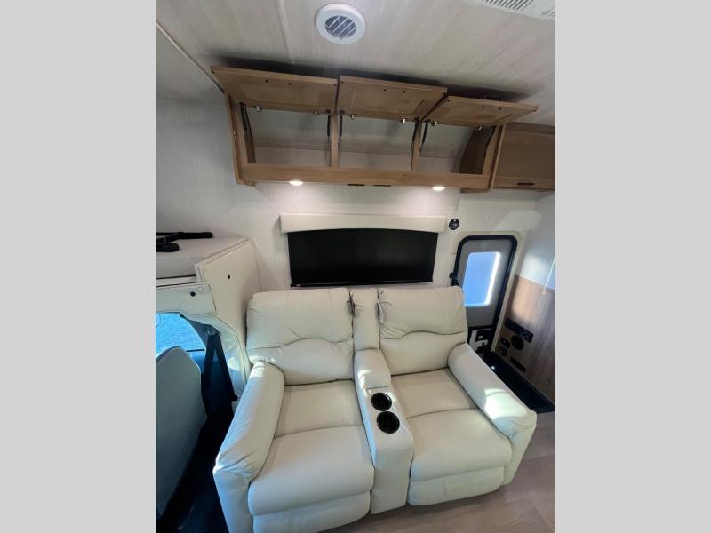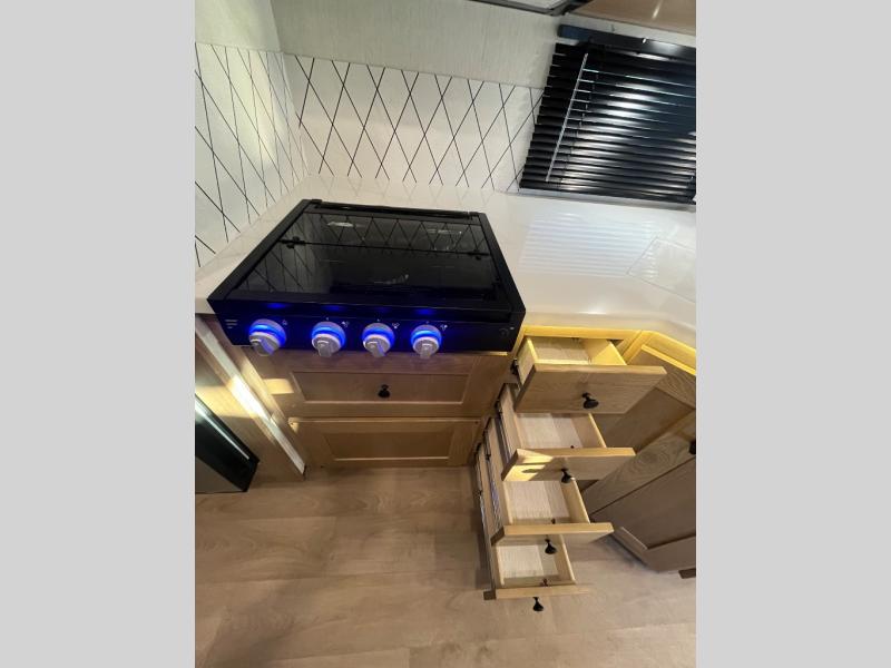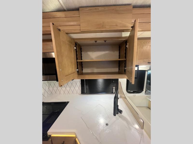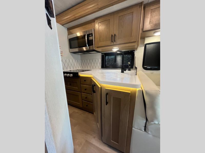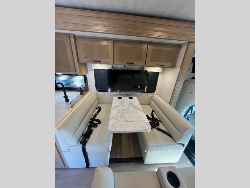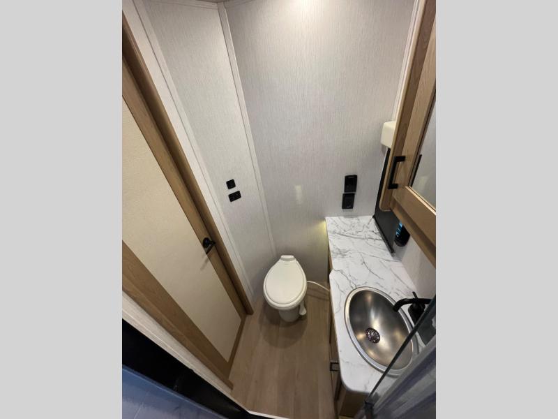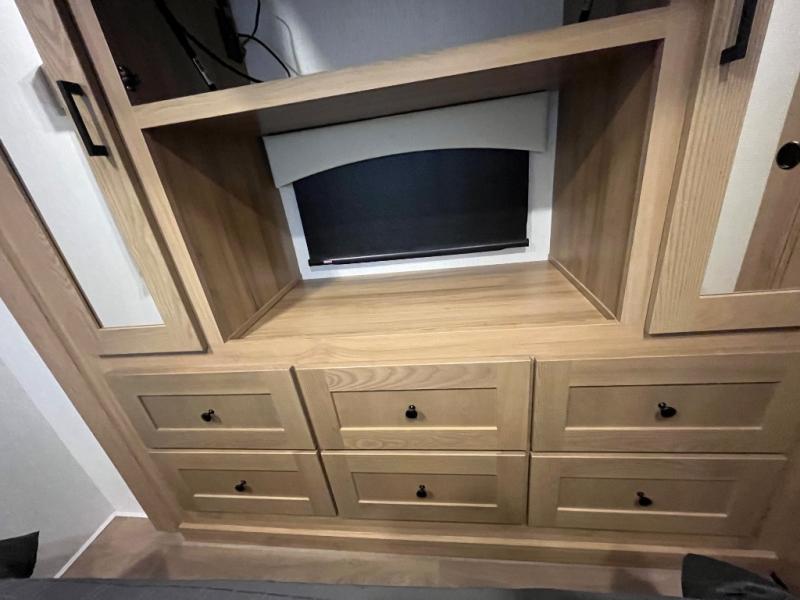 At the front of the32MX motorhome, you’ll find the cab-over bunk, providing extra sleeping space for guests when needed. The living area features a comfortable jackknife sofa, perfect for relaxing after a day of travel, while across the way, the booth dinette offers a cozy spot to enjoy meals or can easily convert into an additional sleeping area. Moving to the center, the kitchen comes fully equipped with a 10-cu. ft. refrigerator, 3-burner stove top, and residential convection microwave, giving you everything you need to prepare meals on the go. Ample overhead cabinetry throughout ensures there’s plenty of storage for kitchenware and essentials. Across from the kitchen, the full bathroom includes a porcelain toilet, shower skylight for added headroom, and a large medicine cabinet to keep toiletries organized, offering the convenience of home without relying on campground facilities. At the rear, the inviting bedroom features a deluxe innerspring queen bed for a restful night’s sleep, along with a wardrobe for clothing storage and a smart TV, perfect for unwinding in comfort while watching your favorite shows.