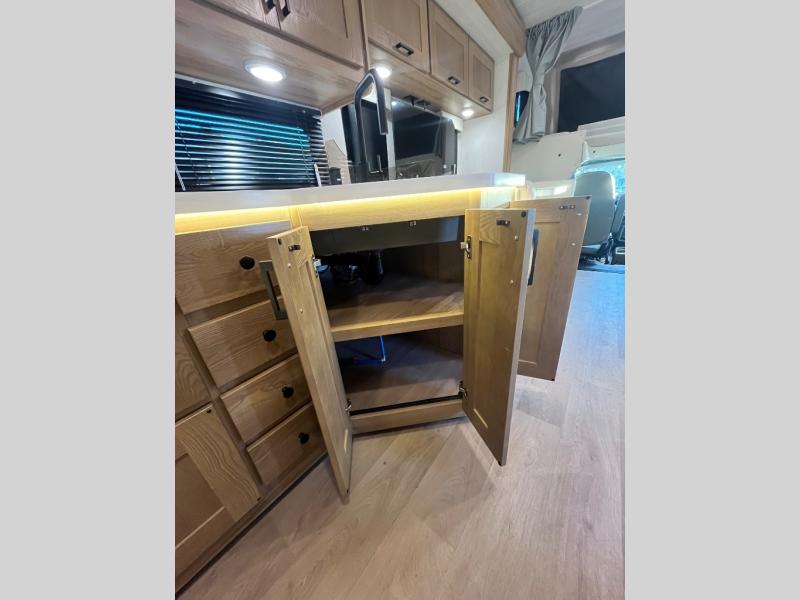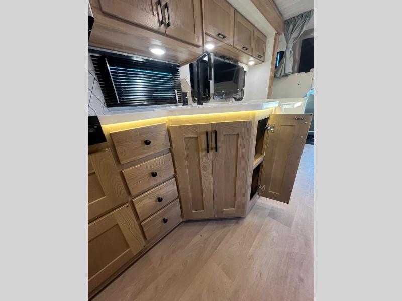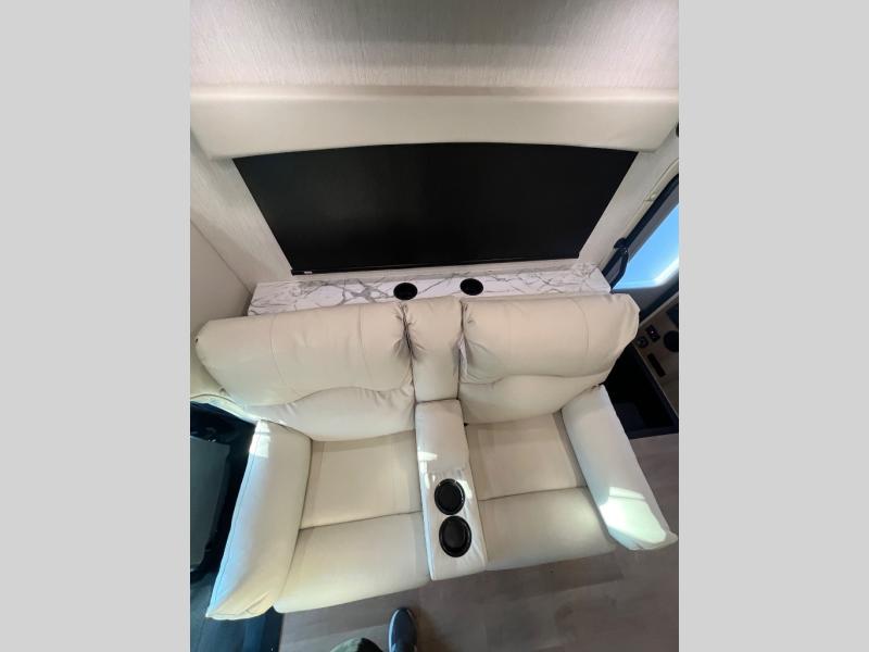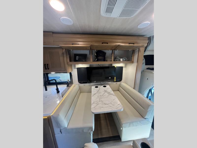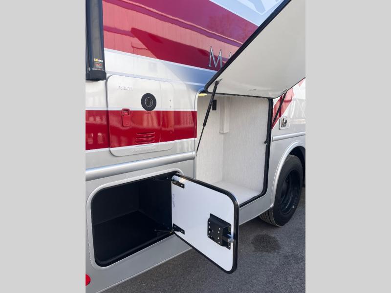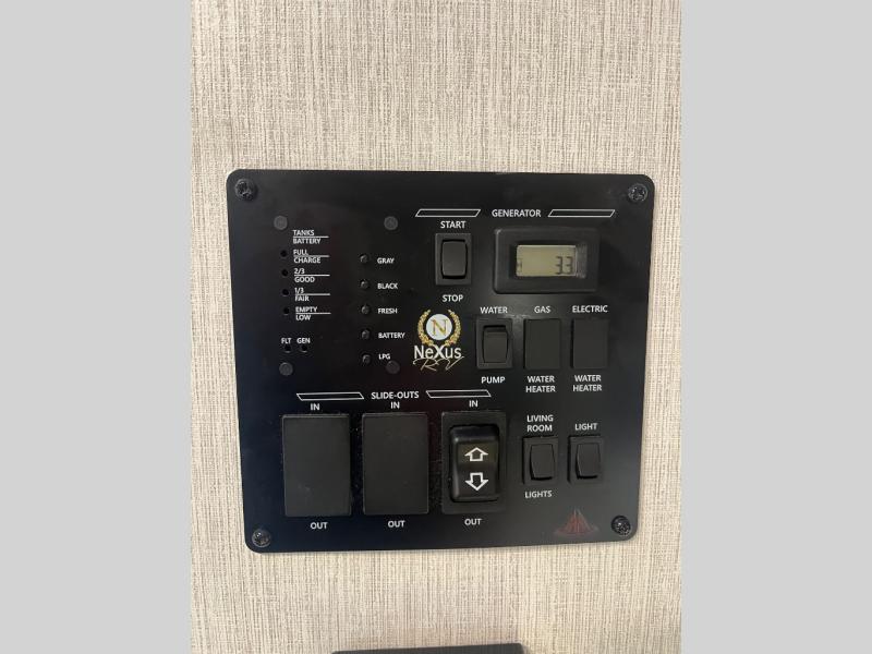 The NeXus RV Maximus Super C Diesel motorhomes combine rugged performance with residential comfort, starting with its impressive 20,000 lb hitch rating and 50,000 lb GCWR, giving you the capability to tow heavy loads with confidence. The exterior stands out with deluxe full-body paint, frameless tinted windows, and a fiberglass front cap with an automotive bonded window, blending durability with sleek, modern styling. Convenience is built in with fully automatic leveling jacks and slam-latch side-hinged compartment doors, making setup and storage effortless wherever you travel. For relaxation, enjoy the electric patio awning with LED lighting and side-view cameras, providing comfort and safety for every adventure on the open road.