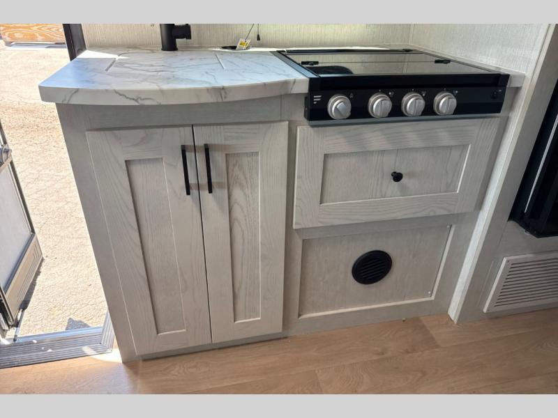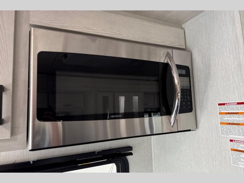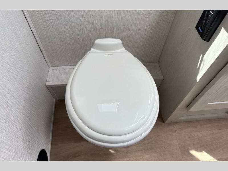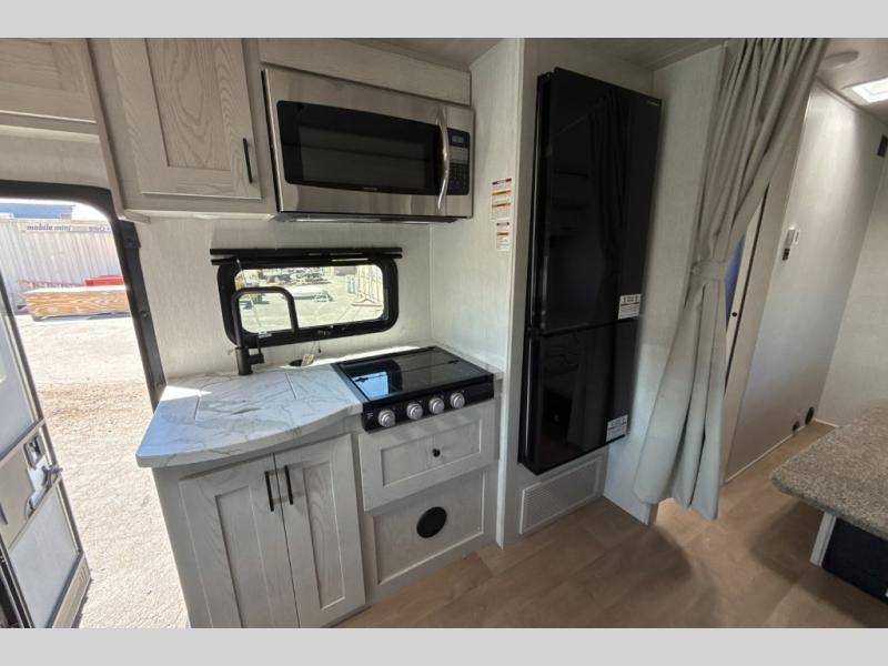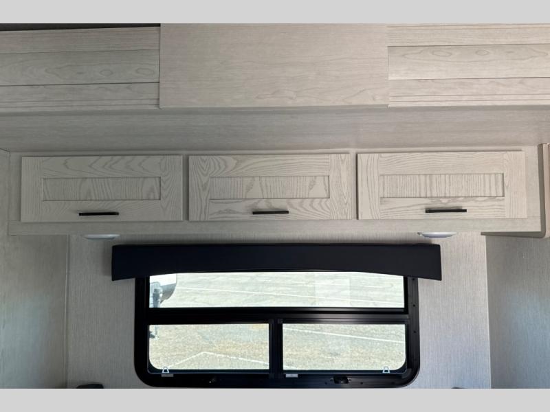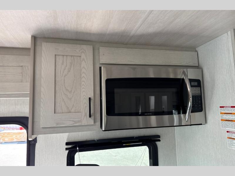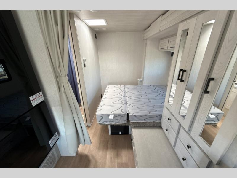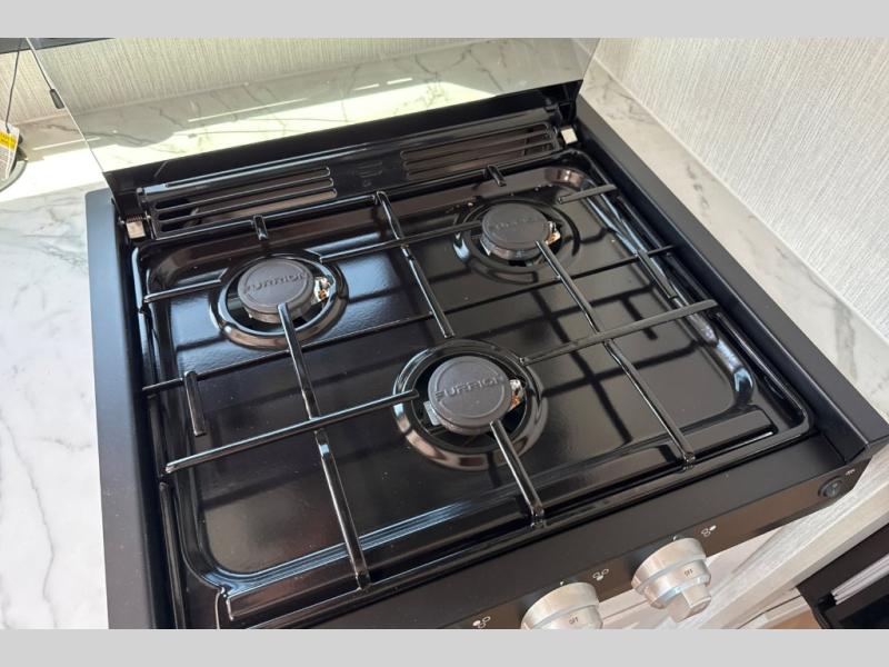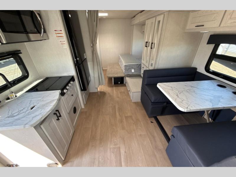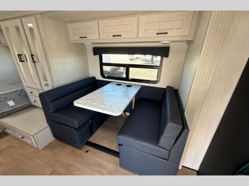Pack your bags and head across the country in this cozy coach! Get a good night's rest each night on the deluxe innerspring 60" x 74" queen bed, and freshen up in the morning with the shower with a skylight in the rear corner bathroom. And there is a wardrobe beside the bed to keep your clothes out of the way too. Grab some eggs from the 10 cu. ft. 12V refrigerator then head to the three burner cooktop to fry them up. You can then enjoy them at the booth dinette within the full-wall slide, which can also transform into an extra sleeping space. The bunk over cab is also another sleeping space or it can be used for storage!