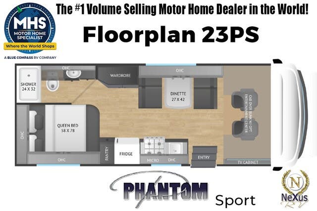 M.S.R.P. $126,473 - All New 2026 Nexus Phantom Sport 23PS RV for Sale at Motor Home Specialist; the #1 Volume Selling Motor Home Dealership in the World. This unit is approximately 25 feet 3 inches in length. It rides on the amazing new Ford® E-Series chassis with a 7.3L V8 engine! Optional features include the phantom sport series value package, convection microwave, soft touch driver and passenger seats, swivel passenger seat, TV in bedroom, roof ladder, aluminum running boards, side view cameras and heated and remote mirrors. This amazing Class C RV also features the Phantom Sport Value Package which includes a fiberglass roof, large 1.6 cu. ft. microwave, 10 cu. ft. 12V refrigerator, high strength low allow steel frame, fiberglass front cap and rear fiberglass radius eyebrow. Strength, Safety and Customer Satisfaction are the 3 cornerstones found in every Nexus RV. The construction of the Nexus RV far exceeds the industry norm. First, and arguable foremost, the Nexus RV boast an all STEEL cage construction instead of the normal aluminum framed construction found in the competition. Steel cage construction is 72% stronger than aluminum and is only common place on RVs such as the Foretravel Realm or a Prevost bus conversion; both of which would have an M.S.R.P. value well over $1 million dollars! That same commitment to strength and safety is found throughout the Nexus line-up. You will also find construction highlights such as 2 layers of Azdel substrate in the sidewalls & roof! The Azdel product provides 3X the insulation value of wood and is 50% lighter which will help optimize your engine’s performance and fuel economy, and because it is not a wood material harvested from the rain forest it is both greener and provides a less that 1% chance of retaining any moisture that could ever lead to wall separation or mold. It is also formaldehyde free, impact resistant and a sound absorbing material creating a much quieter RV. To further protect and insulate the RV from the elements Nexus utilizes high grade UV protected automotive window seals. The roof is a pre-stamped metal roof truss system that is further highlighted by the exterior layer of seamless fiberglass as opposed to the normal TPO or "rubber roofs" found in most RVs built today. The steel roof is also designed to incorporate Nexus RV's Easy-Flow Air Distribution system. This HVAC ducting is a tried-and-true system that provides more evenly distributed A/C throughout the coach as well as helps promote cleaner air and reduce allergens. Shop hundreds of class C gas RVs at 1 location! Choose from Fleetwood Altitude - Gulf Stream BT Cruiser - Thor Chateau - Four Winds - Geneva and Quantum - Entegra Coach Odyssey Odyssey SE and Esteem - East to West Entrada - Forest River Forester - Forester LE - Nexus Phantom - Viper and much more. We also sell quality pre-owned models such as Jayco Greyhawk – Redhawk - Redhawk SE - Thor Magnitude - Winnebago Spirit - and Minnie Winnie - Coachmen Freelander and Leprechaun - Forest River Sunseeker Classic - Sunseeker LE – Solera - Holiday Rambler Incline and much more. Visit MHSRV.com for our complete line-up and the sale prices that have made us the #1 volume selling motor home dealership in the world 12 years in a row! For more complete details on this unit and our entire inventory including brochures, window sticker, videos, photos, reviews & testimonials as well as additional information about Motor Home Specialist and our manufacturers please visit us at MHSRV.com or call 800-335-6054. All sale prices include a multi-point inspection, interior & exterior wash, detail service and a fully automated high-pressure rain booth test and coach wash that is a standout service unlike that of any other in the industry. You will also receive a thorough coach orientation with an MHSRV technician, a night stay in our delivery park featuring landscaped and covered pads with full hook-ups and much more! Read Thousands upon Thousands of 5-Star Reviews at MHSRV.com and see what they had to say about their experience at Motor Home Specialist. MHSRV.com or 800-335-6054 - Why Pay More? Why Settle for Less?