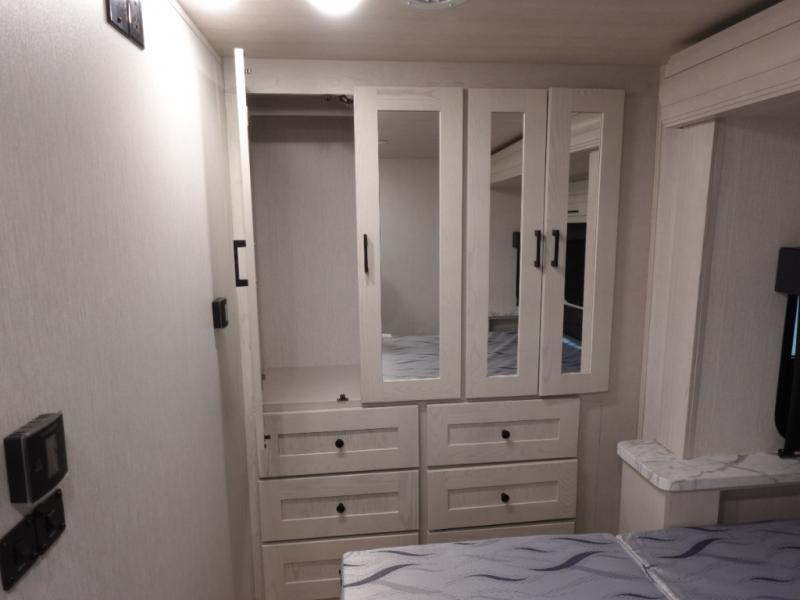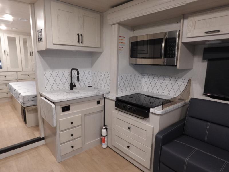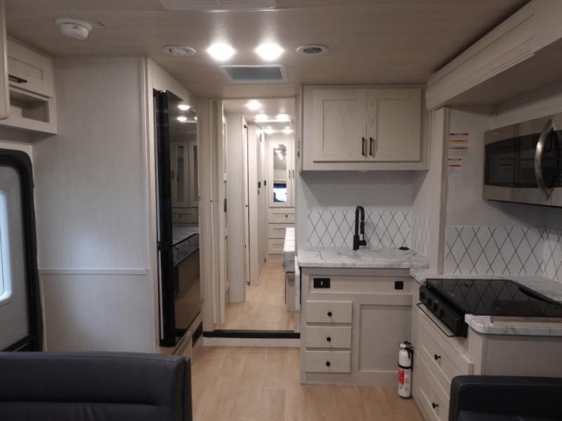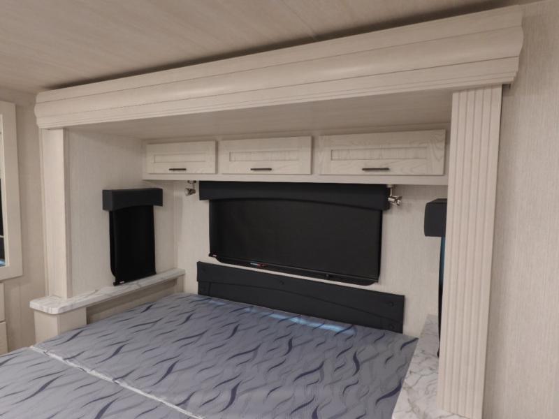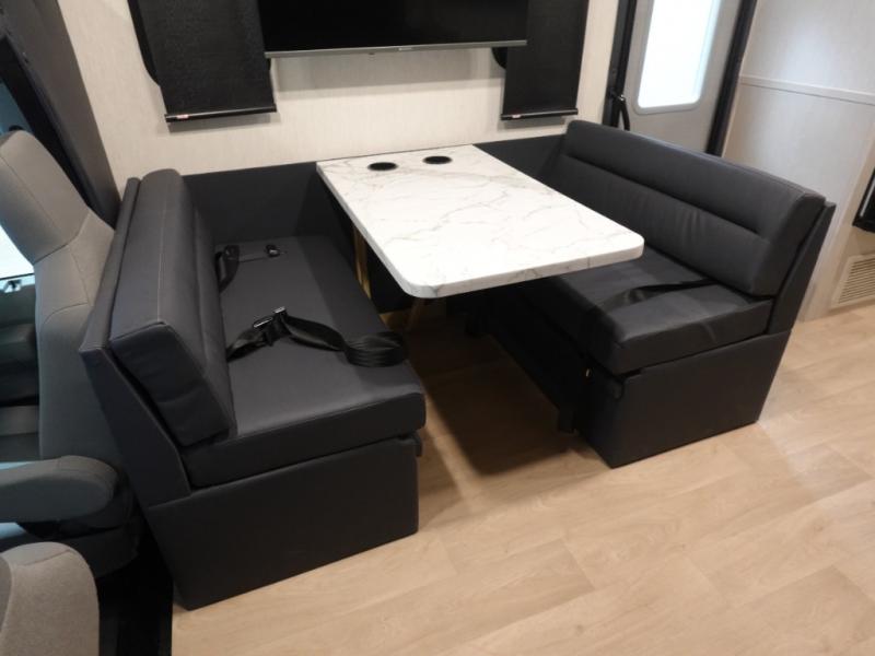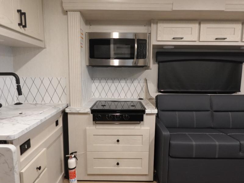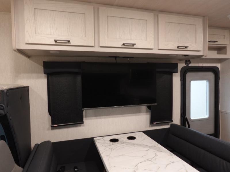 Experience your best vacations in this motorhome! You and your spouse will enjoy having your own private bedroom with a 72" x 74" king bed slide and a wardrobe to store your clothes. Next to the bedroom is the rear corner bathroom which has a 24" x 32" shower with a skylight and an area to add the optional washer and dryer combo. Prepare your best home cooked meals with the three burner cooktop and the residential 10 cu. ft. refrigerator with 1,000 watt inverter, and enjoy them at the booth dinette which can transform into an extra sleeping space. Speaking of sleeping spaces, you can also use the bunk over cab as a sleeping spot and transform the 64" hide-a-bed sofa into a sleeping space too!