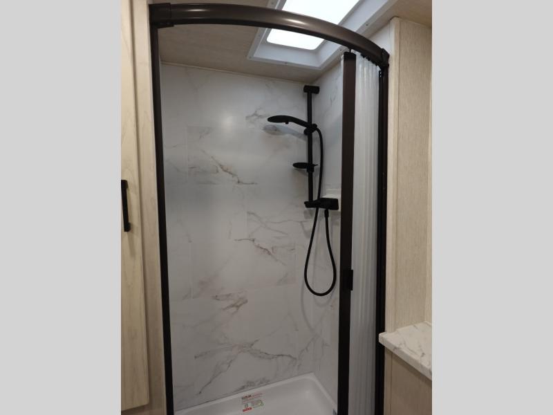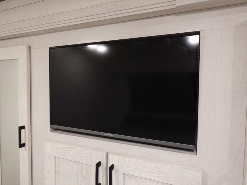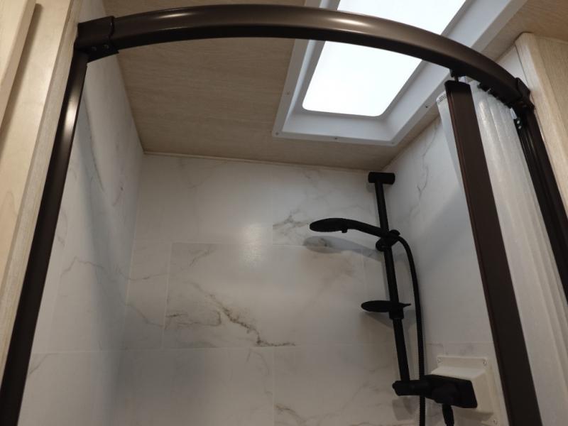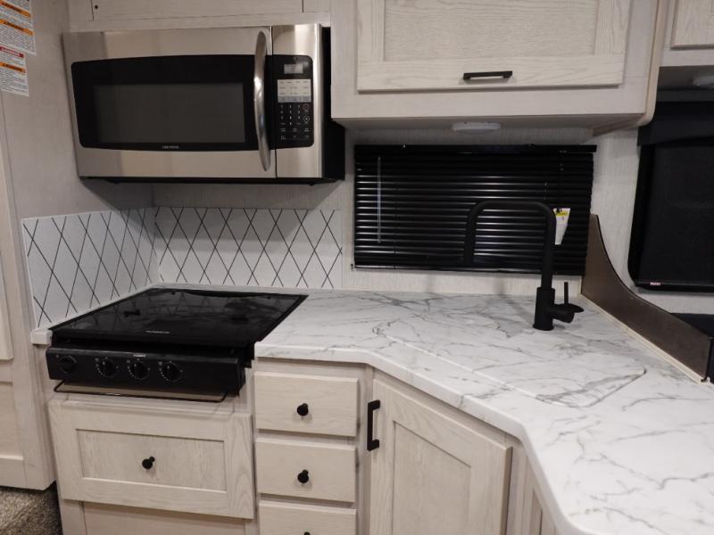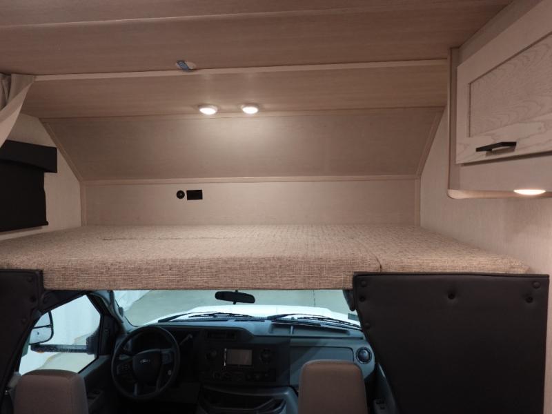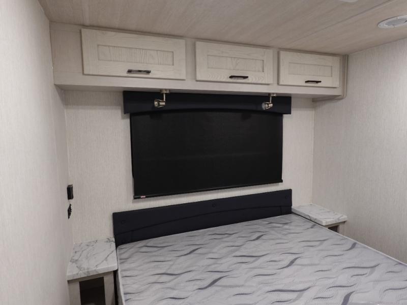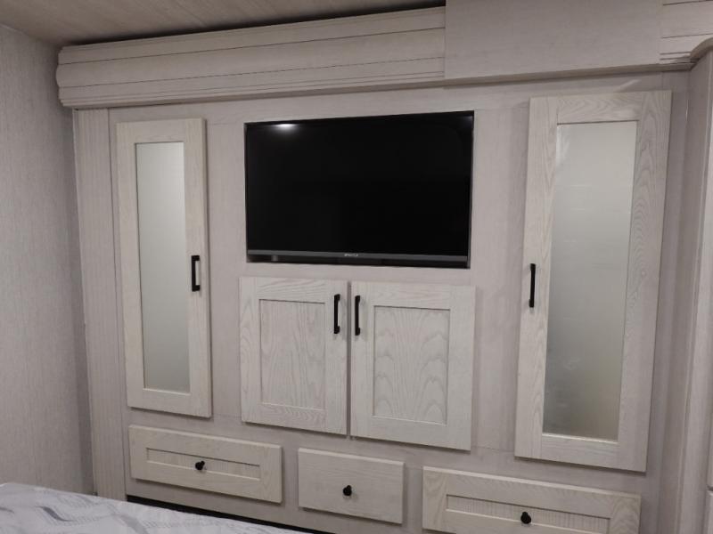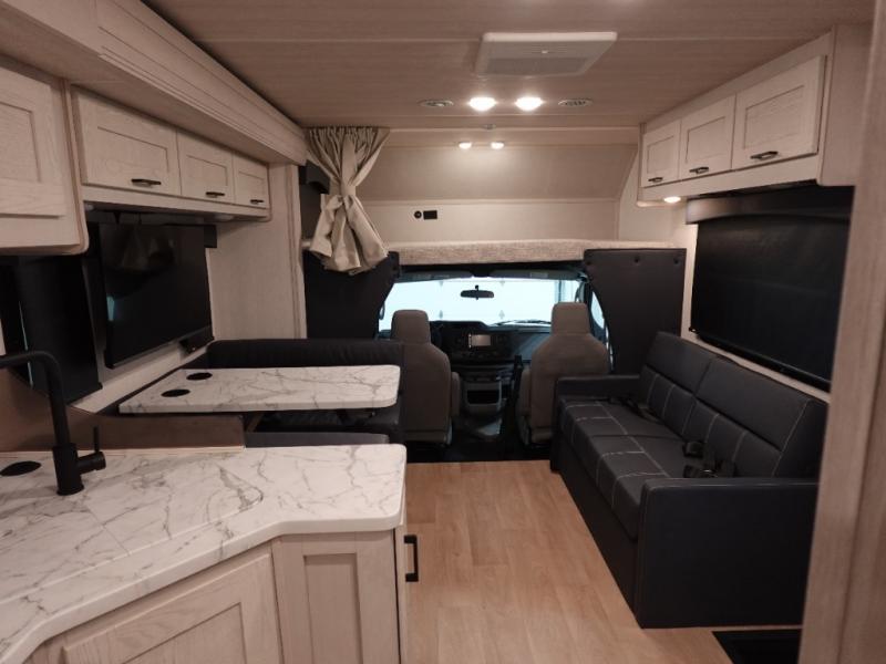 You won't want to travel any other way once you step inside this motorhome! The rear private bedroom has a bed with a deluxe innerspring mattress across from a TV, a dresser, and a closet to keep your clothes looking nice. With two linen closets in the full bathroom, you will be able to keep your towels and toiletries out of the way. You won't have to eat fast food either thanks to the three burner stovetop, 10 cu. ft. 12V residential refrigerator with 1,000 watt inverter, and over the range microwave for popcorn on movie night. The bunk over cab and booth dinette offer extra sleeping spaces for more to join in on the adventure too. There is also an outside shower to rinse your feet off before tracking mud throughout the unit!
