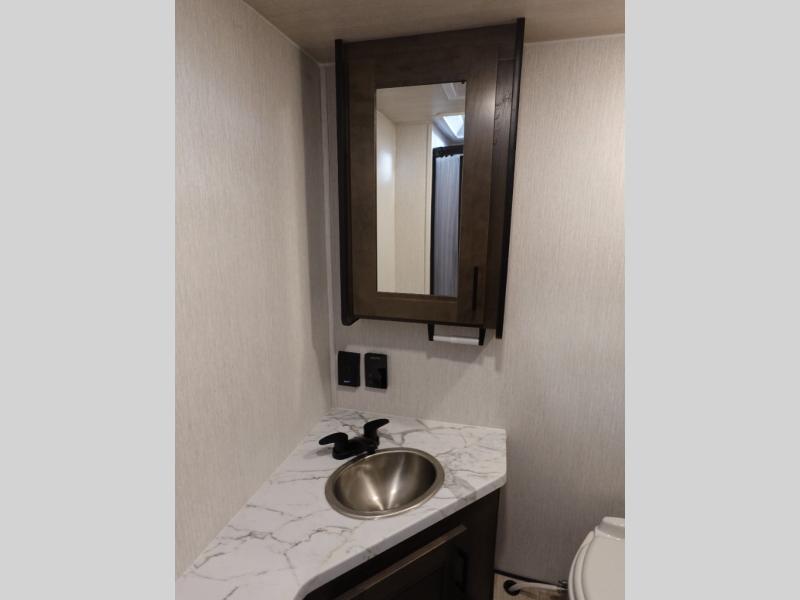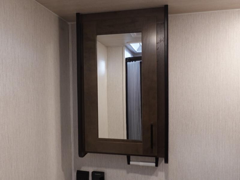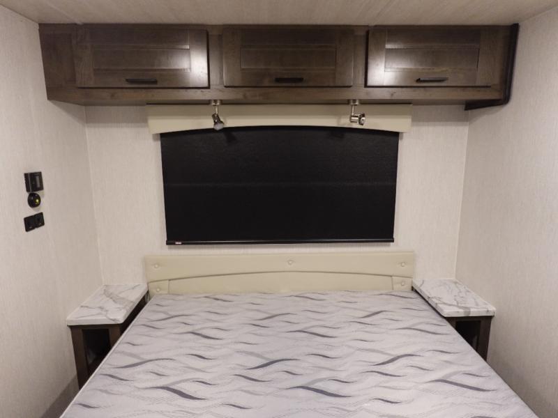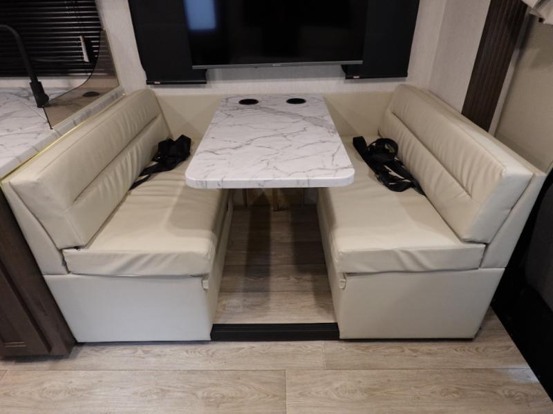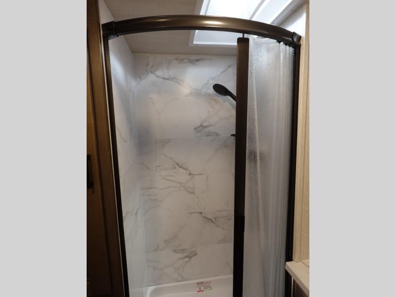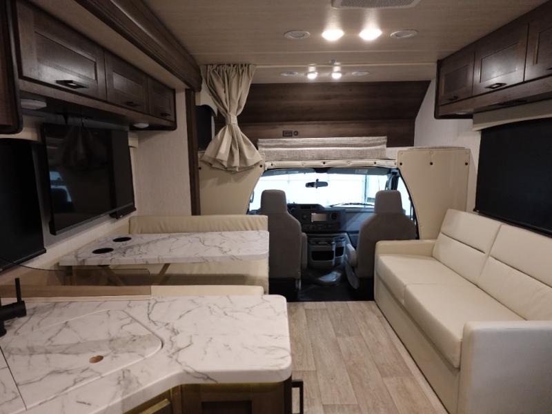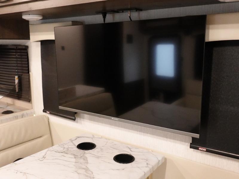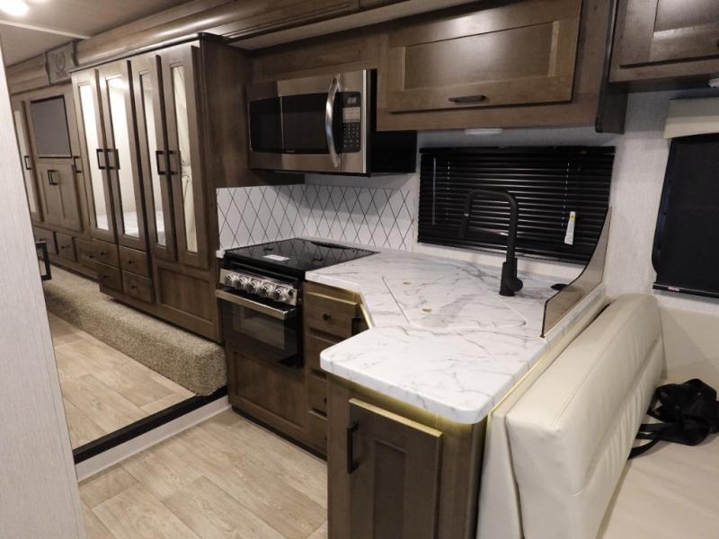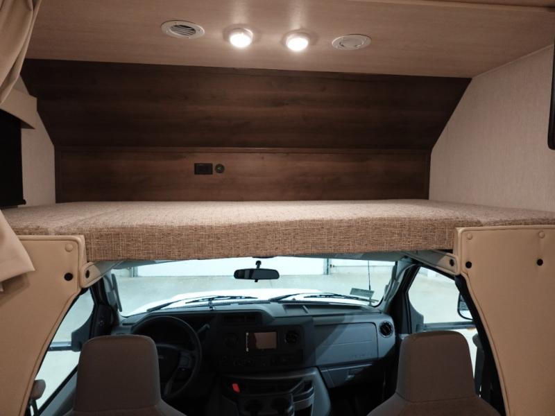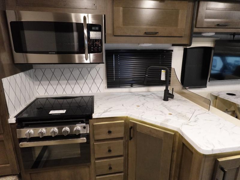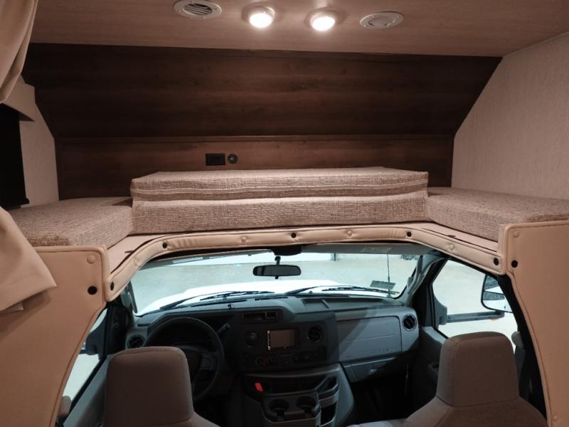 You won't want to travel any other way once you step inside this motorhome! The rear private bedroom has a bed with a deluxe innerspring mattress across from a TV, a dresser, and a closet to keep your clothes looking nice. With two linen closets in the full bathroom, you will be able to keep your towels and toiletries out of the way. You won't have to eat fast food either thanks to the three burner stovetop, 10 cu. ft. 12V residential refrigerator with 1,000 watt inverter, and over the range microwave for popcorn on movie night. The bunk over cab and booth dinette offer extra sleeping spaces for more to join in on the adventure too. There is also an outside shower to rinse your feet off before tracking mud throughout the unit!