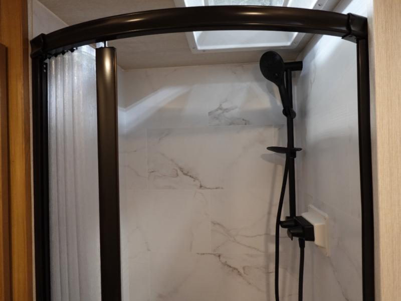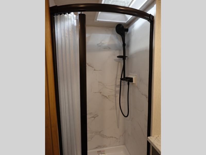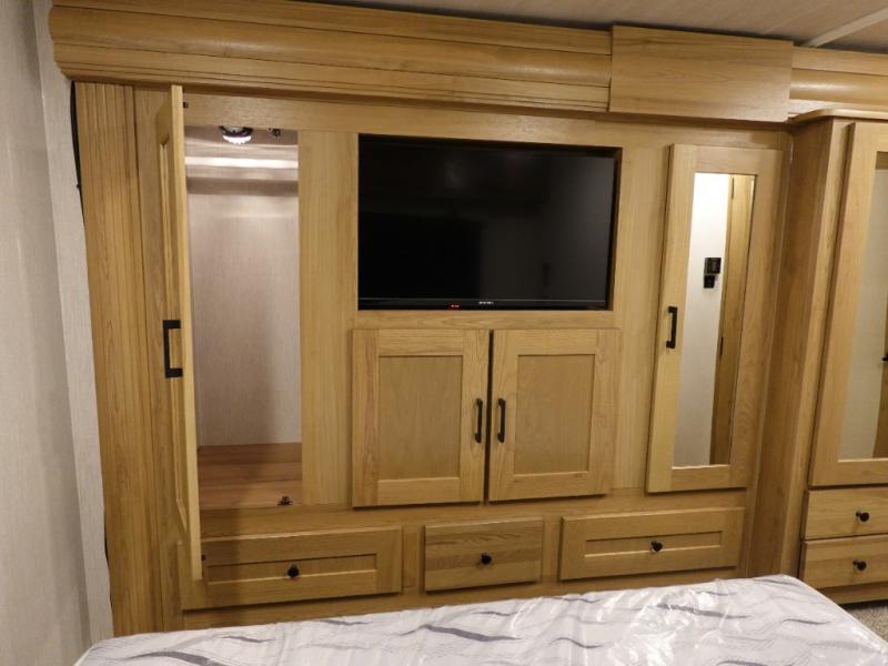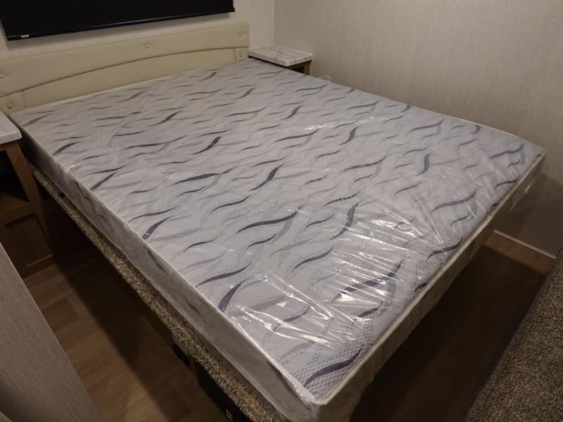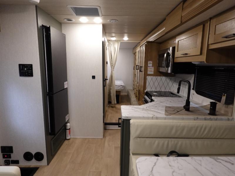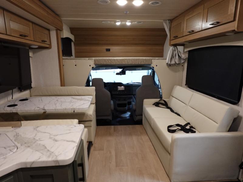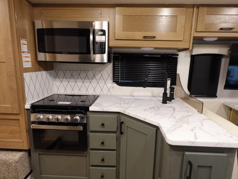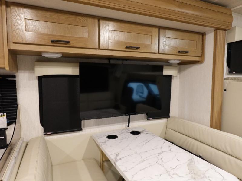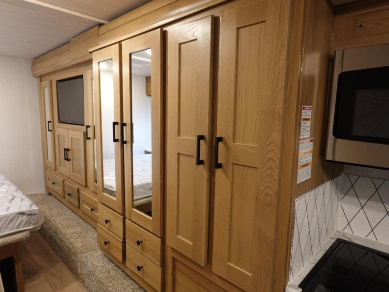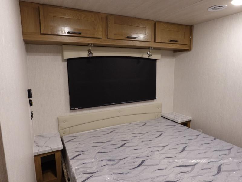 You won't want to travel any other way once you step inside this motorhome! The rear private bedroom has a bed with a deluxe innerspring mattress across from a TV, a dresser, and a closet to keep your clothes looking nice. With two linen closets in the full bathroom, you will be able to keep your towels and toiletries out of the way. You won't have to eat fast food either thanks to the three burner stovetop, 10 cu. ft. 12V residential refrigerator with 1,000 watt inverter, and over the range microwave for popcorn on movie night. The bunk over cab and booth dinette offer extra sleeping spaces for more to join in on the adventure too. There is also an outside shower to rinse your feet off before tracking mud throughout the unit!