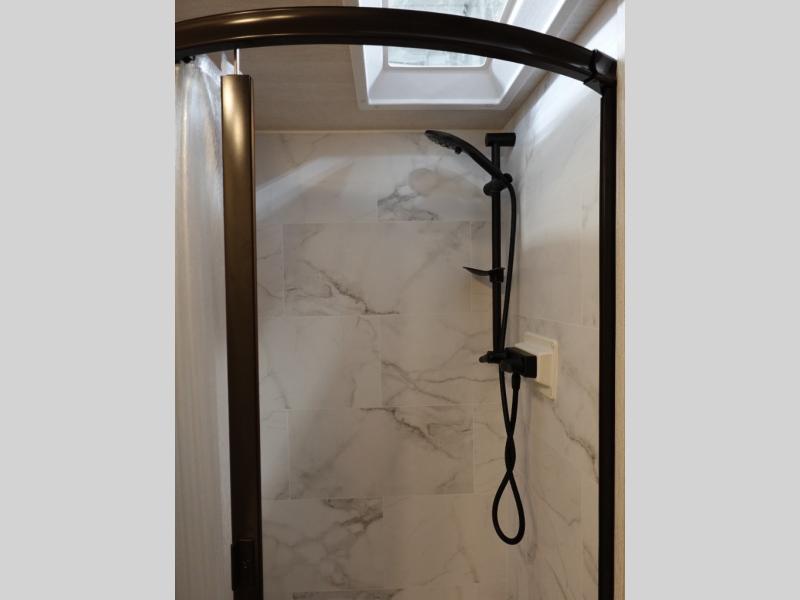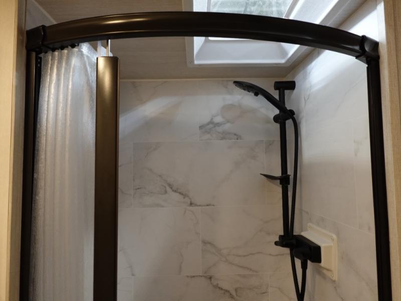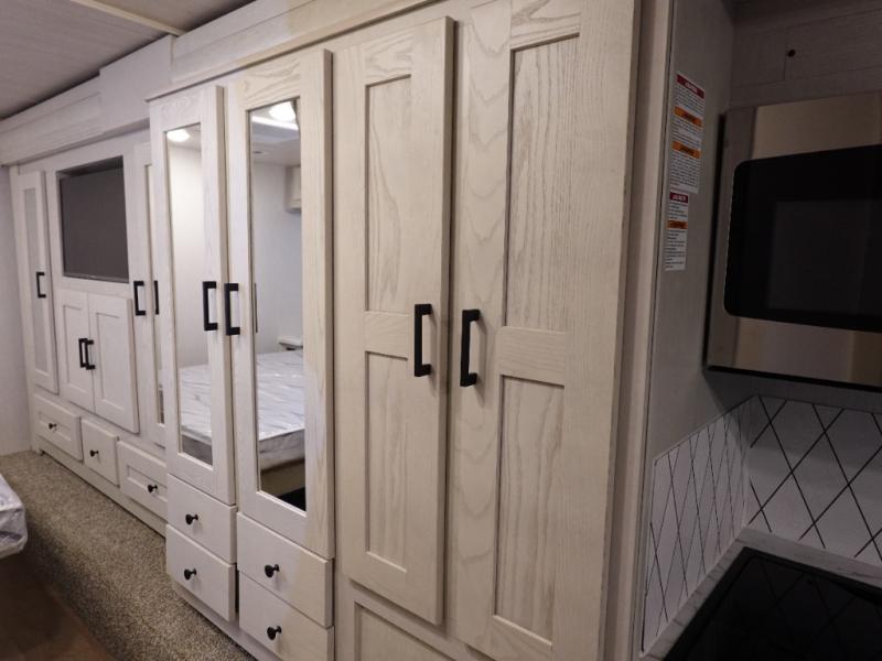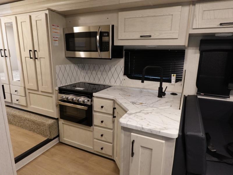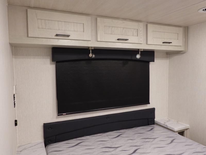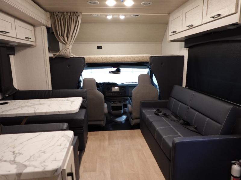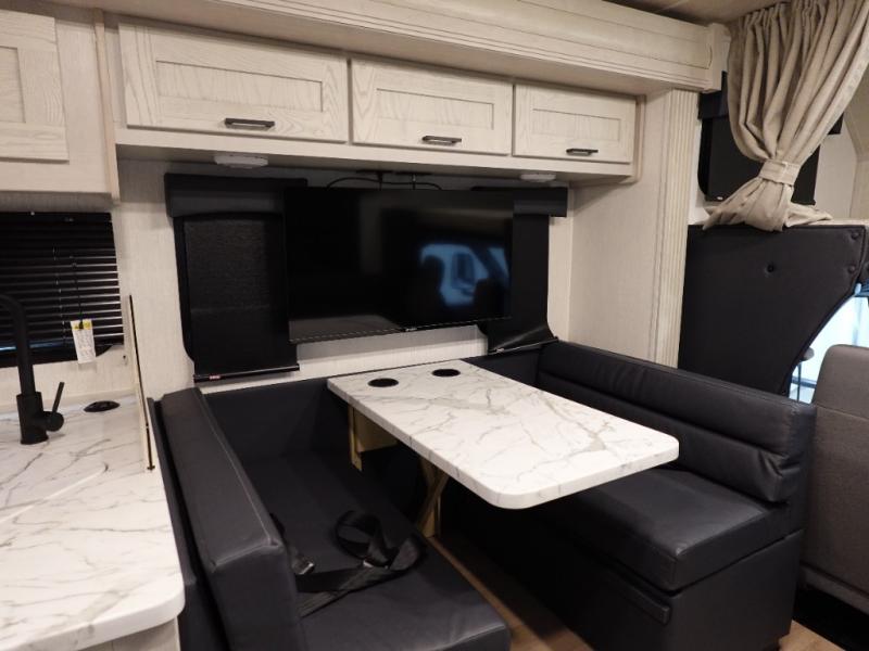 You won't want to travel any other way once you step inside this motorhome! The rear private bedroom has a bed with a deluxe innerspring mattress across from a TV, a dresser, and a closet to keep your clothes looking nice. With two linen closets in the full bathroom, you will be able to keep your towels and toiletries out of the way. You won't have to eat fast food either thanks to the three burner stovetop, 10 cu. ft. 12V residential refrigerator with 1,000 watt inverter, and over the range microwave for popcorn on movie night. The bunk over cab and booth dinette offer extra sleeping spaces for more to join in on the adventure too. There is also an outside shower to rinse your feet off before tracking mud throughout the unit!