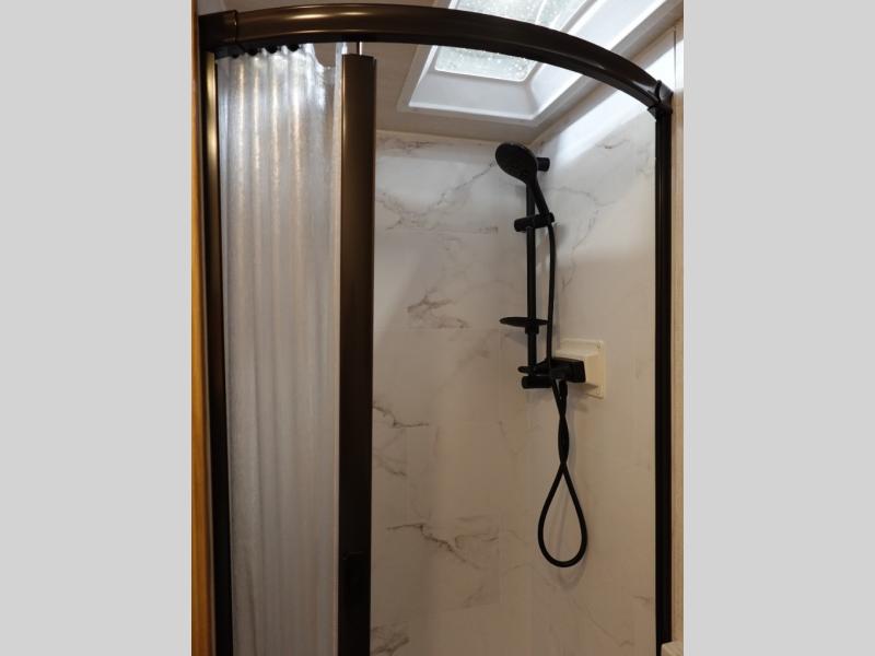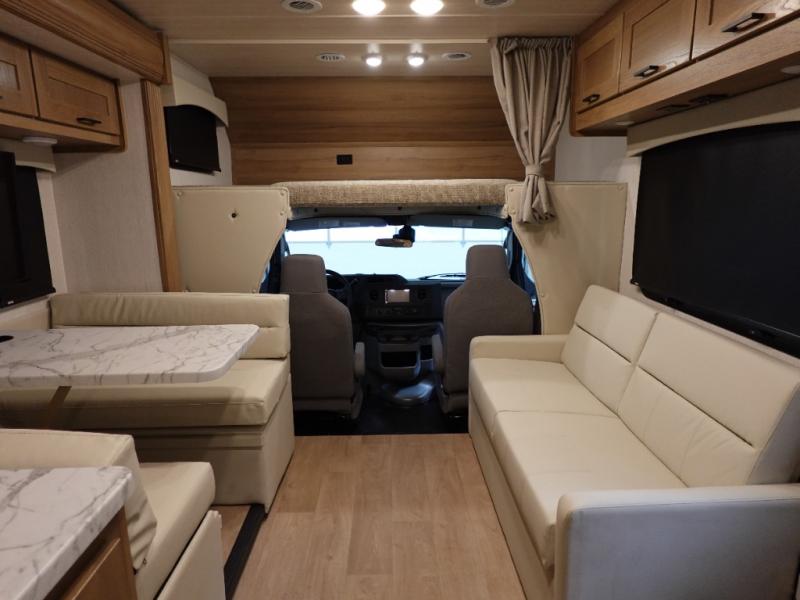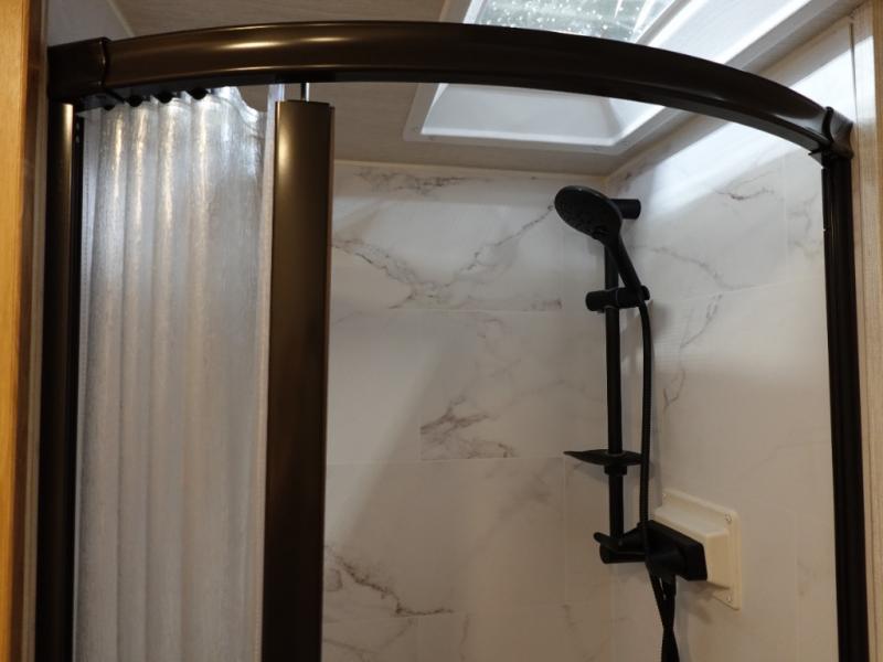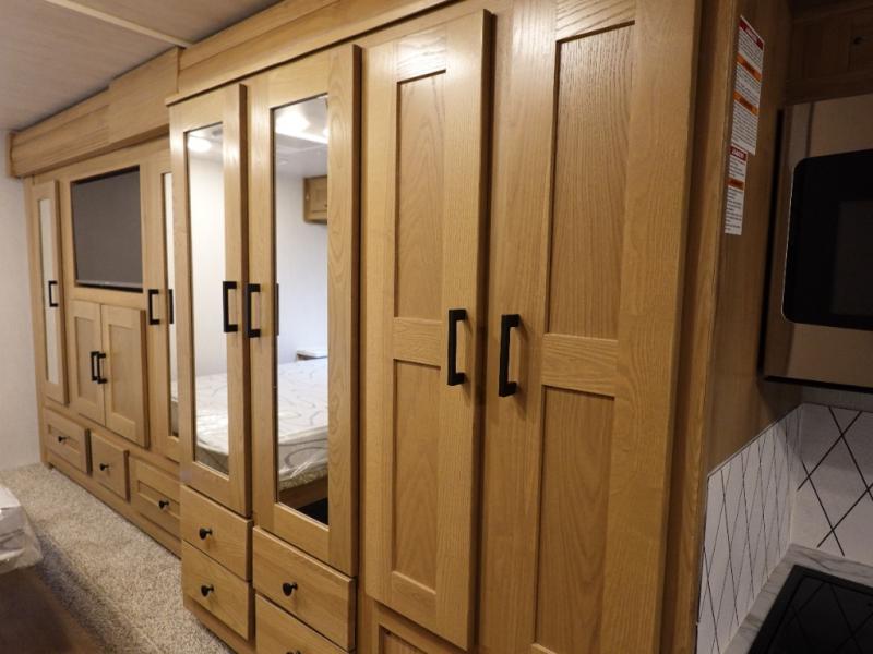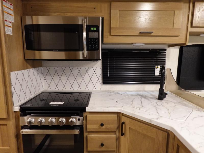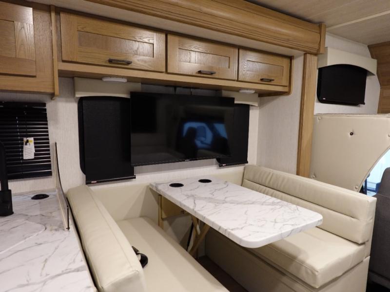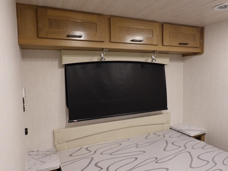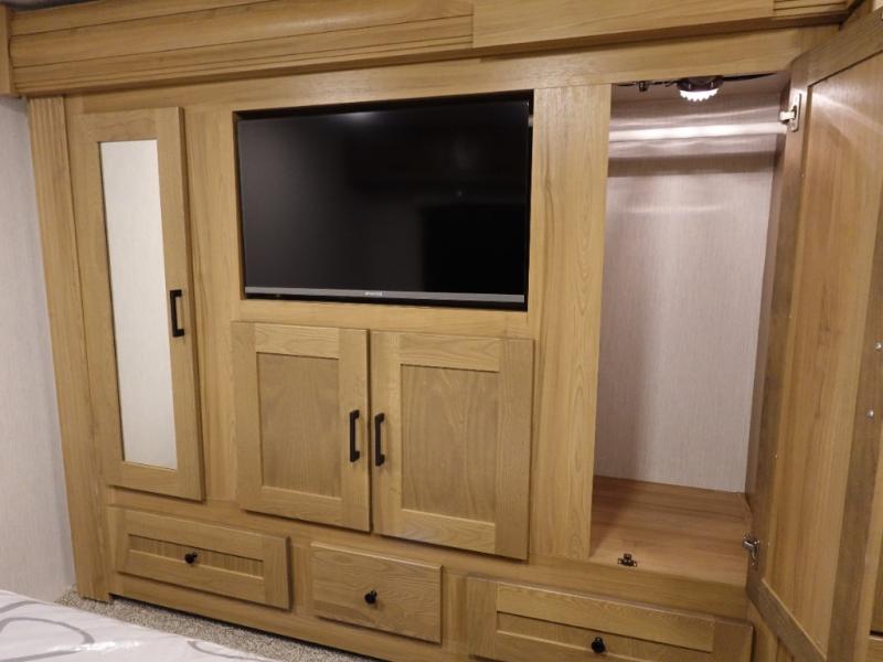You won't want to travel any other way once you step inside this motorhome! The rear private bedroom has a bed with a deluxe innerspring mattress across from a TV, a dresser, and a closet to keep your clothes looking nice. With two linen closets in the full bathroom, you will be able to keep your towels and toiletries out of the way. You won't have to eat fast food either thanks to the three burner stovetop, 10 cu. ft. 12V residential refrigerator with 1,000 watt inverter, and over the range microwave for popcorn on movie night. The bunk over cab and booth dinette offer extra sleeping spaces for more to join in on the adventure too. There is also an outside shower to rinse your feet off before tracking mud throughout the unit!