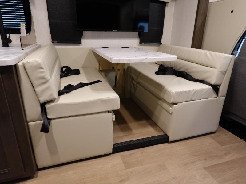 You won't want to travel any other way once you step inside this motorhome! The rear private bedroom has a bed with a deluxe innerspring mattress across from a TV, a dresser, and a closet to keep your clothes looking nice. With two linen closets in the full bathroom, you will be able to keep your towels and toiletries out of the way. You won't have to eat fast food either thanks to the three burner stovetop, 10 cu. ft. 12V residential refrigerator with 1,000 watt inverter, and over the range microwave for popcorn on movie night. The bunk over cab and booth dinette offer extra sleeping spaces for more to join in on the adventure too. There is also an outside shower to rinse your feet off before tracking mud throughout the unit!