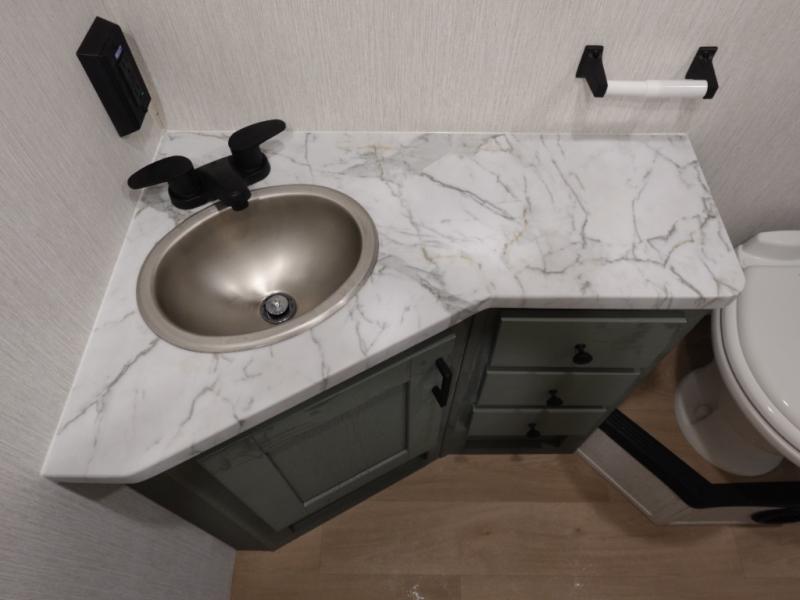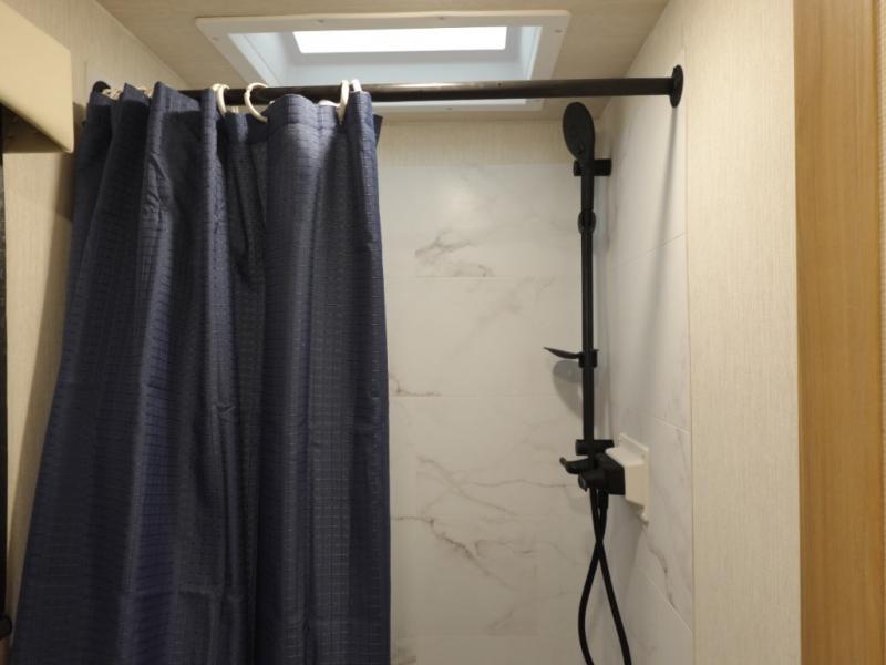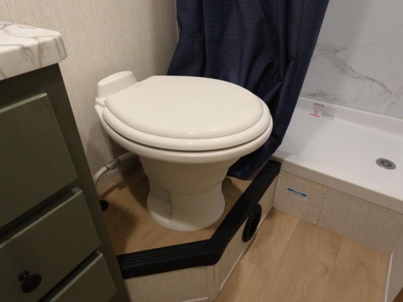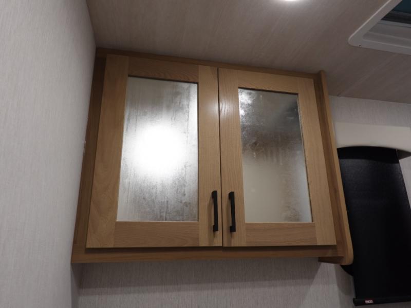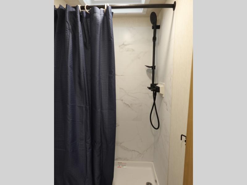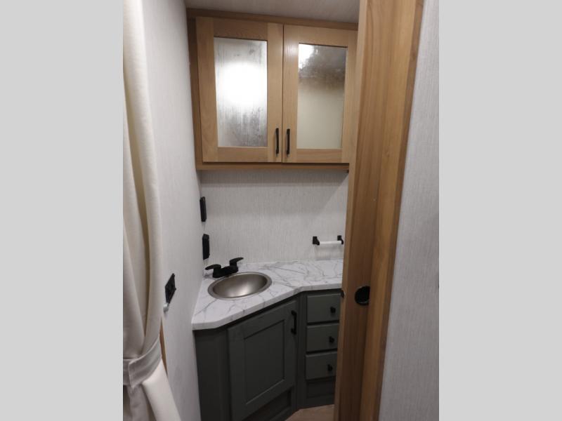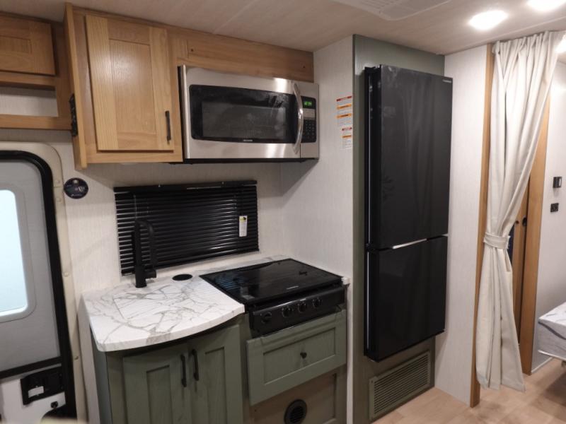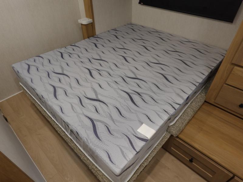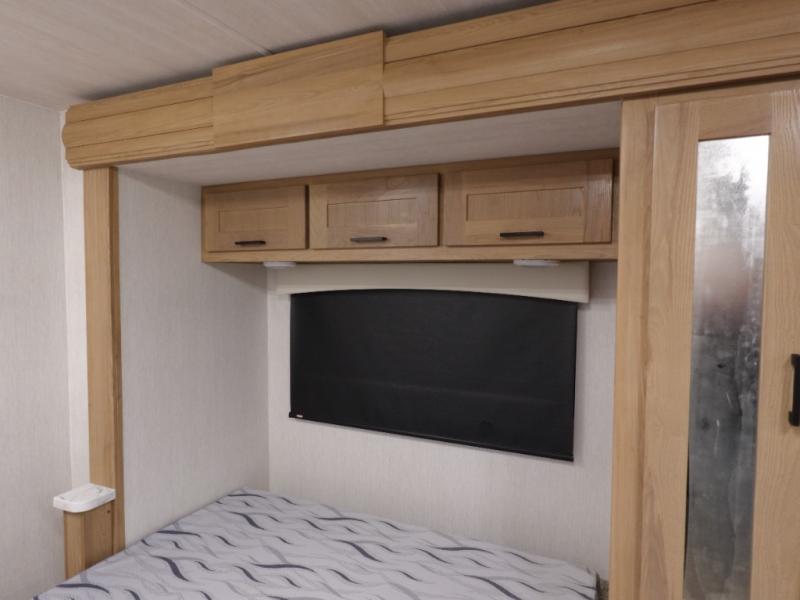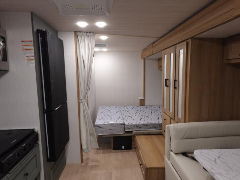 Pack your bags and head across the country in this cozy coach! Get a good night's rest each night on the deluxe innerspring 60" x 74" queen bed, and freshen up in the morning with the shower with a skylight in the rear corner bathroom. And there is a wardrobe beside the bed to keep your clothes out of the way too. Grab some eggs from the 10 cu. ft. 12V refrigerator then head to the three burner cooktop to fry them up. You can then enjoy them at the booth dinette within the full-wall slide, which can also transform into an extra sleeping space. The bunk over cab is also another sleeping space or it can be used for storage!