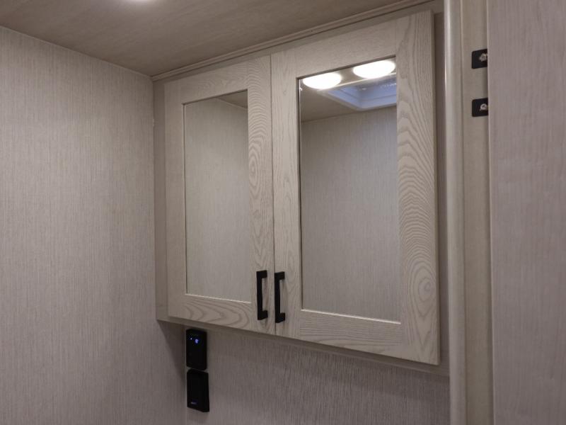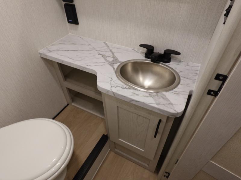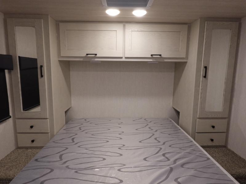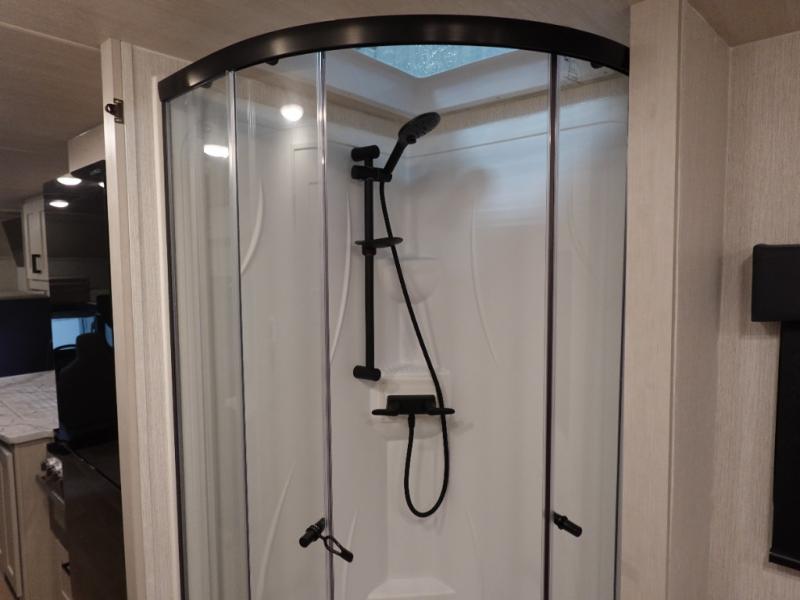 If you're looking for a little more space and comfort, this coach is the one! You'll love waking up in the rear bedroom each night that includes a walk-around bed and dual wardrobes for your things. There is a split-style bath that includes a toilet and sink on one side and a radius shower on the other so two can freshen up at once. The main living area is made spacious thanks to the large slide out, and here you'll find the sofa and booth dinette which are perfect for relaxing, dining, and additional sleeping space. There is also a cab-over bunk or optional entertainment center depending on your needs. And a full kitchen, complete with a three burner cooktop, residential microwave, and 12V refrigerator will let you create meals each day!