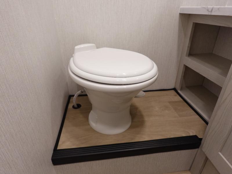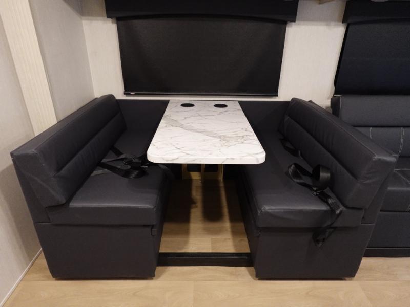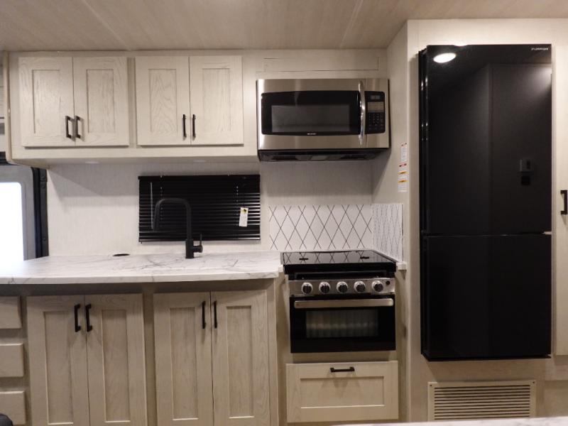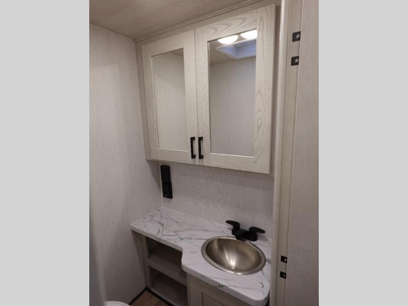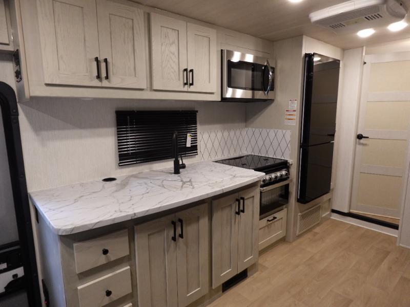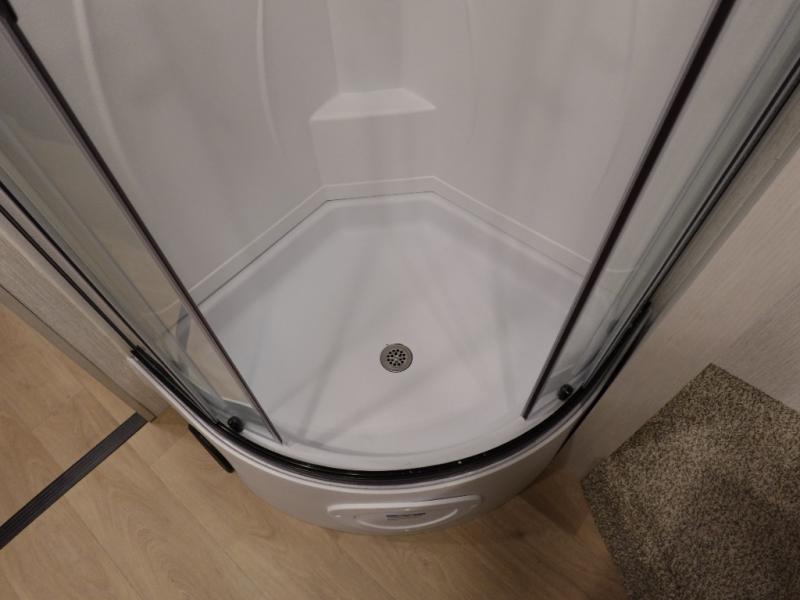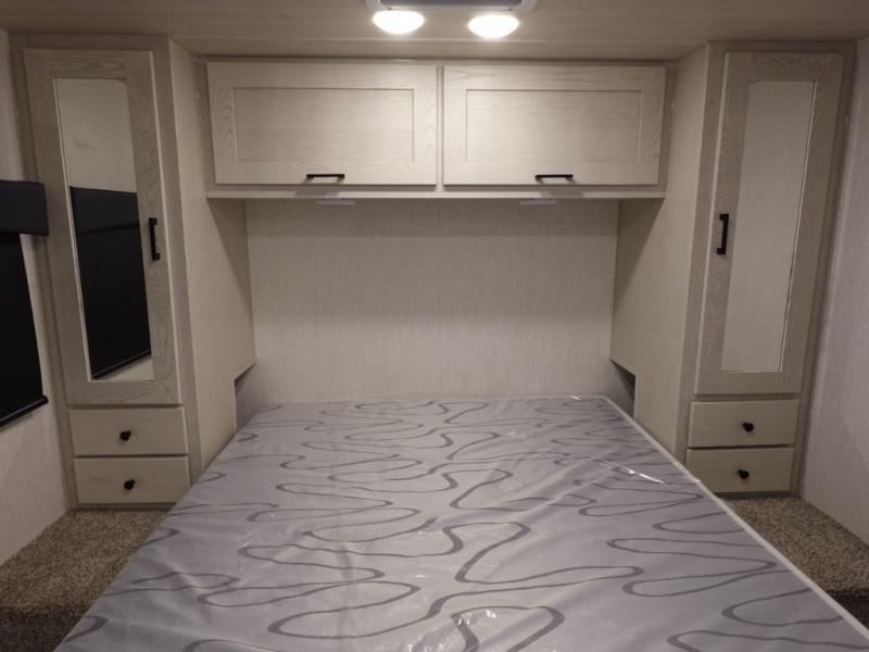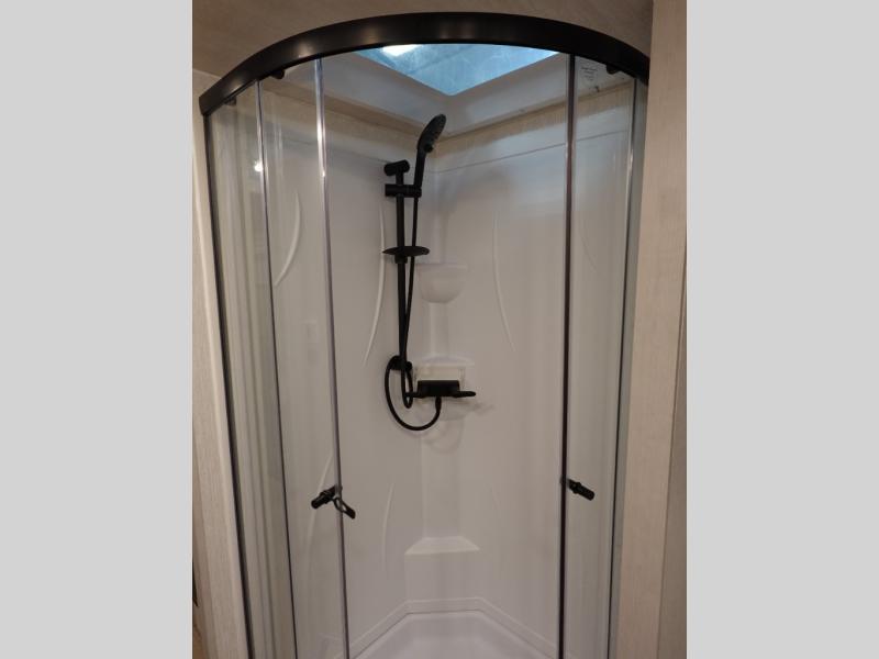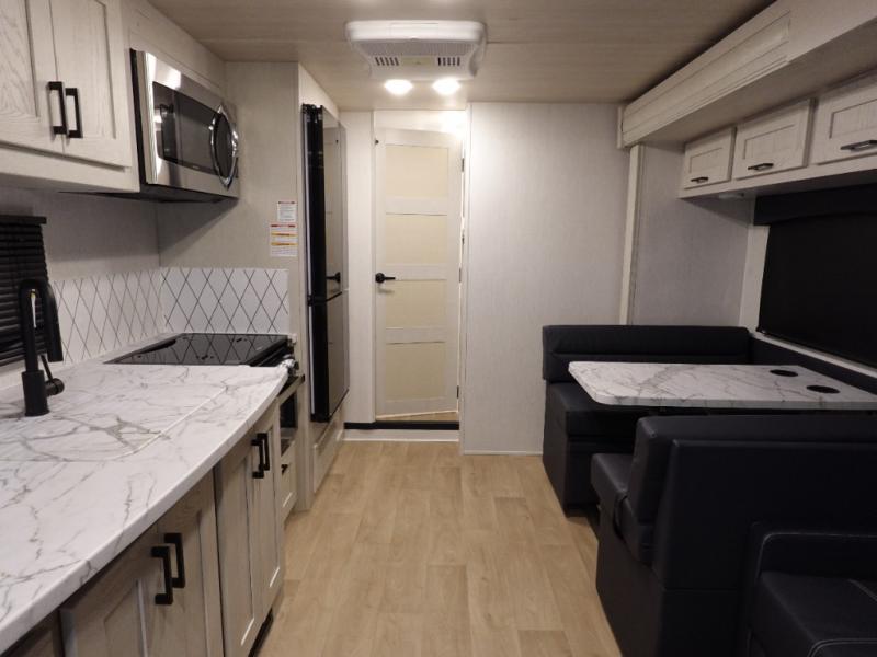 If you're looking for a little more space and comfort, this coach is the one! You'll love waking up in the rear bedroom each night that includes a walk-around bed and dual wardrobes for your things. There is a split-style bath that includes a toilet and sink on one side and a radius shower on the other so two can freshen up at once. The main living area is made spacious thanks to the large slide out, and here you'll find the sofa and booth dinette which are perfect for relaxing, dining, and additional sleeping space. There is also a cab-over bunk or optional entertainment center depending on your needs. And a full kitchen, complete with a three burner cooktop, residential microwave, and 12V refrigerator will let you create meals each day!