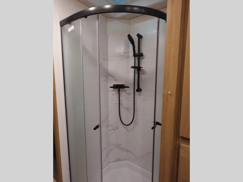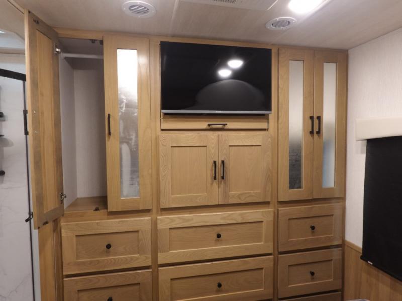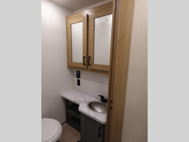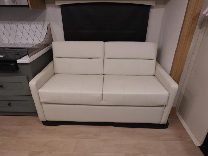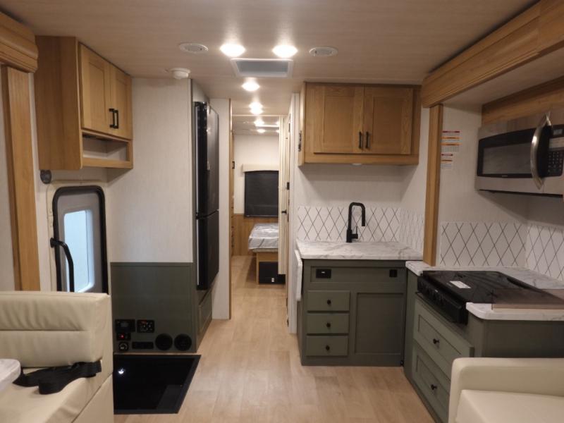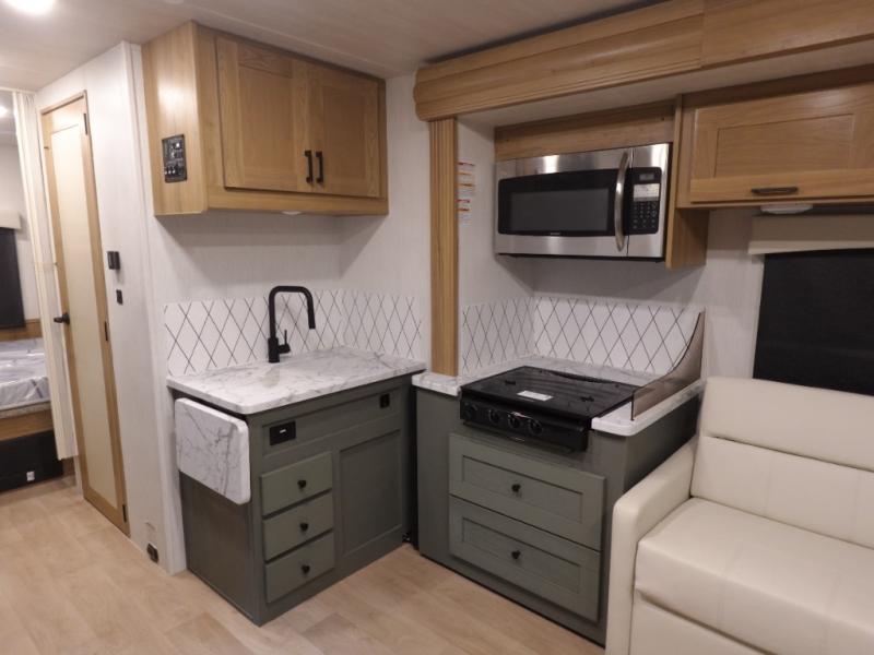 This spacious coach is perfect for road trips both near and far! There are dual opposing slides in the main living area, along with a sofa and booth dinette for seating, dining, and sleeping space for guests. You'll find your own queen bed slide in the rear bedroom, and there is a wardrobe for your things. A split-style bath features a private toilet and sink on one side and a shower on the other so two people can freshen up at once. A full kitchen with a three burner range and microwave oven lets you make meals each day, and another fun addition to this model is the cabover bunk!