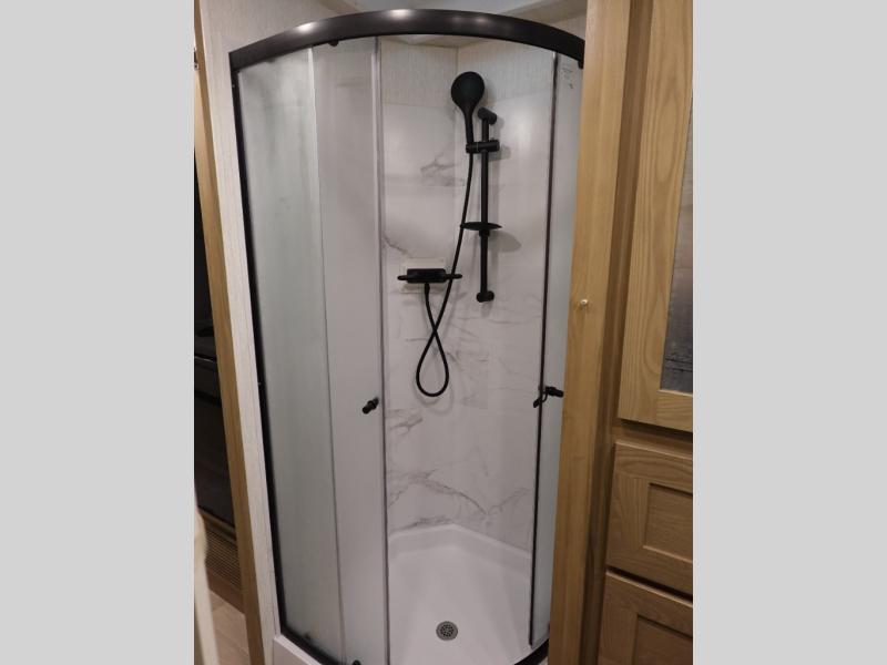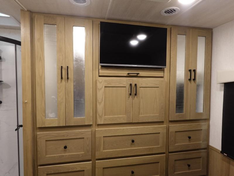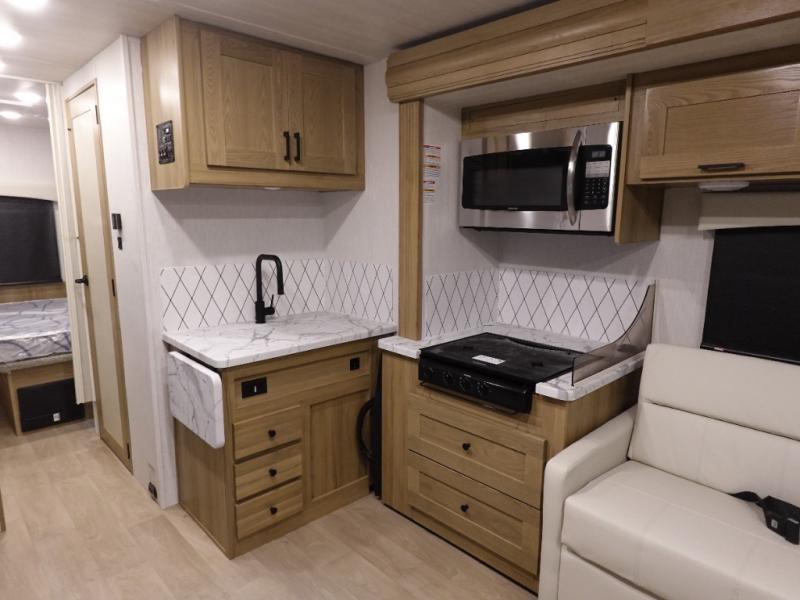 This spacious coach is perfect for road trips both near and far! There are dual opposing slides in the main living area, along with a sofa and booth dinette for seating, dining, and sleeping space for guests. You'll find your own queen bed slide in the rear bedroom, and there is a wardrobe for your things. A split-style bath features a private toilet and sink on one side and a shower on the other so two people can freshen up at once. A full kitchen with a three burner range and microwave oven lets you make meals each day, and another fun addition to this model is the cabover bunk!