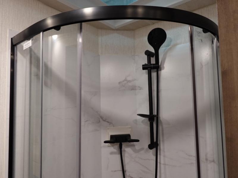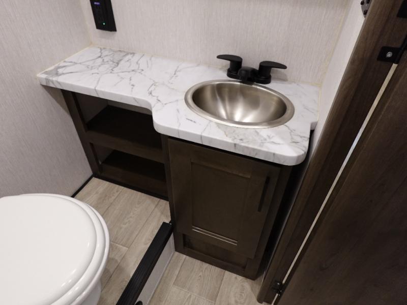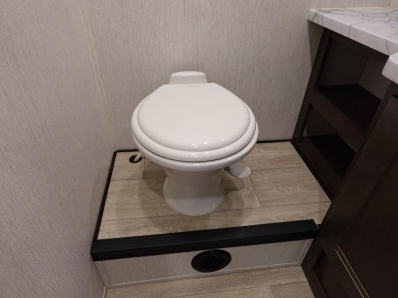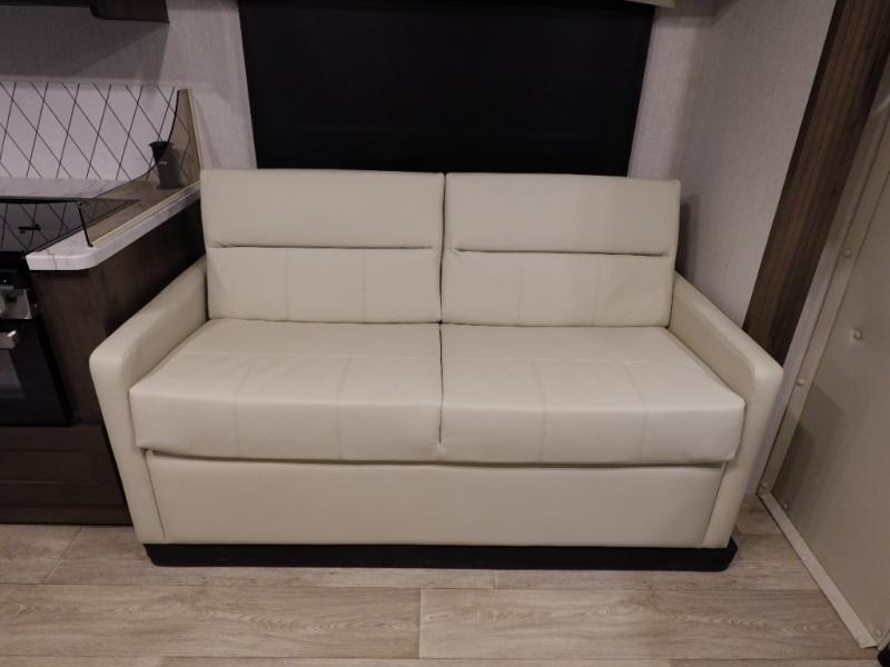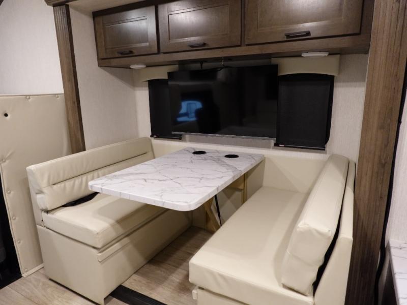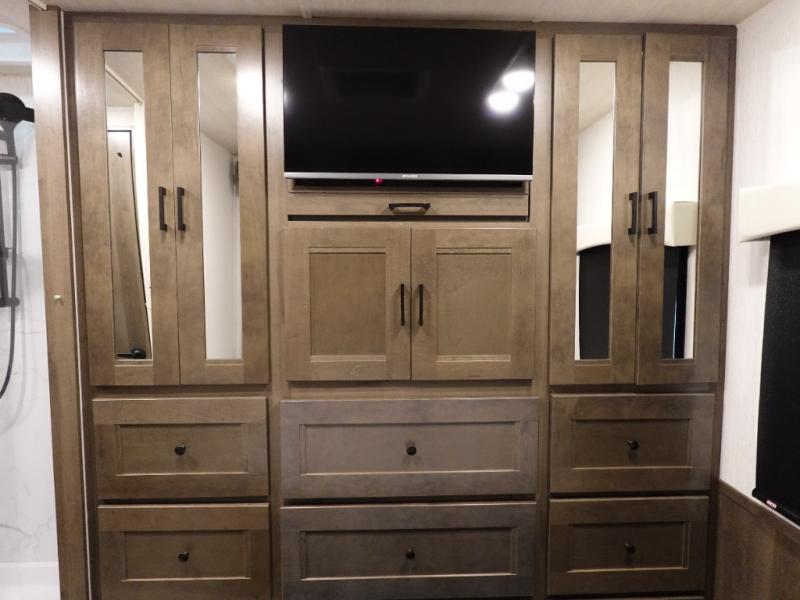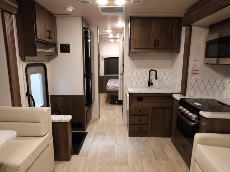 This spacious coach is perfect for road trips both near and far! There are dual opposing slides in the main living area, along with a sofa and booth dinette for seating, dining, and sleeping space for guests. You'll find your own queen bed slide in the rear bedroom, and there is a wardrobe for your things. A split-style bath features a private toilet and sink on one side and a shower on the other so two people can freshen up at once. A full kitchen with a three burner range and microwave oven lets you make meals each day, and another fun addition to this model is the cabover bunk!