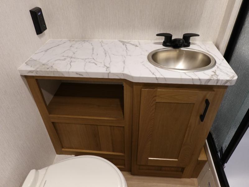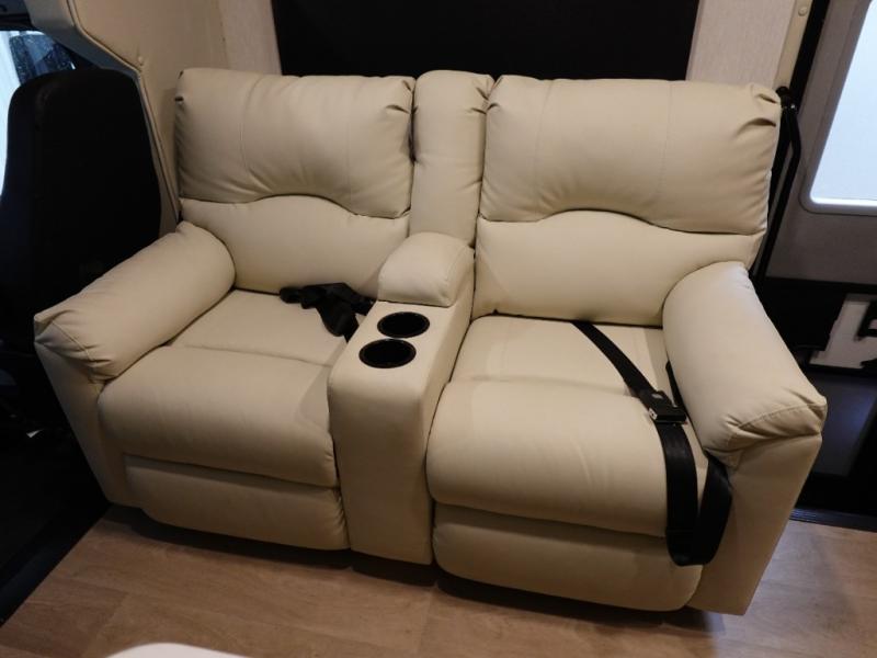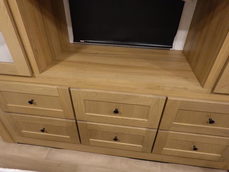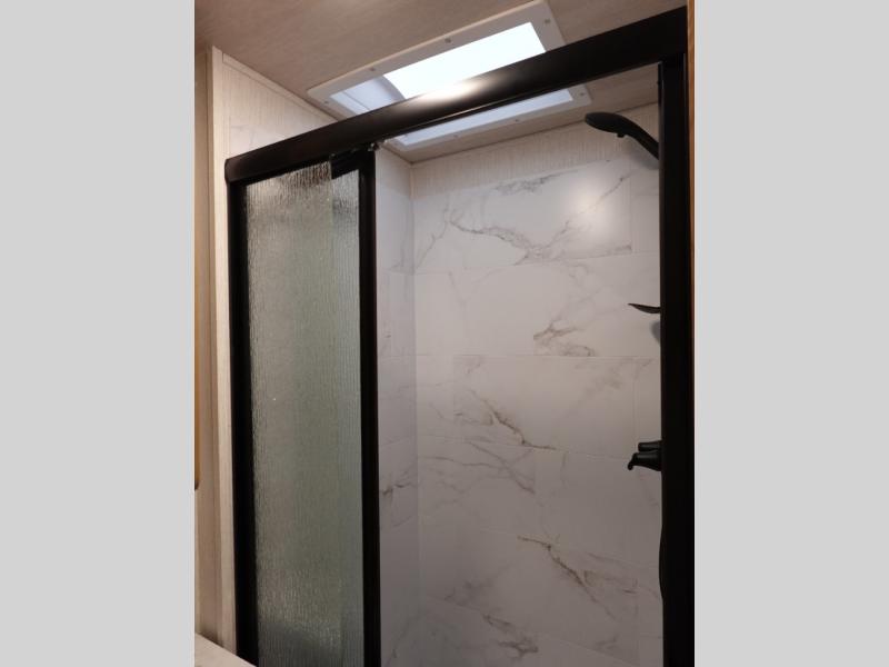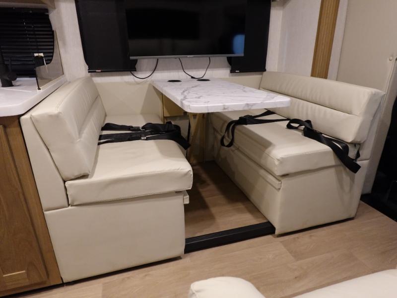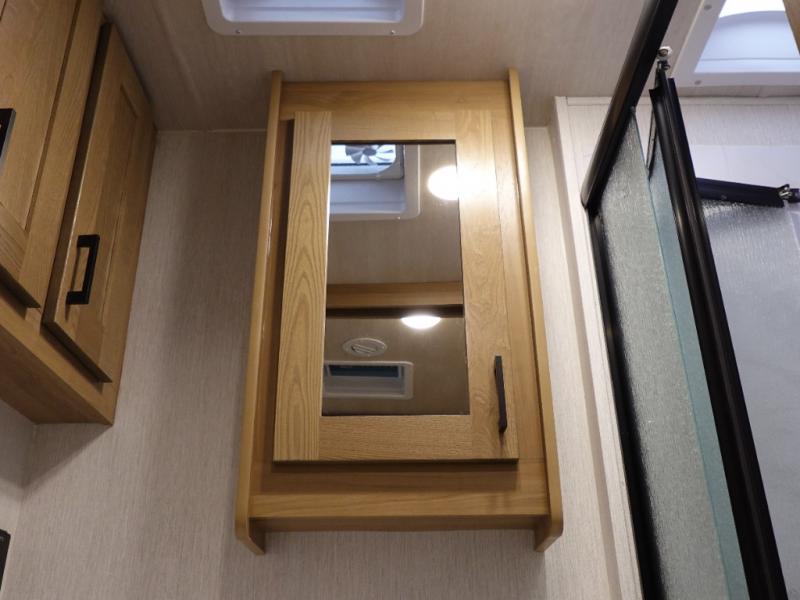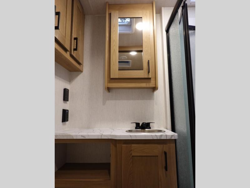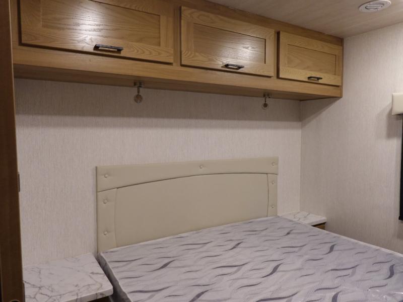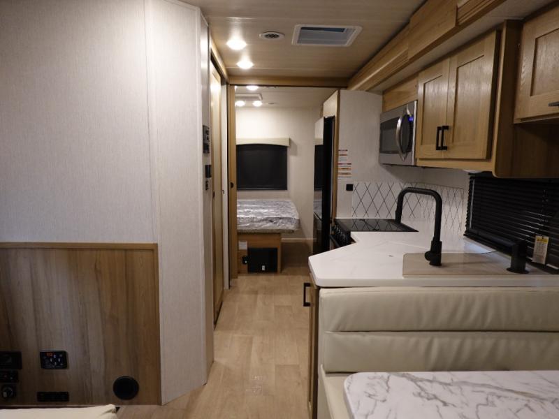 The full-wall slide on this coach is what will make it feel more open, just like at home! You can prepare meals on the three burner cooktop, or in the stainless steel microwave. There is a booth dinette to dine at and a 10 cu. ft. 12V refrigerator to store your leftovers. A sofa will also provide seating and sleeping space, along with the bunk over cab! This model includes a full bath with a shower skylight, electric roof vent, and a large medicine cabinet to store your things. When you're ready for bed, head to the rear bedroom for a great night's rest on the bed and there is bedroom wardrobe to keep your items tidy!