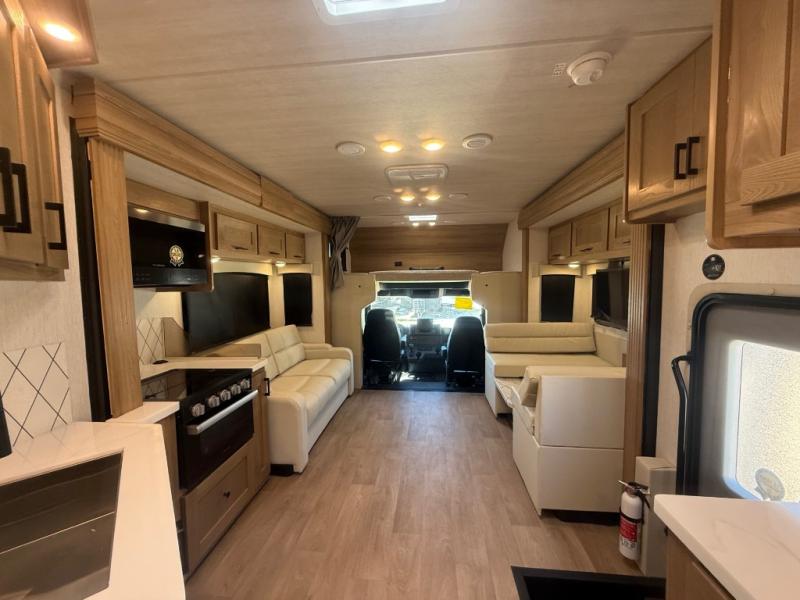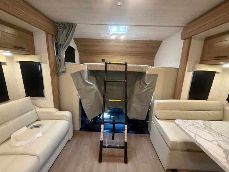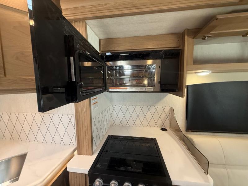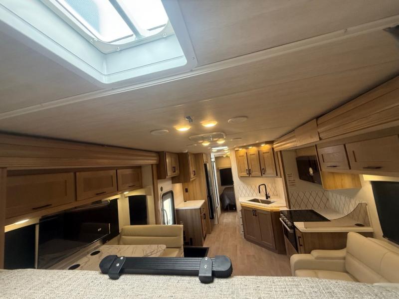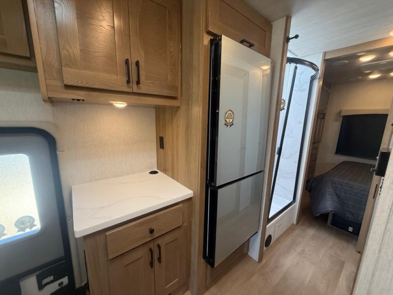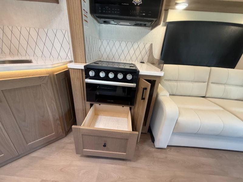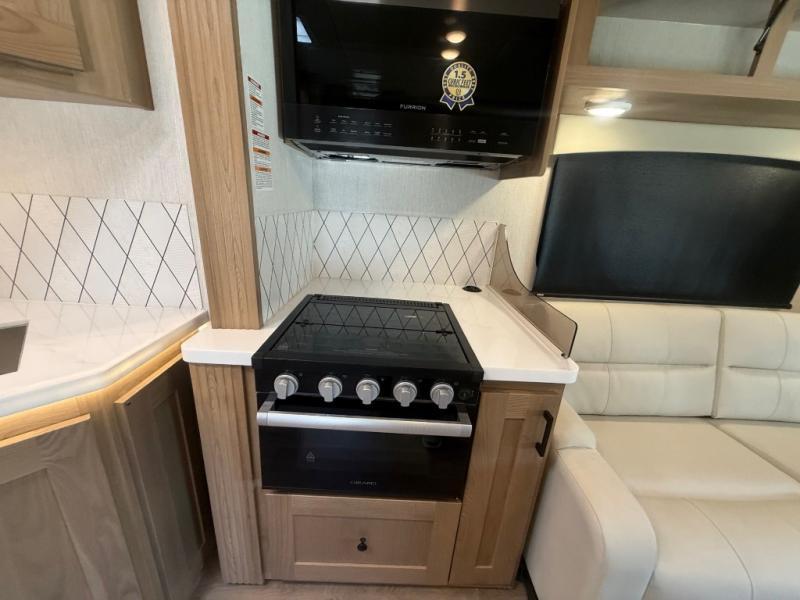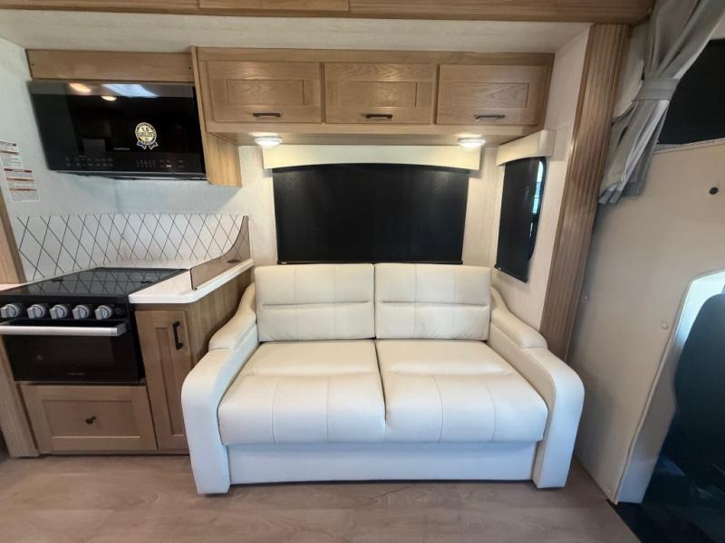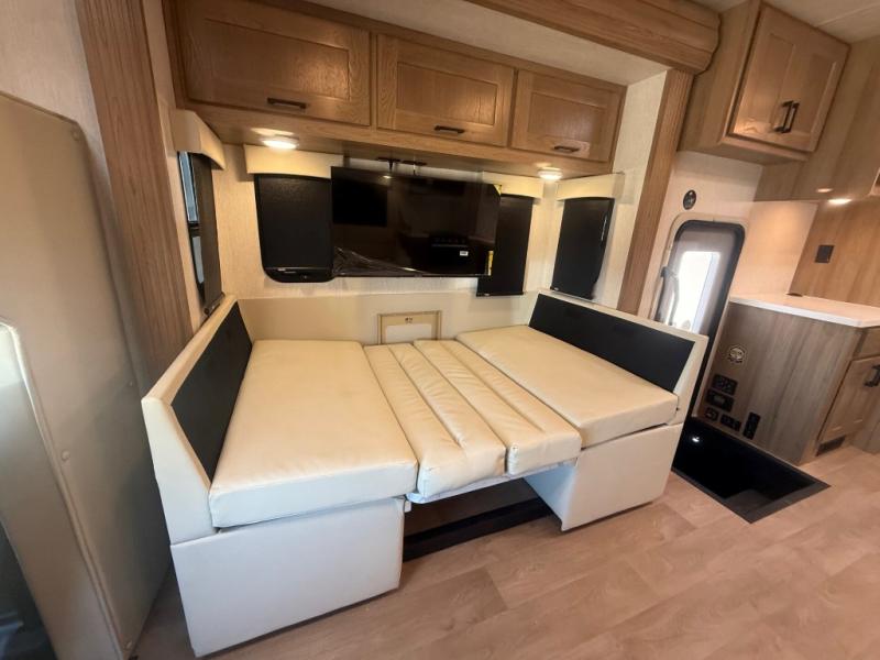 The interior living space is nice and open with three slides in this motorhome! There are plenty of sleeping spaces between the bunk over cab with an optional entertainment center to add, the queen bed slide in the rear private bedroom, and the deluxe tri-fold sofa. You could even transform the booth dinette into an extra sleeping space if needed. Speaking of cooking, prepare your best meals with three burner cooktop and over-the-range stainless steel microwave, and cold drinks can be stored in the 10 cu. ft. 12V refrigerator. The split-style bathroom allows one person to clean up in the radius shower while another uses the private toilet and sink!