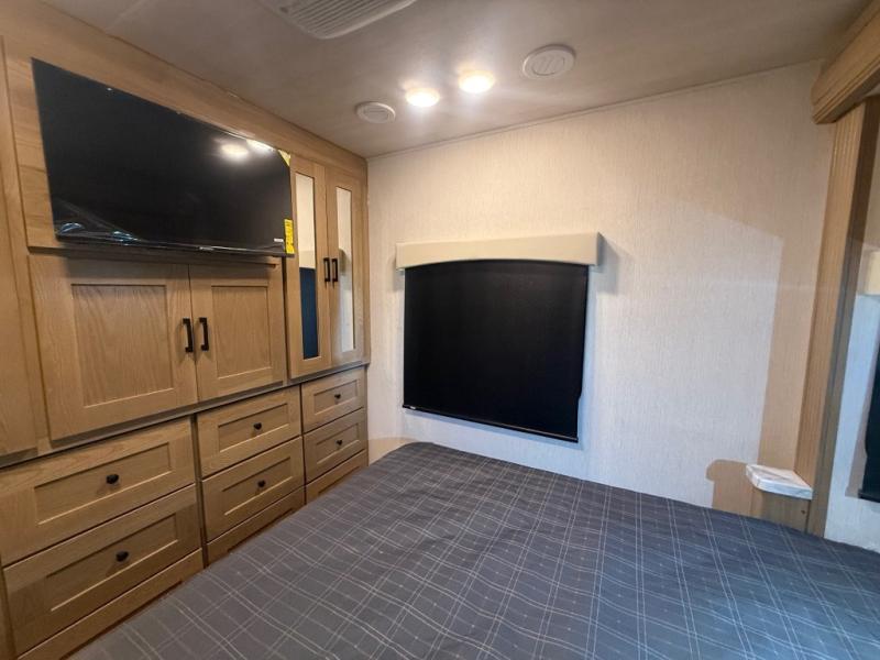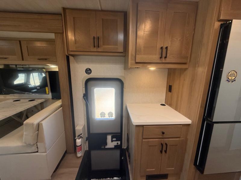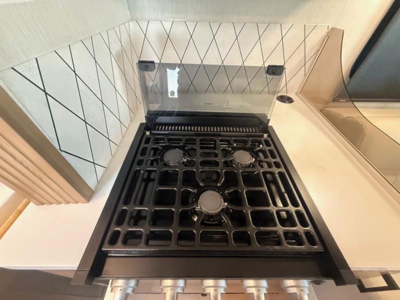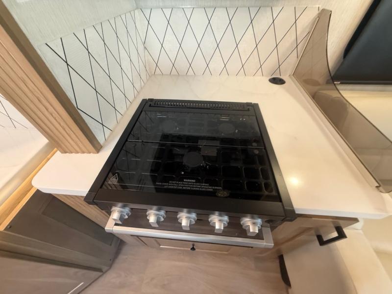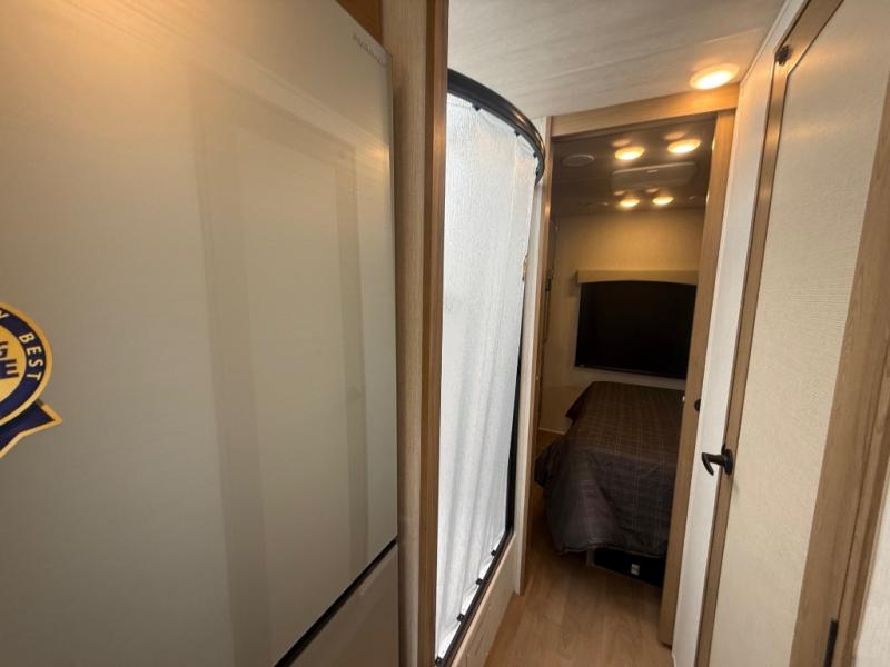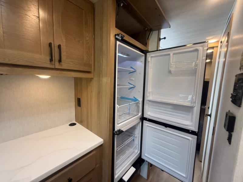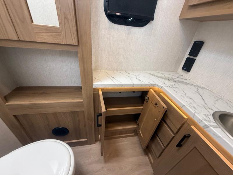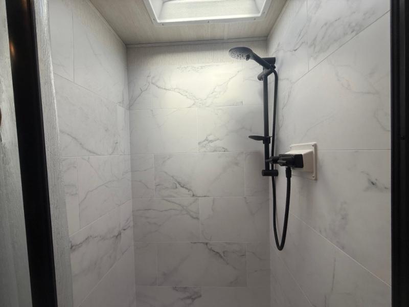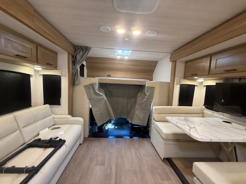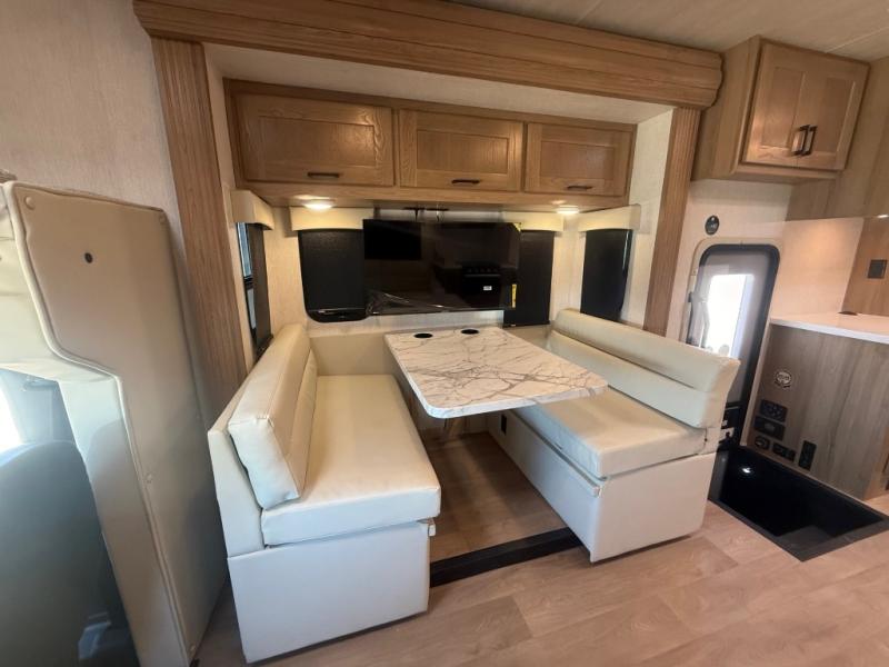 The interior living space is nice and open with three slides in this motorhome! There are plenty of sleeping spaces between the bunk over cab with an optional entertainment center to add, the queen bed slide in the rear private bedroom, and the deluxe tri-fold sofa. You could even transform the booth dinette into an extra sleeping space if needed. Speaking of cooking, prepare your best meals with three burner cooktop and over-the-range stainless steel microwave, and cold drinks can be stored in the 10 cu. ft. 12V refrigerator. The split-style bathroom allows one person to clean up in the radius shower while another uses the private toilet and sink!