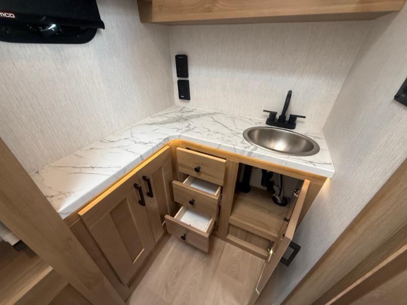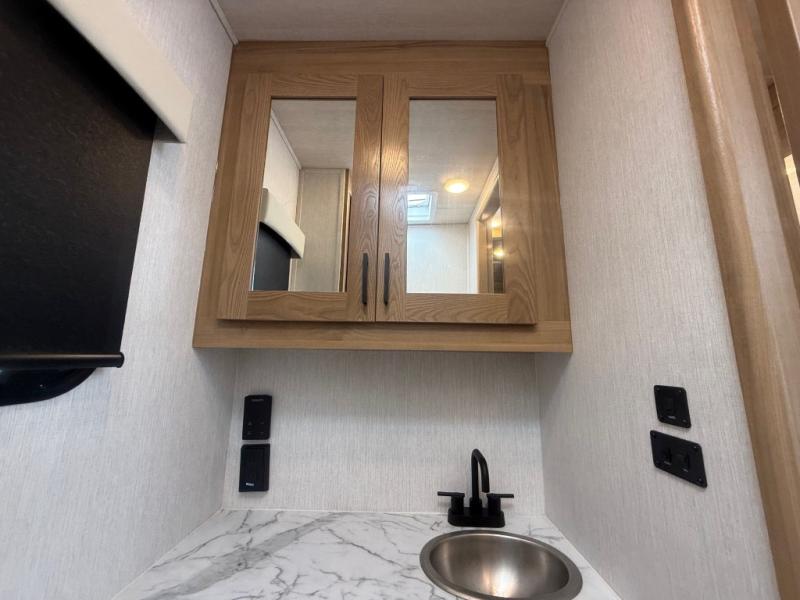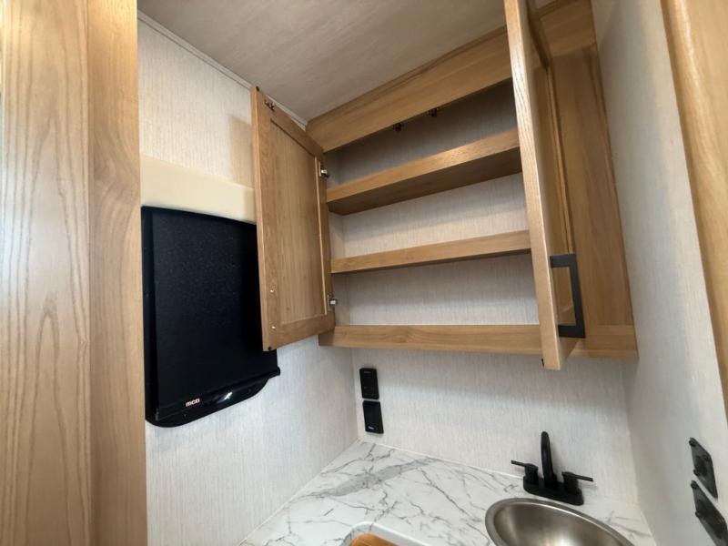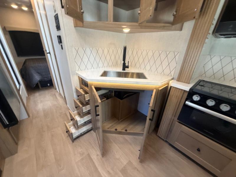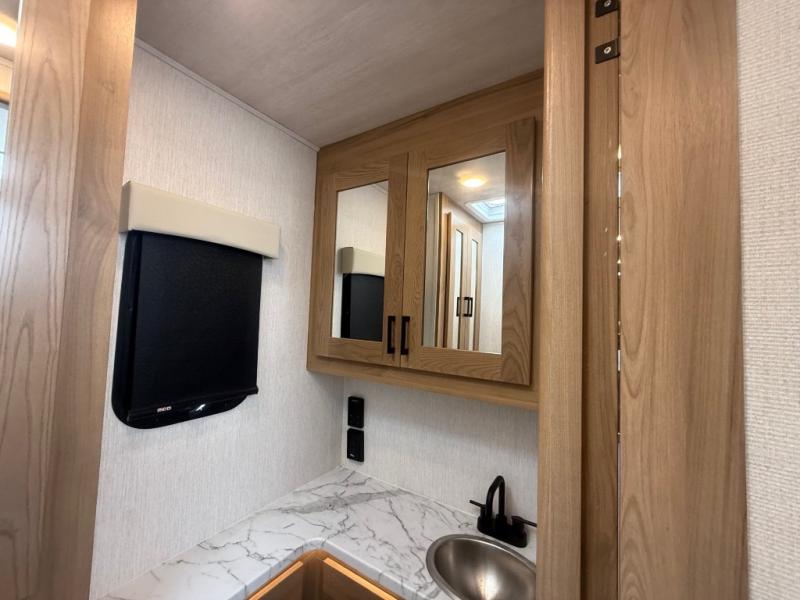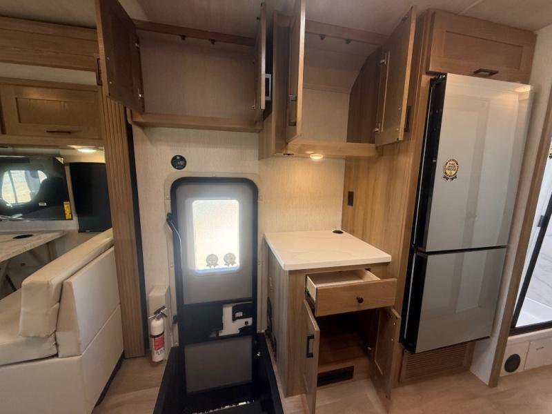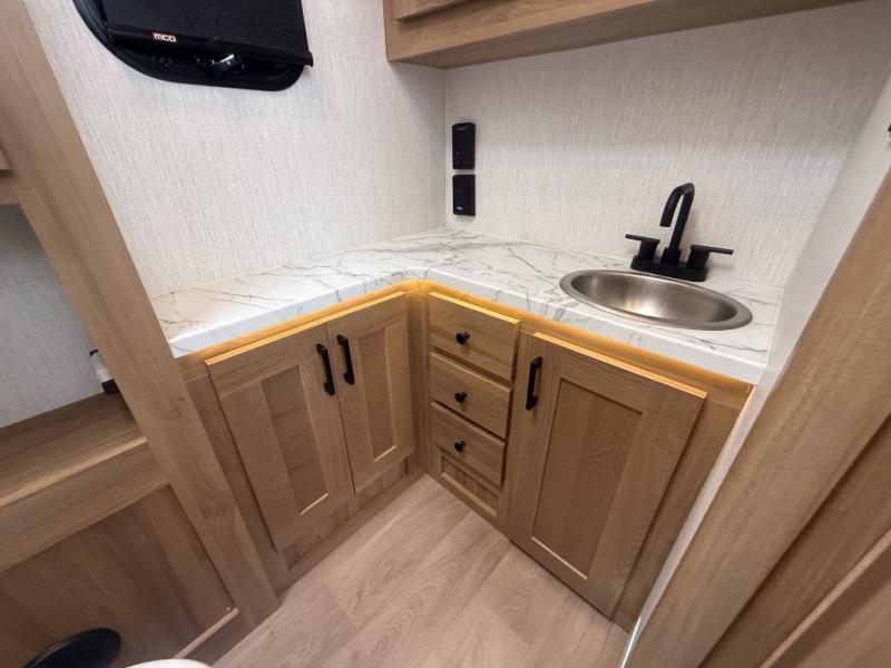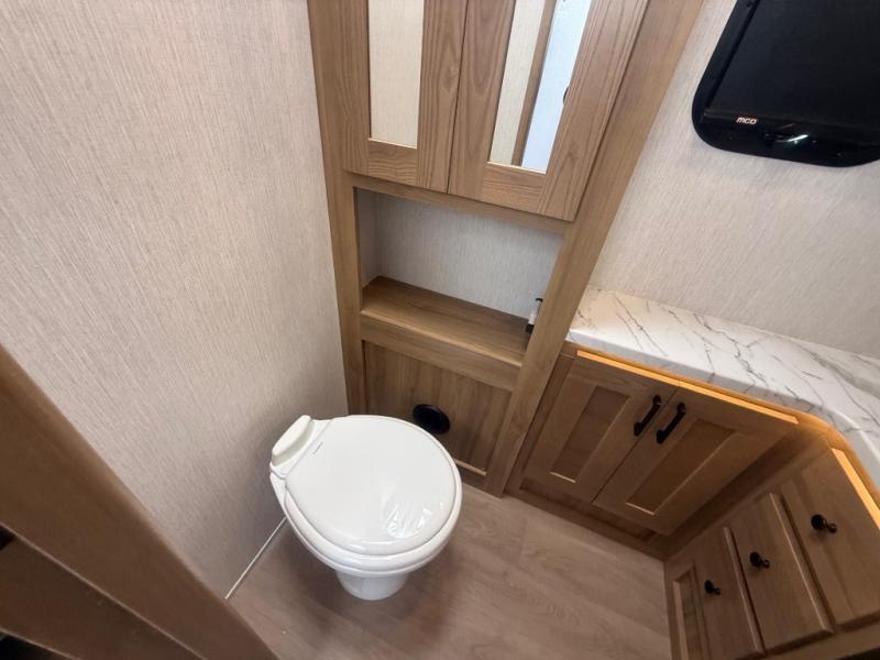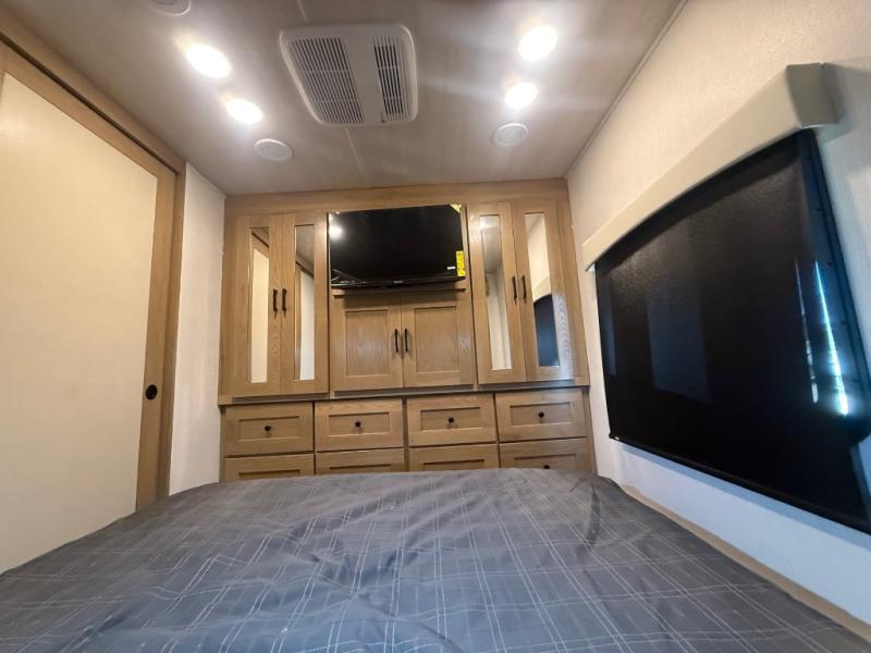 The interior living space is nice and open with three slides in this motorhome! There are plenty of sleeping spaces between the bunk over cab with an optional entertainment center to add, the queen bed slide in the rear private bedroom, and the deluxe tri-fold sofa. You could even transform the booth dinette into an extra sleeping space if needed. Speaking of cooking, prepare your best meals with three burner cooktop and over-the-range stainless steel microwave, and cold drinks can be stored in the 10 cu. ft. 12V refrigerator. The split-style bathroom allows one person to clean up in the radius shower while another uses the private toilet and sink!