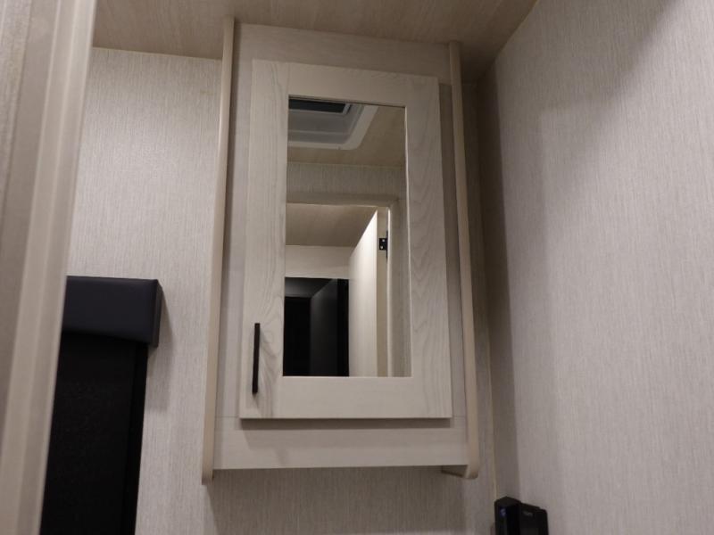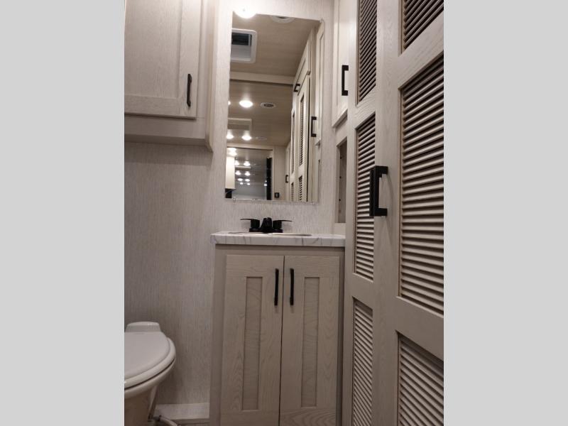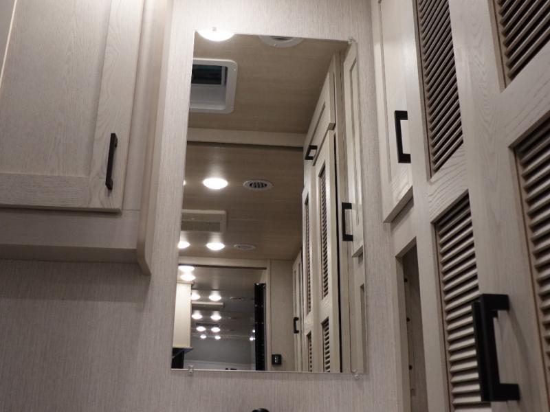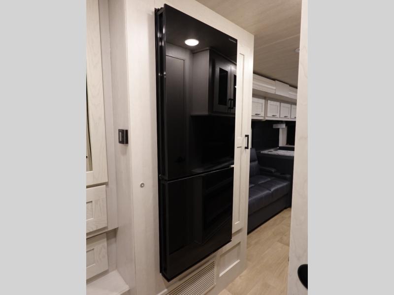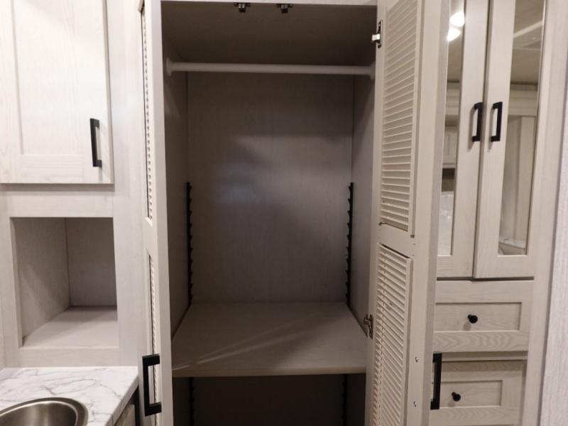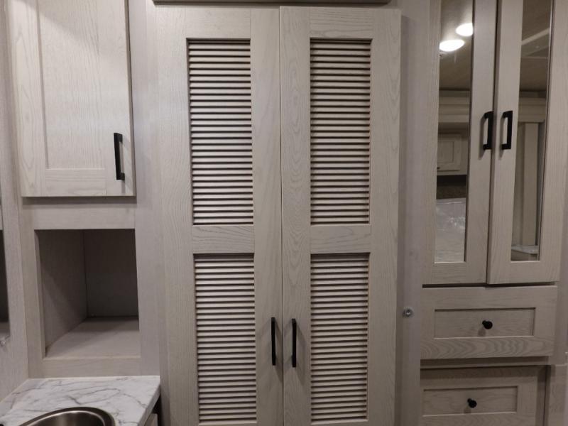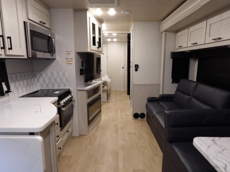 If you plan to travel with friends and family, this coach will be perfect for you! There is a full rear bath which makes a master bedroom you are sure to love, and the mid-coach half bath is perfect for guests! You will sleep soundly each night on the king bed slide out, and the wardrobe will help keep your space tidy. Sleeping space for guests can be found on the sofa and booth dinette within the second slide out, as well as on the cab over bunk! There is also a fully-equipped kitchen complete with a three burner cooktop and stainless steel microwave, plus a 10 cu. ft. 12V refrigerator.
