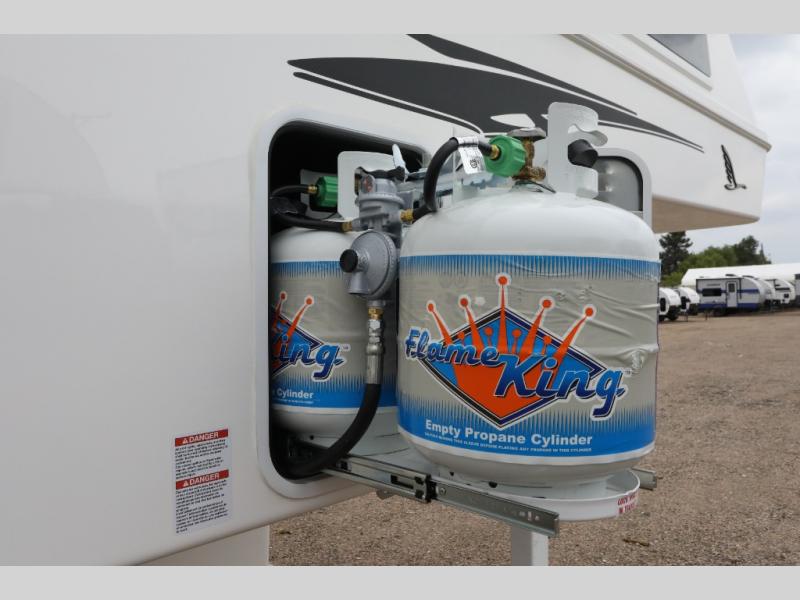 Enjoy a home on top of your long bed truck with this truck camper! Start each morning feeling recharged after sleeping on the front queen bed while your electronics recharge at the 12V USB charging stations. Fill your bellies with fried bacon and eggs cooked on the three burner stove with oven and drink a cold glass of orange juice stored in the 6.3 cu. ft. three way refrigerator. Plus, you can eat your meals at the face-to-face dinette and transform into an extra sleeping space. You can even freshen up each morning in the dry bath with extra room, a divider that separates the shower from the toilet, and a built-in shower seat. There is plenty of storage throughout with closets and overhead cabinets too!
