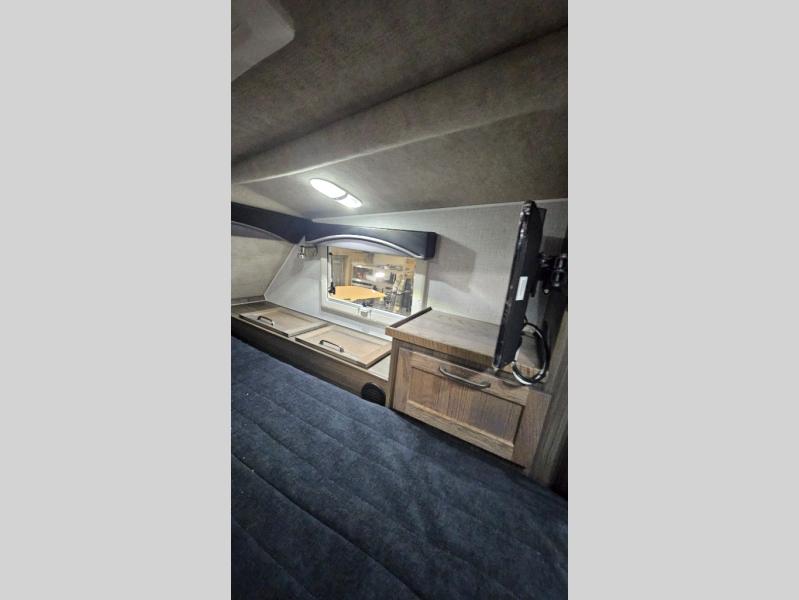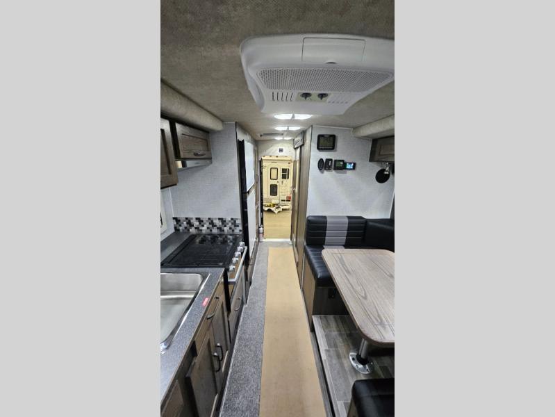 Enjoy a home on top of your long bed truck with this truck camper! Start each morning feeling recharged after sleeping on the front queen bed while your electronics recharge at the 12V USB charging stations. Fill your bellies with fried bacon and eggs cooked on the three burner stove with oven and drink a cold glass of orange juice stored in the 8 cu. ft. 12 volt refrigerator. Plus, you can eat your meals at the U shaped dinette and transform into an extra sleeping space. You can even freshen up each morning in the dry bath with extra room, a divider that separates the shower from the toilet, and a built-in shower seat. There is plenty of storage throughout with closets and overhead cabinets too! An optional 600AH lithium power system and optional Truma Combi furnace/hot water system can be added on this model for even more comfort and convenience!
