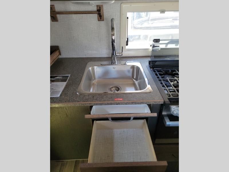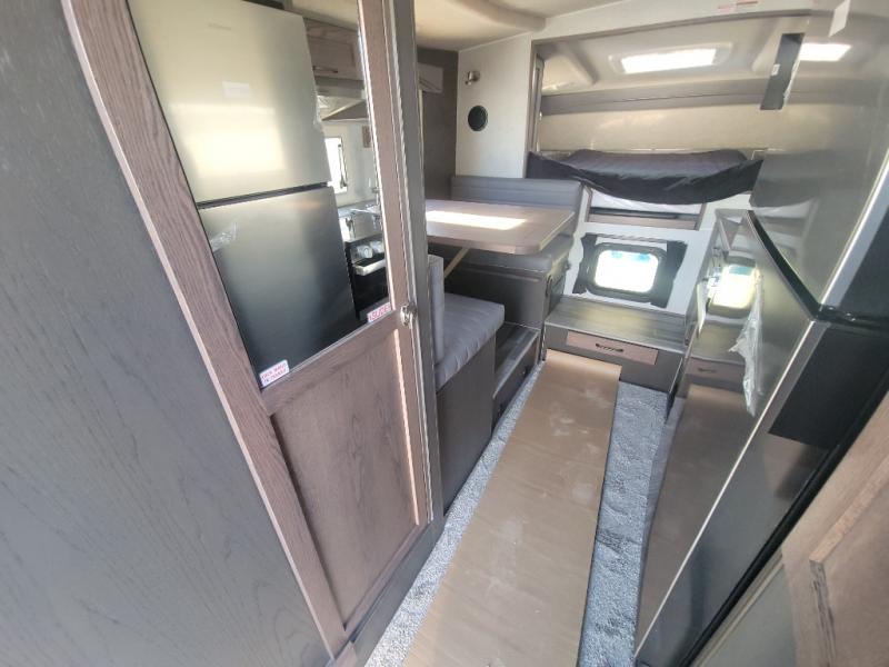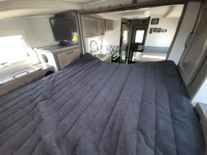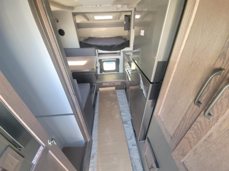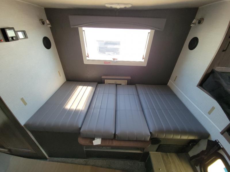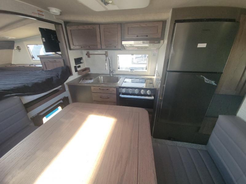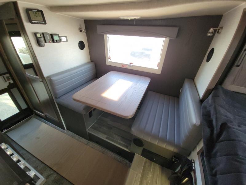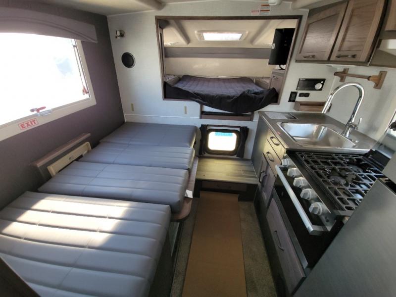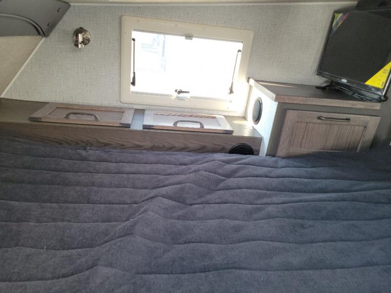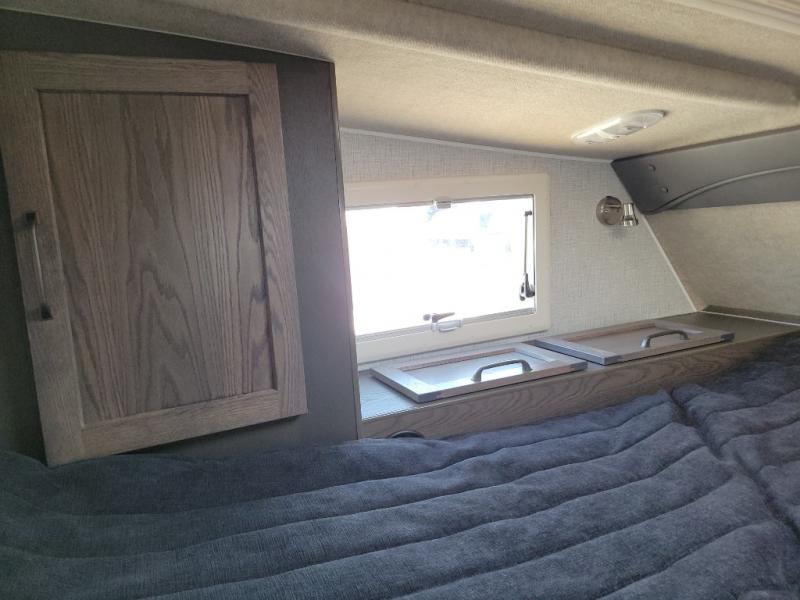 This truck camper is perfect for your long bed truck! Start each morning feeling recharged after sleeping on the front queen bed while your electronics recharge at the 12V USB charging stations. Fill your bellies with fried bacon and eggs cooked on the three burner stove with oven and drink a cold glass of orange juice stored in the 6.3 cu. ft. three way refrigerator. Plus, you can eat your meals at the face-to-face dinette and transform into an extra sleeping space. You can even freshen up each morning in the wet bath. There is plenty of storage throughout with closets and overhead cabinets too!