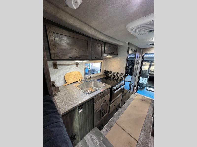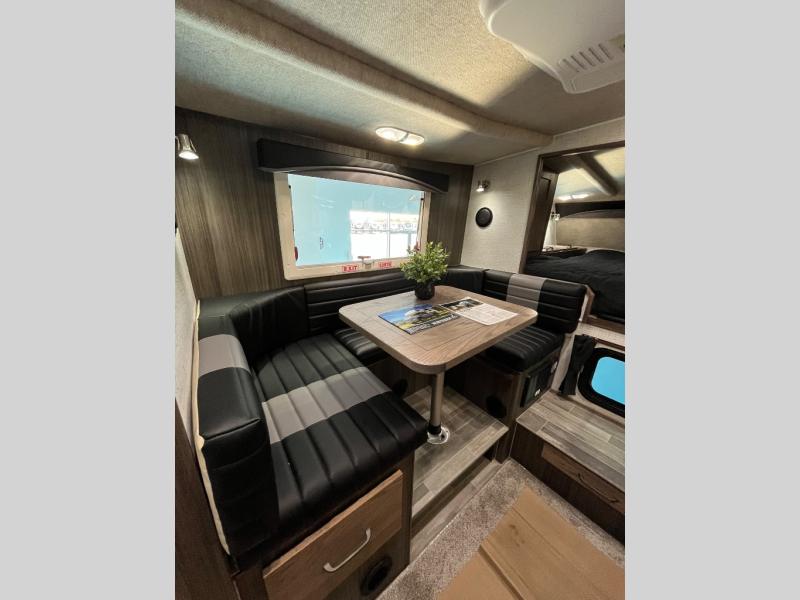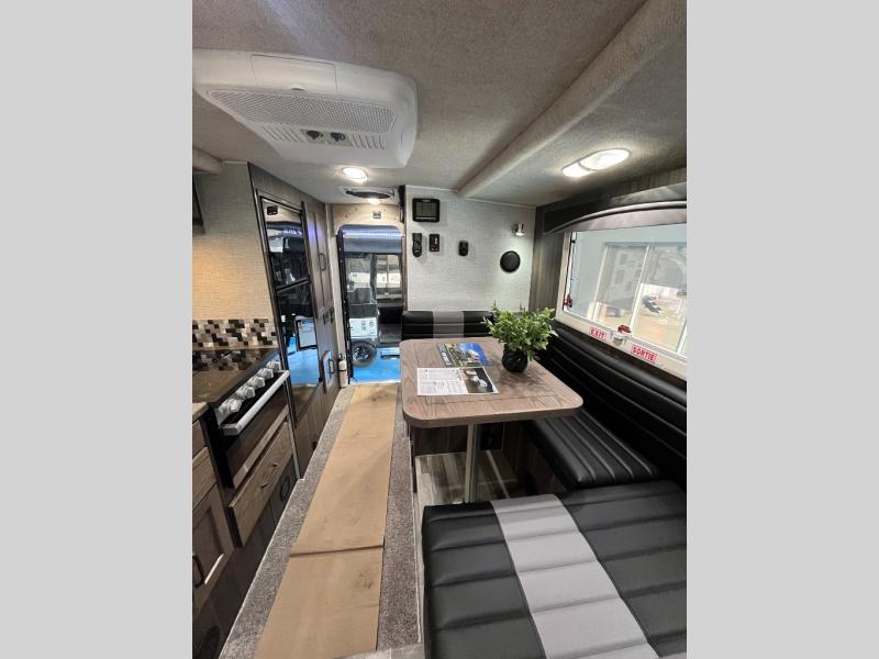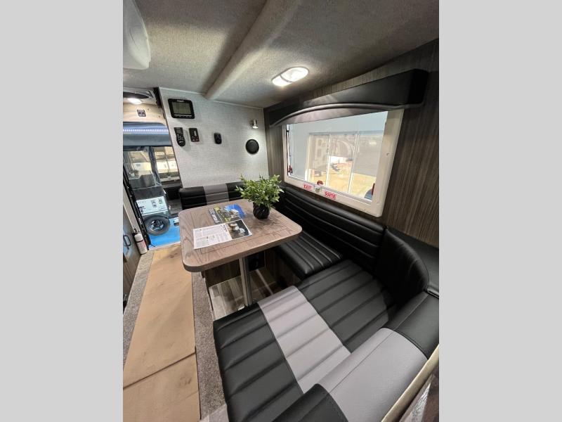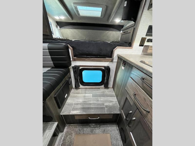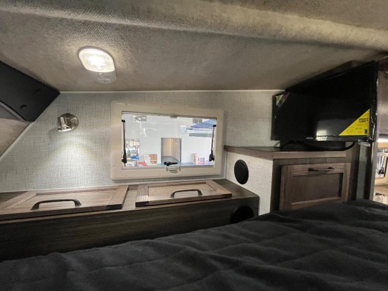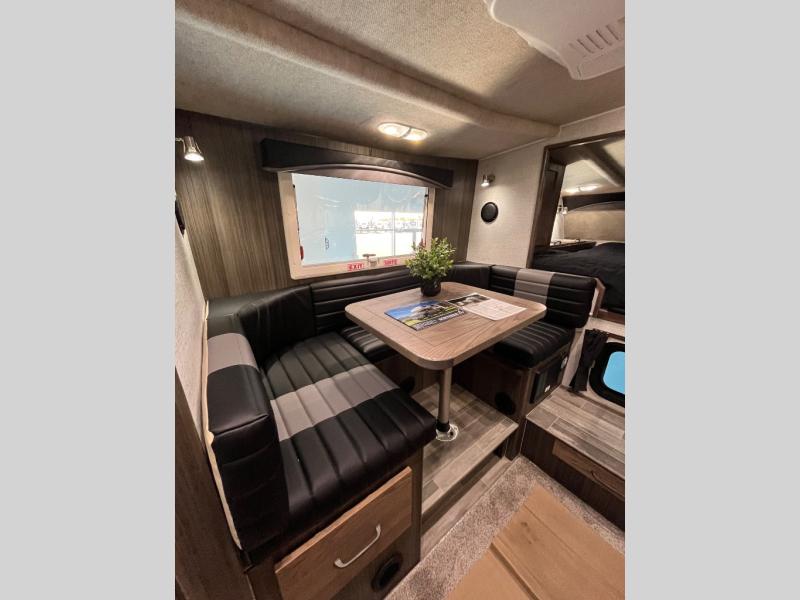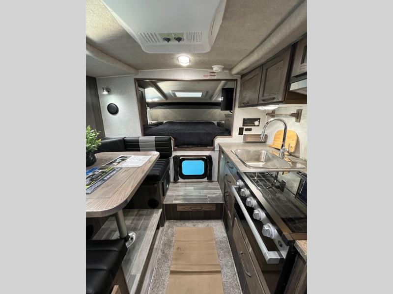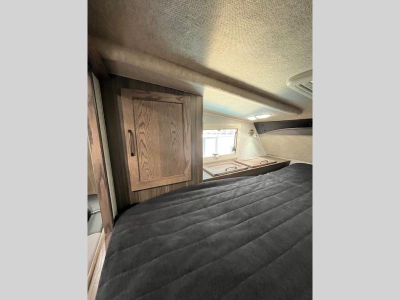 This truck camper is perfect for your long bed truck! Start each morning feeling recharged after sleeping on the front queen bed while your electronics recharge at the 12V USB charging stations. Fill your bellies with fried bacon and eggs cooked on the three burner stove with oven and drink a cold glass of orange juice stored in the 6.3 cu. ft. three way refrigerator. Plus, you can eat your meals at the face-to-face dinette and transform into an extra sleeping space. You can even freshen up each morning in the wet bath. There is plenty of storage throughout with closets and overhead cabinets too!