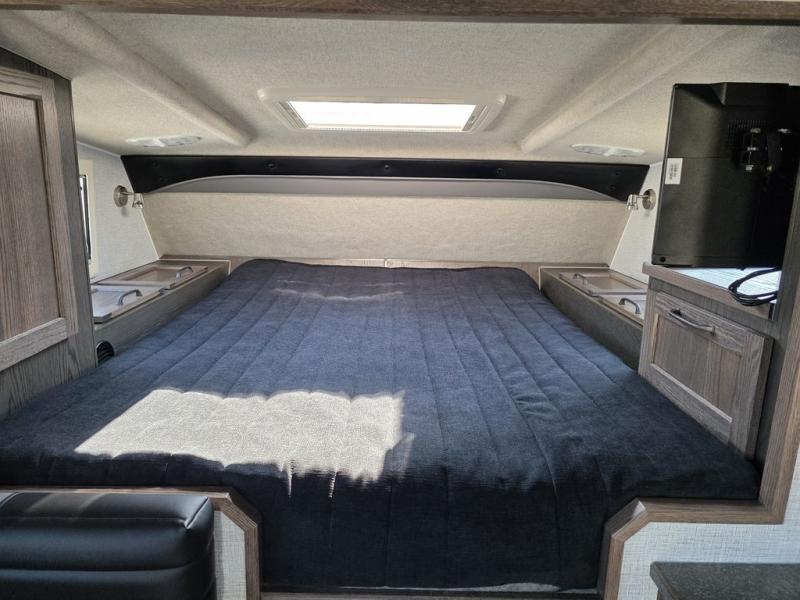 This truck camper is perfect for your long bed truck! Start each morning feeling recharged after sleeping on the front queen bed while your electronics recharge at the 12V USB charging stations. Fill your bellies with fried bacon and eggs cooked on the three burner stove with oven and drink a cold glass of orange juice stored in the 6.3 cu. ft. two way refrigerator. Plus, you can eat your meals at the face-to-face dinette and transform into an extra sleeping space. You can even freshen up each morning in the wet bath. An optional 600AH lithium power system and optional Truma Combi furnace/hot water system can be added on this model for even more comfort and convenience!